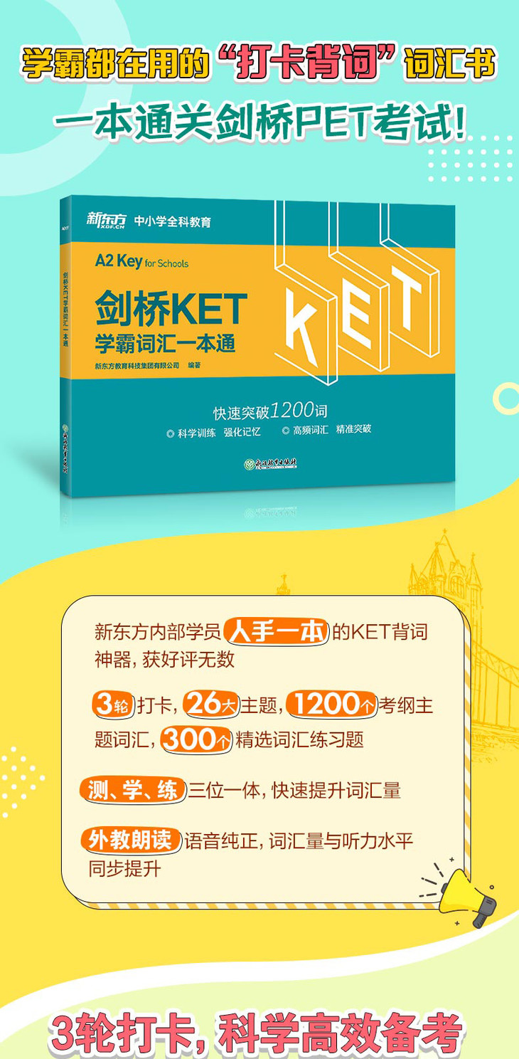 剑桥KET学霸词汇一本通 本系列图书为新东方YLE、KET、PET课堂用书,学练结合背单词,逐级突破考试必会词,配图辅助记忆,赠英式发音外教朗读音频。
