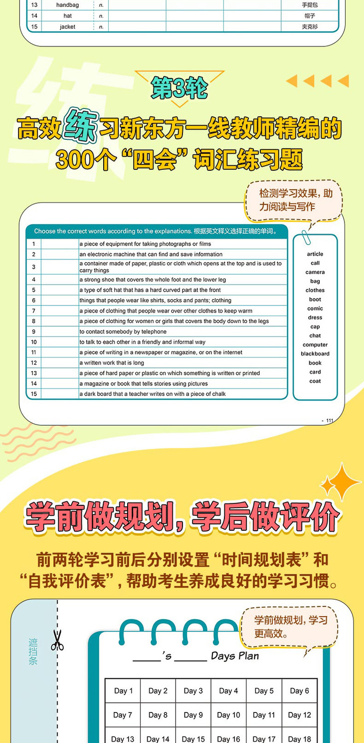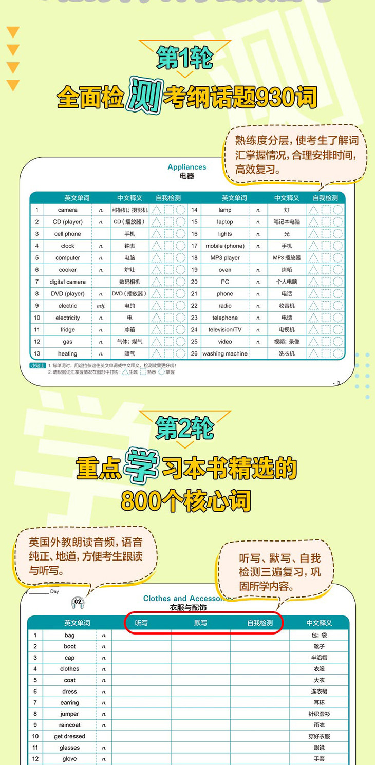 第二轮:词汇巩固。筛选800个核心词汇,确保完成听写、默写与自我检测三遍复习,帮助考生巩固所学内容。
