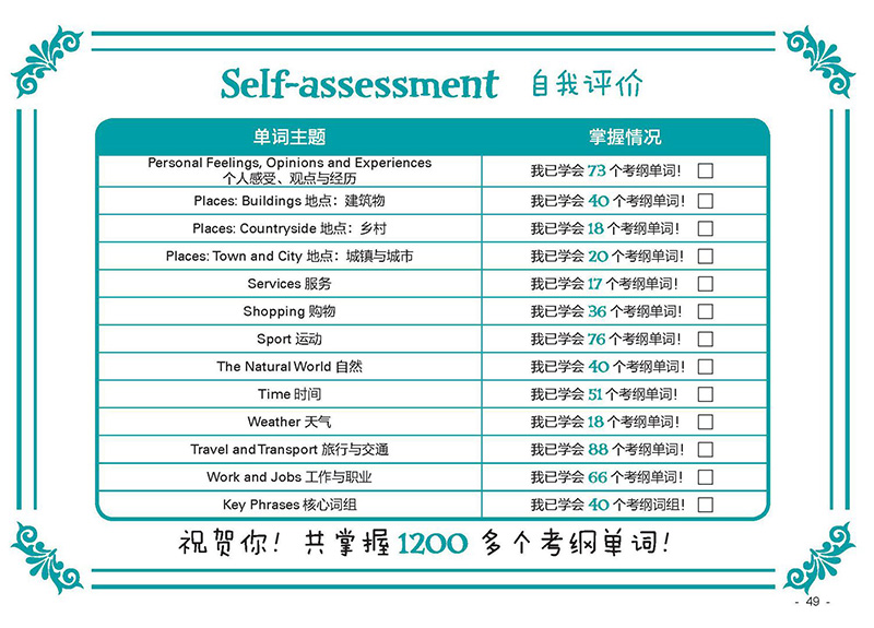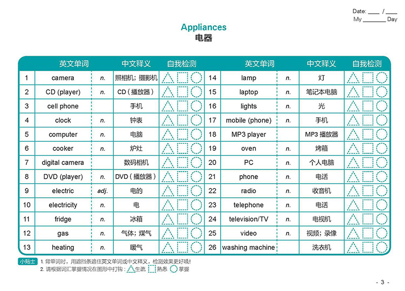 第*轮:词汇自检。针对考纲主题分类的1200个词汇设置“自我检测”,使考生了解自身的掌握情况,有针对性地查漏补缺。