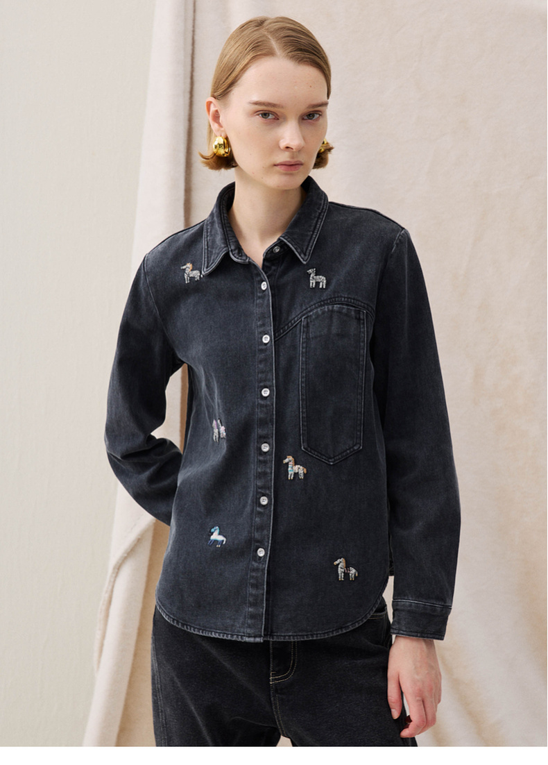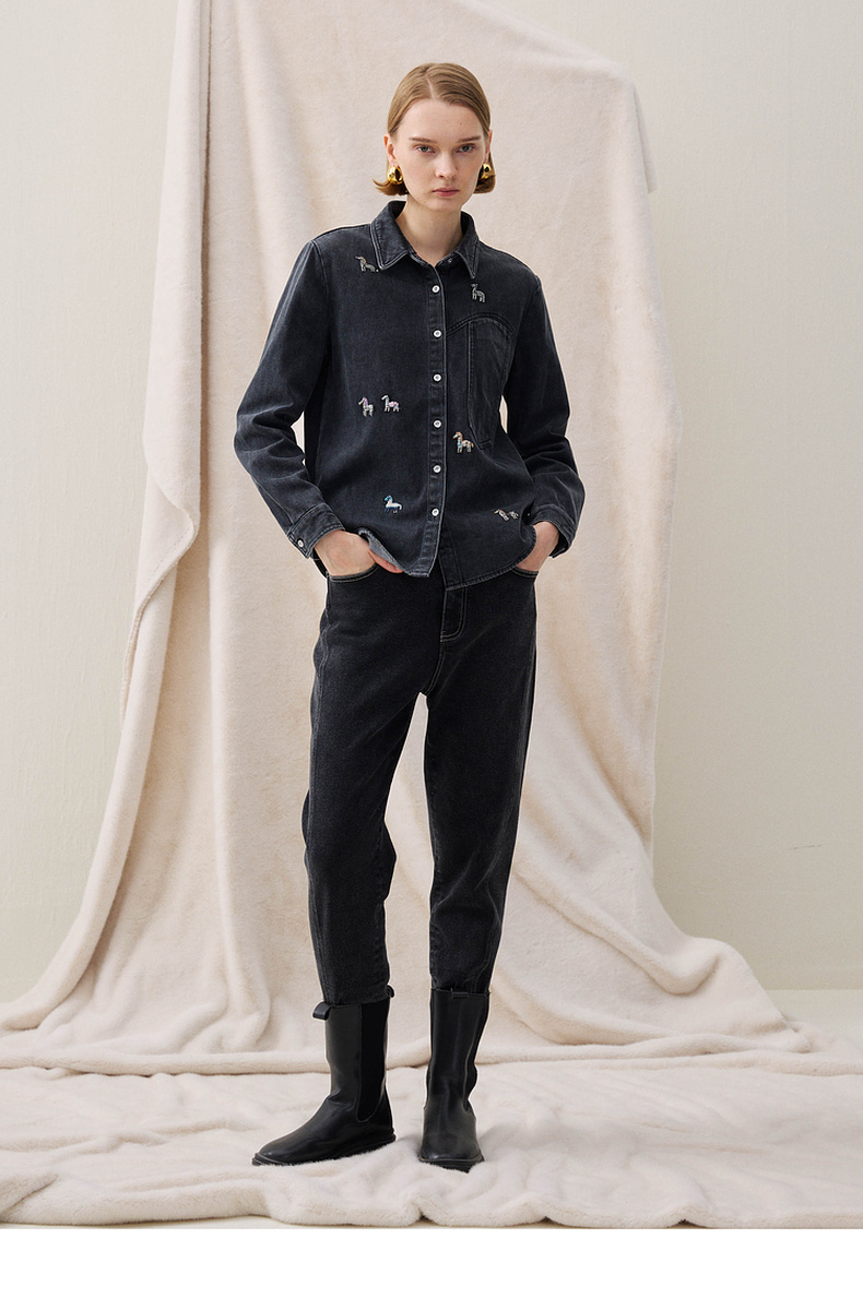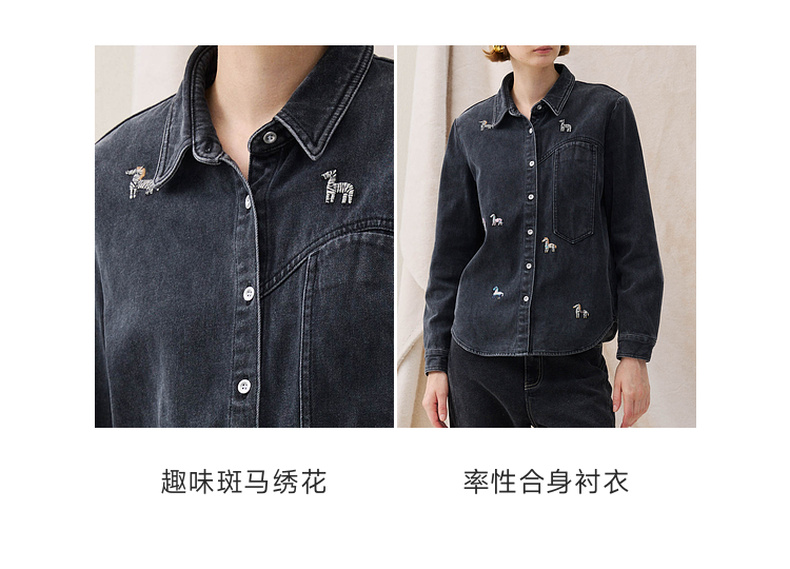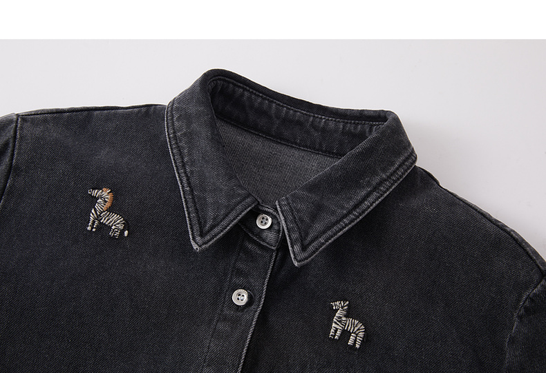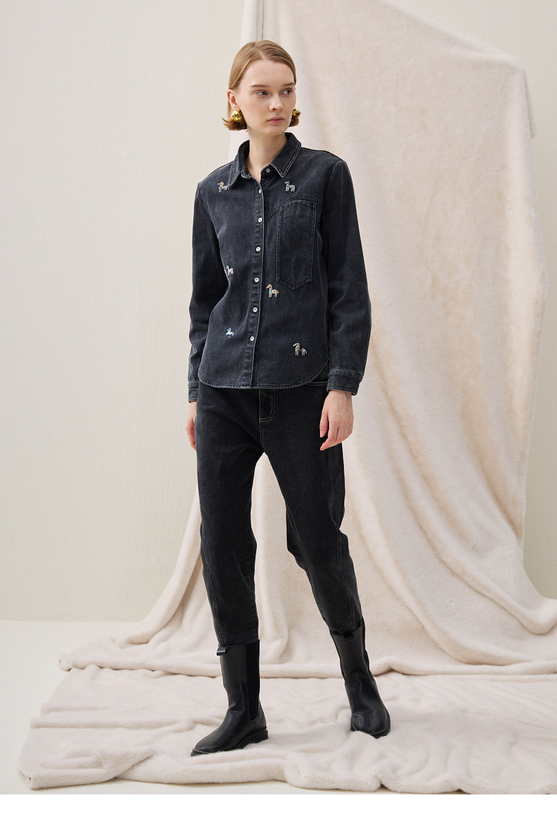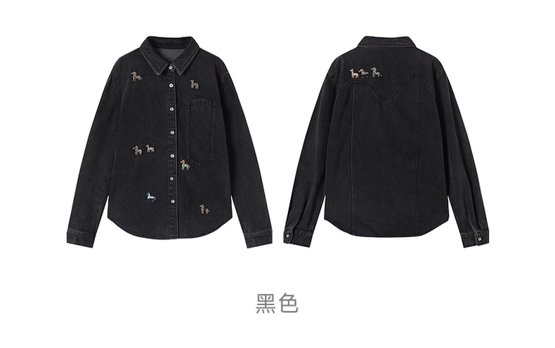 谜底黑色牛仔衬衣长袖2025冬季新品斑马绣花修身衬衫女254MC1719