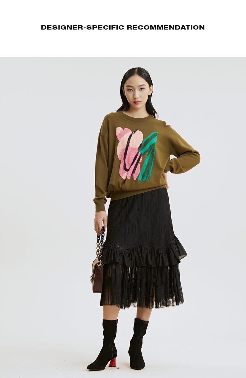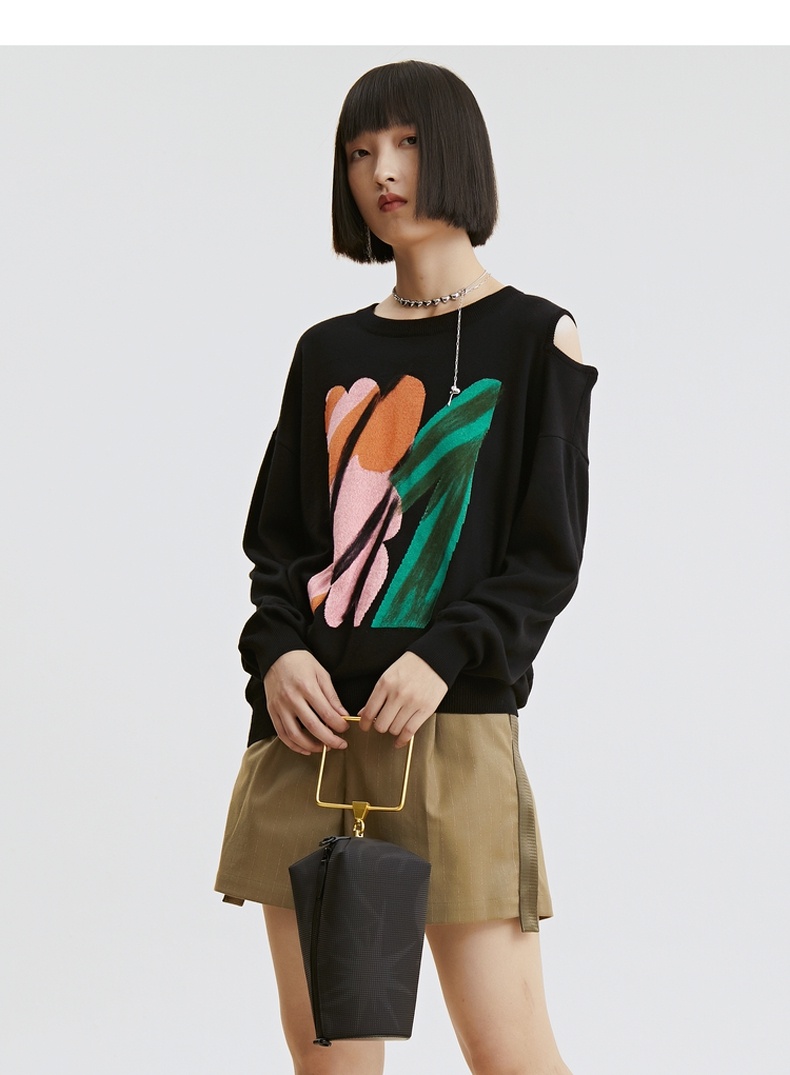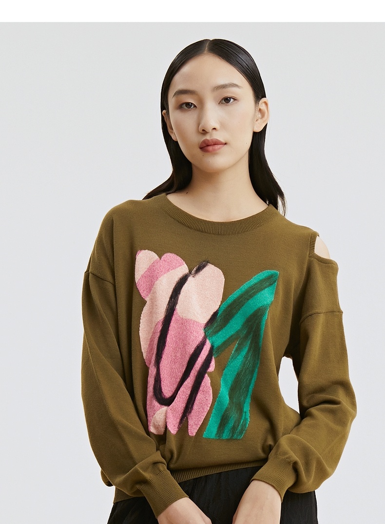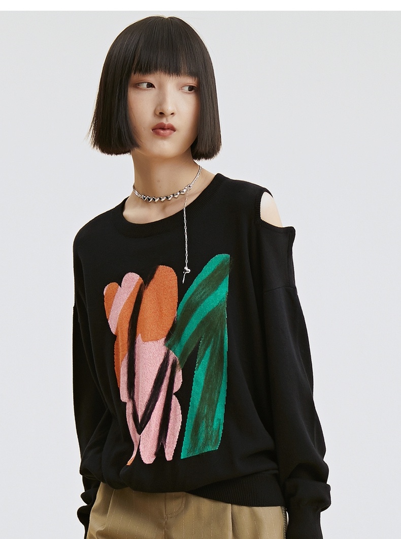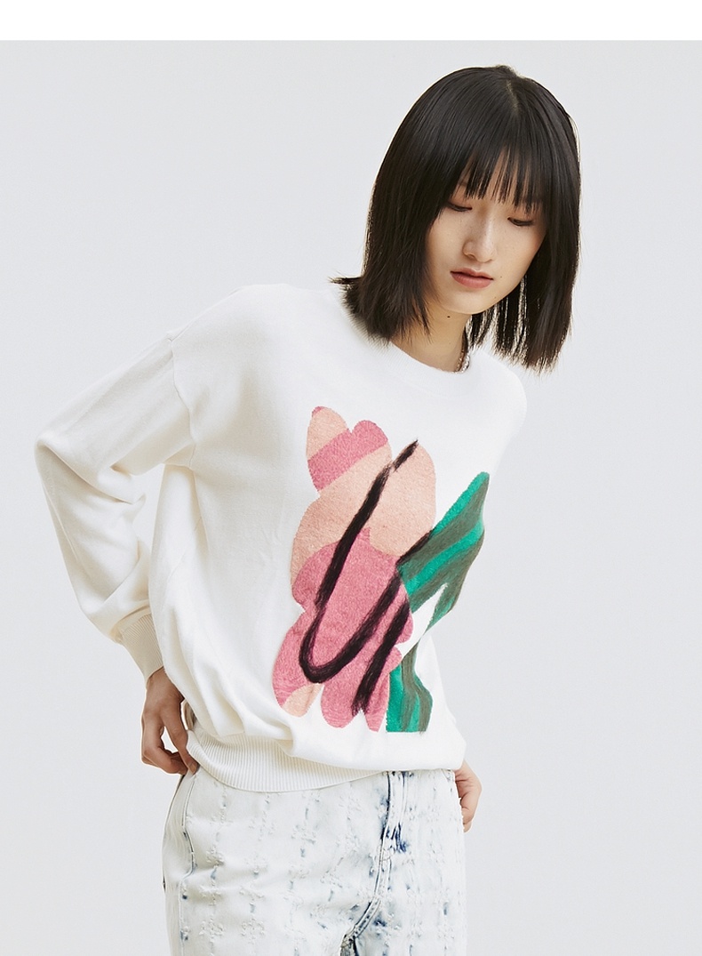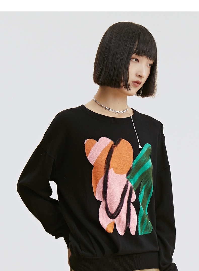 谜底长袖针织衫2021秋季新款涂鸦提花宽松圆领套头衫女213MZ2041