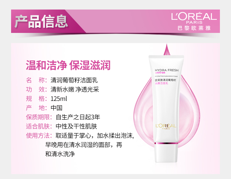 欧莱雅葡萄籽洁面乳洗面奶补水保湿深层清洁毛孔温和保湿洁面 125ml