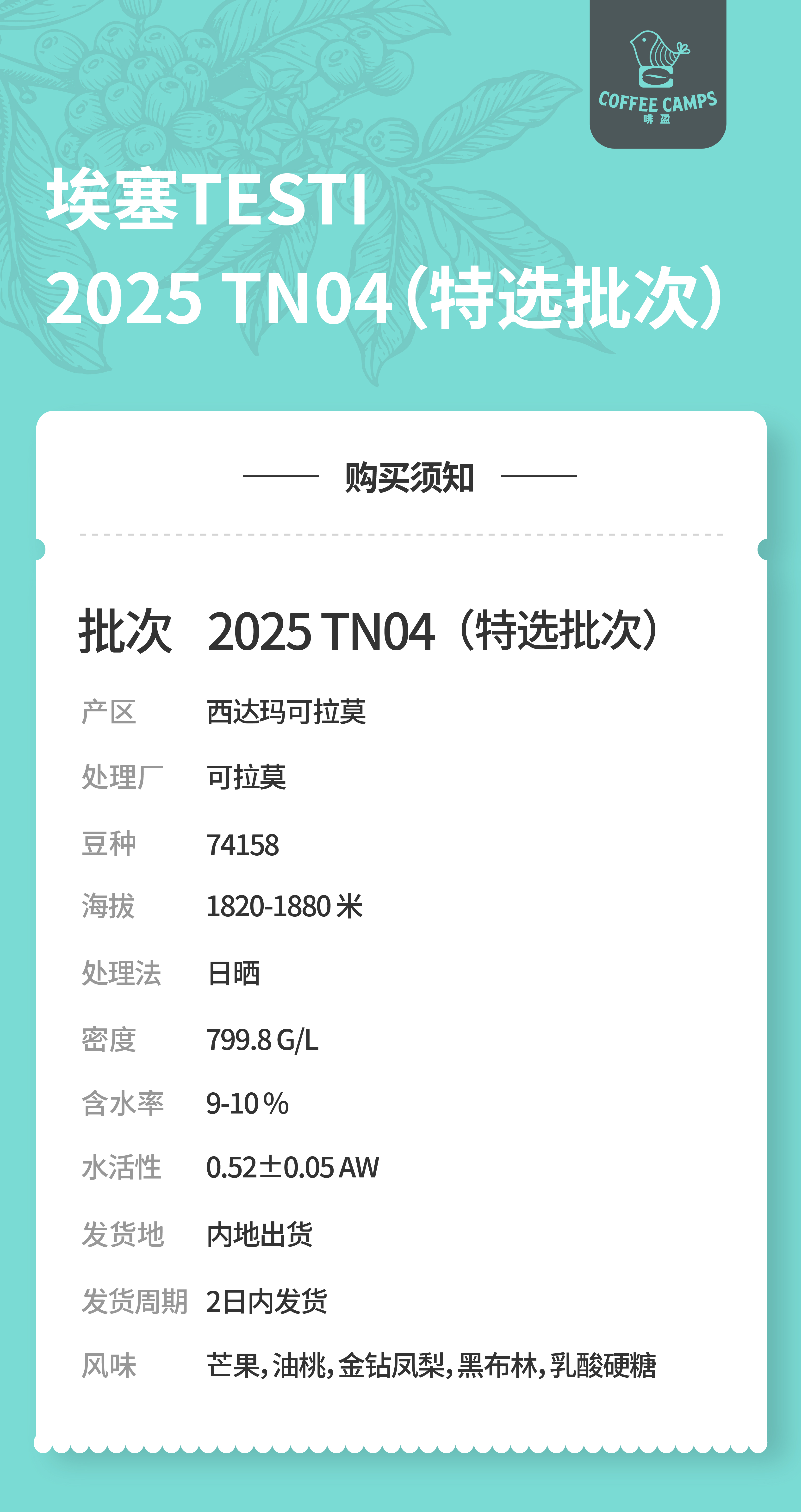 25产季 Testi特选批次 埃塞 特斯提 Testi TN04 日晒(生豆)空运批次