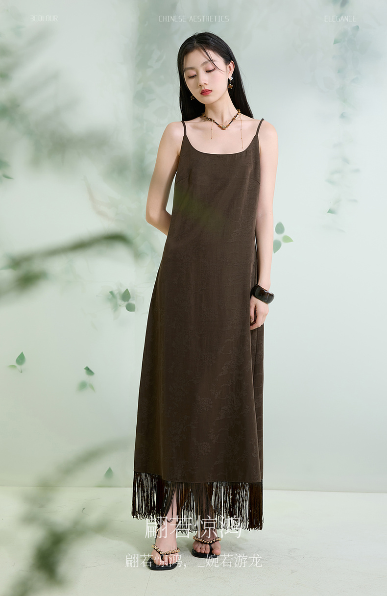 三彩【翩若惊鸿】2025夏季新款新中式吊带裙提花流苏直筒长裙C