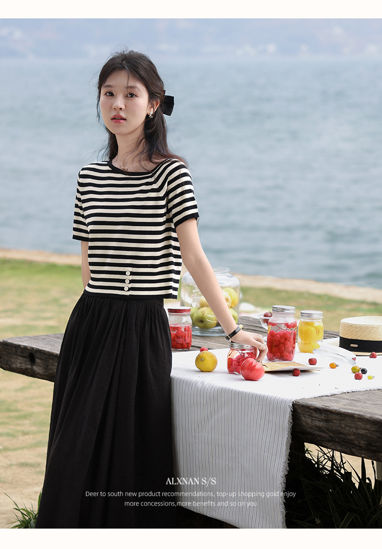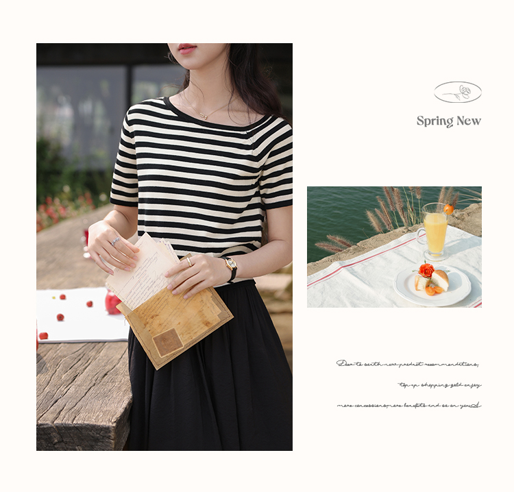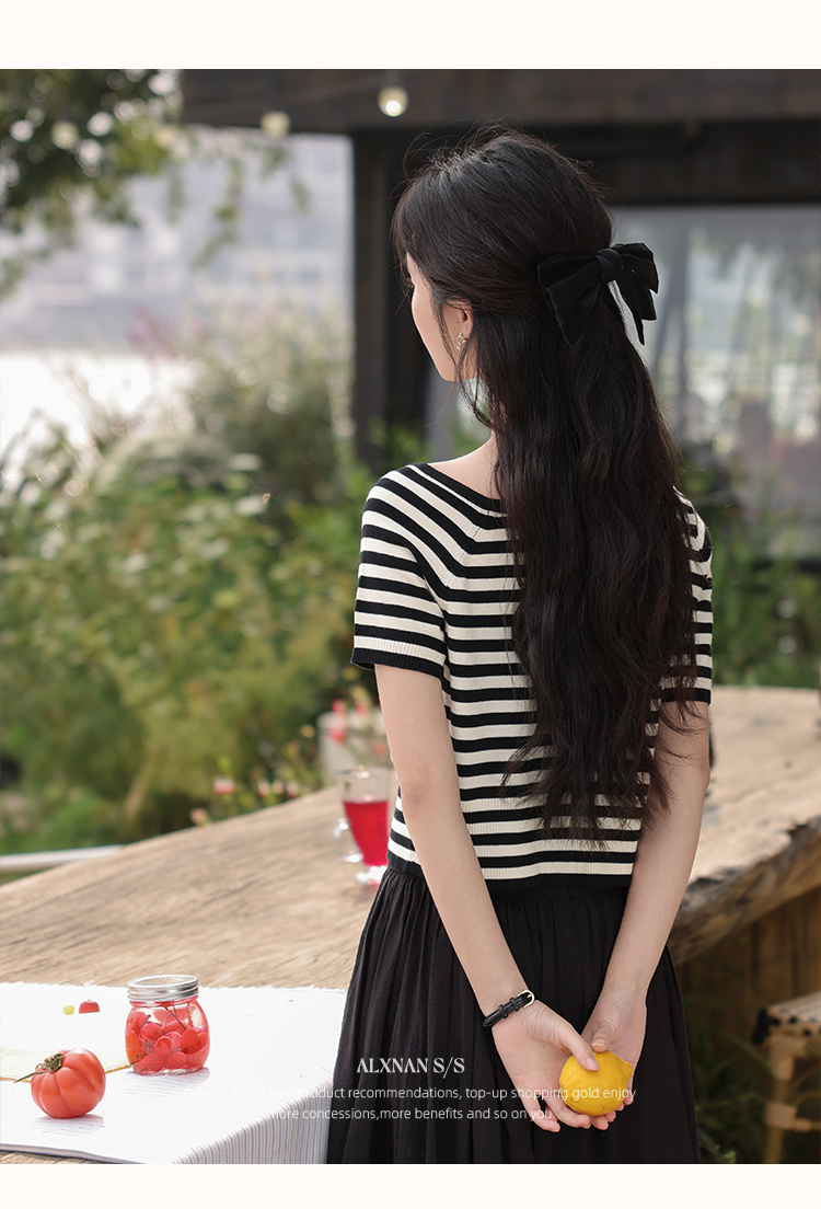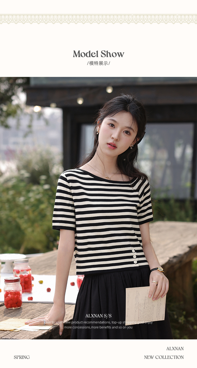 【6折秒杀】鹿向南 「提拉米苏」黑白条纹短袖针织衫T恤夏新款时尚通勤上衣女L55111