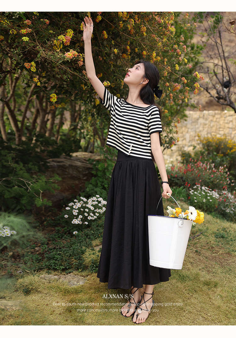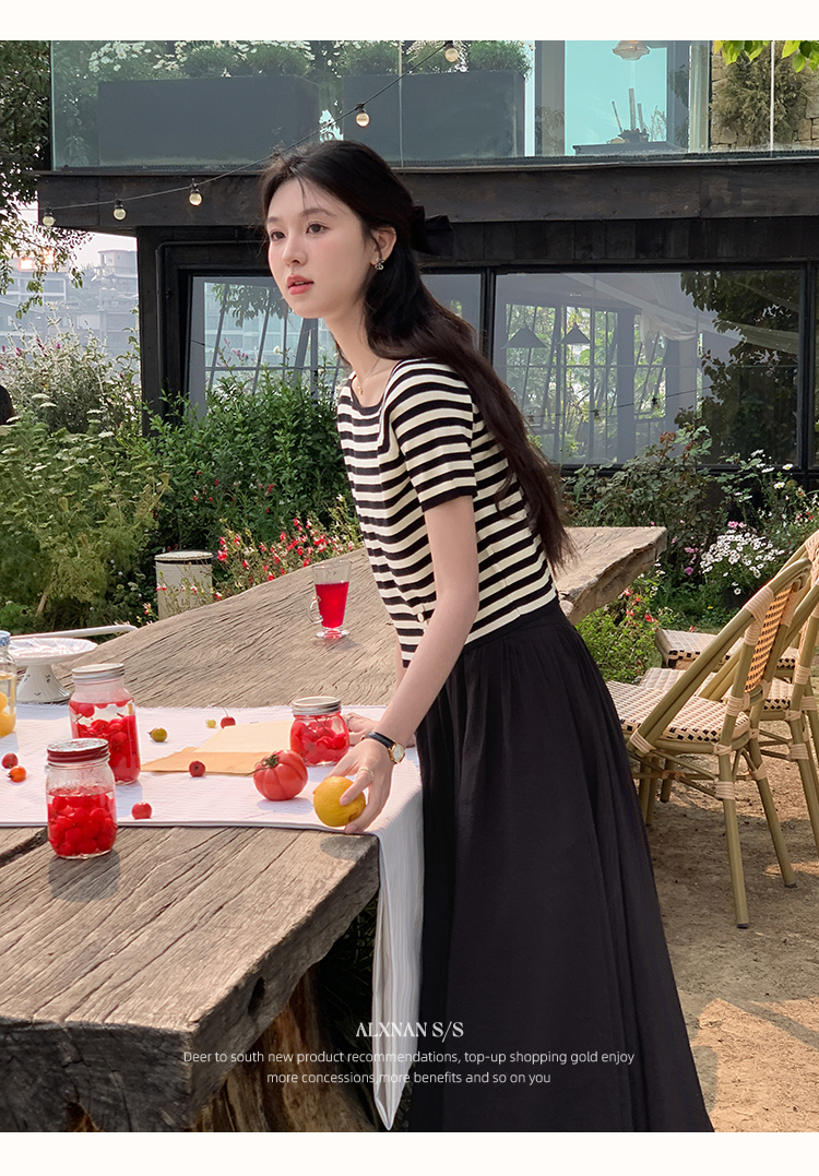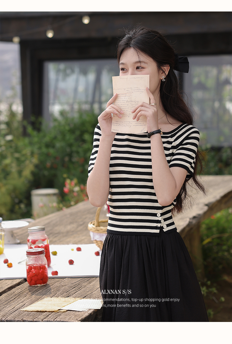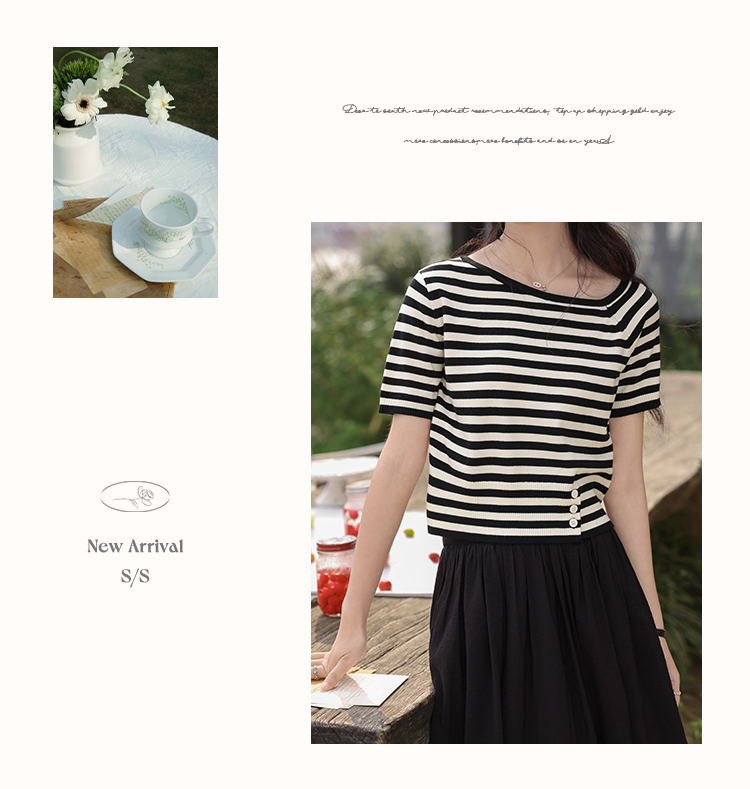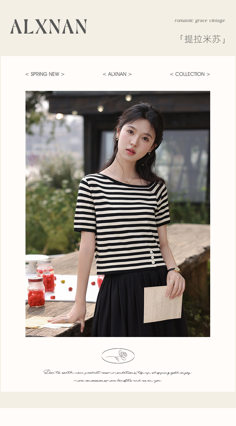【6折秒杀】鹿向南 「提拉米苏」黑白条纹短袖针织衫T恤夏新款时尚通勤上衣女L55111