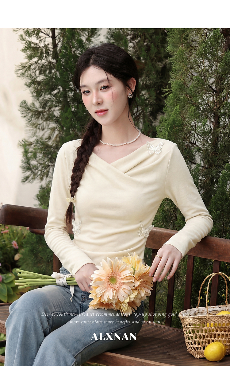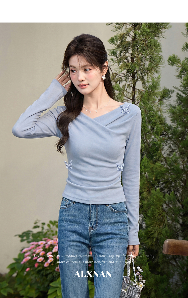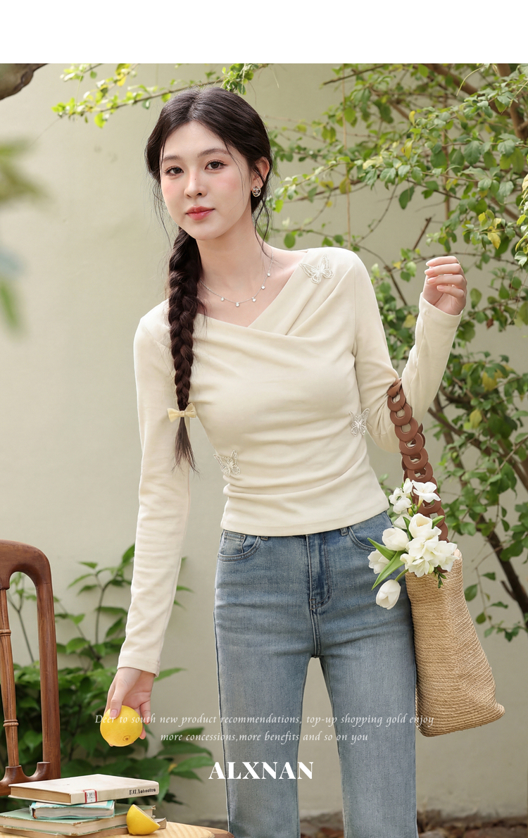 鹿向南「栀子浅吟」设计感V领修身T恤女2026夏季独特立体蝴蝶上衣