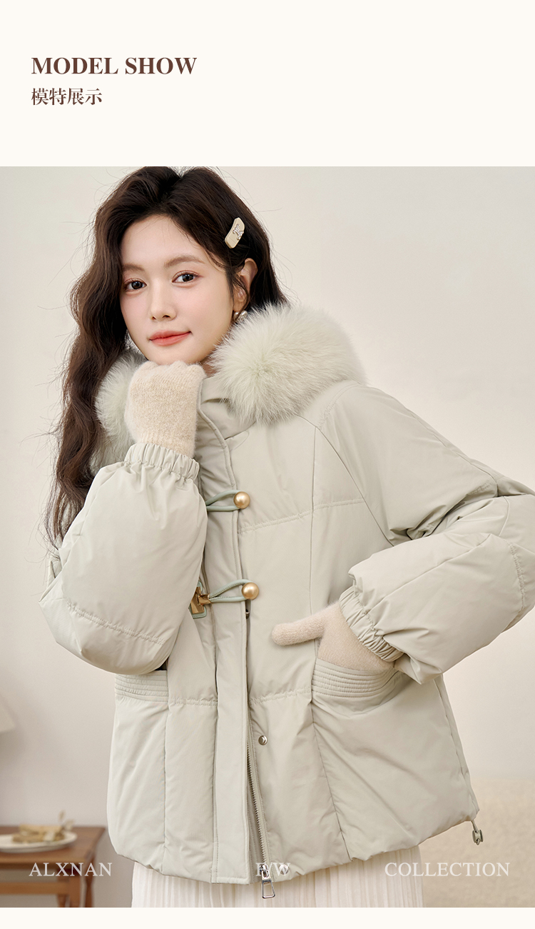 鹿向南「青松余雪」90白鸭绒真毛领羽绒服女冬季加厚连帽绿色外套