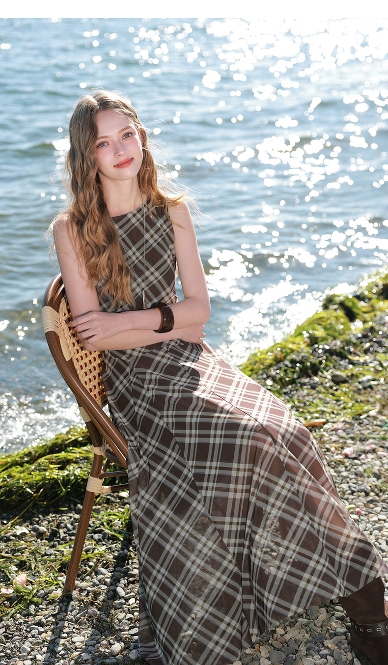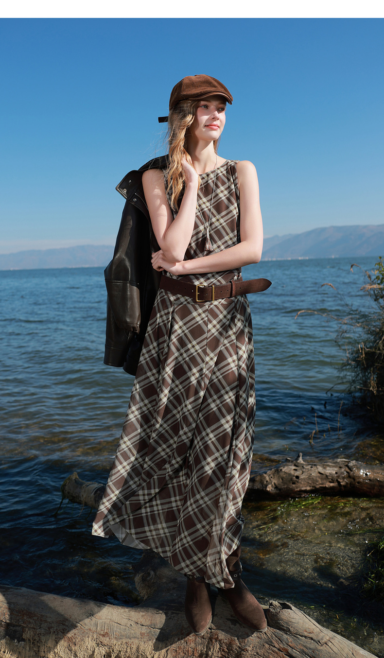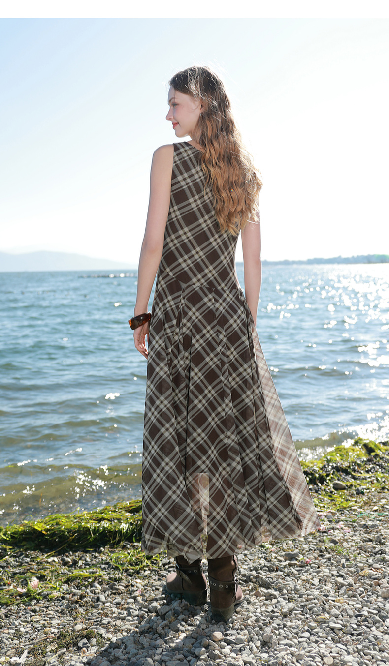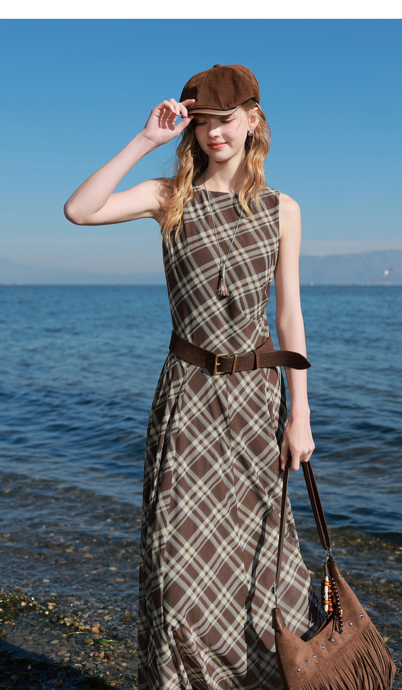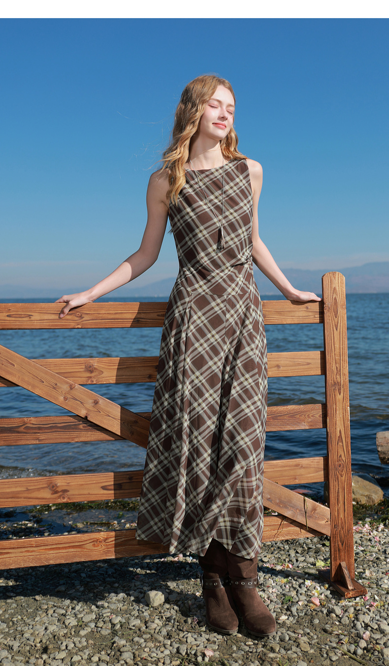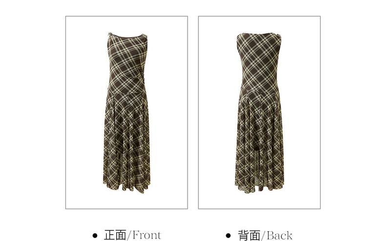 三彩2026春季新款一字领不规则格纹网纱裙无袖连衣裙A字长裙M