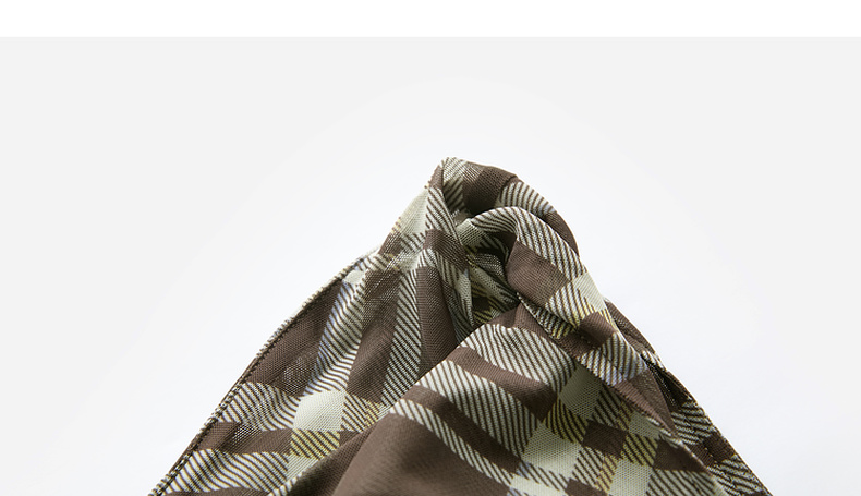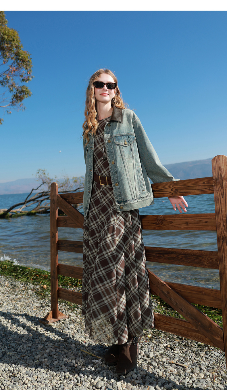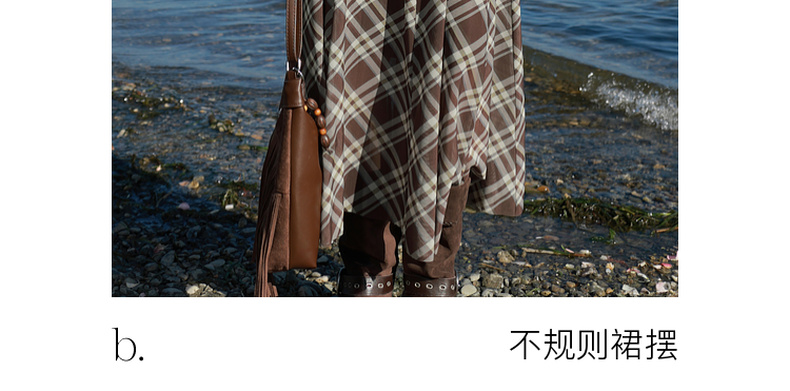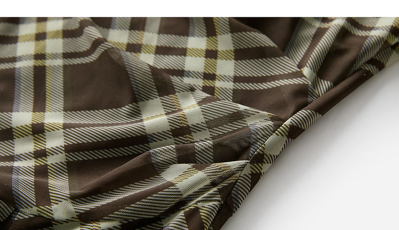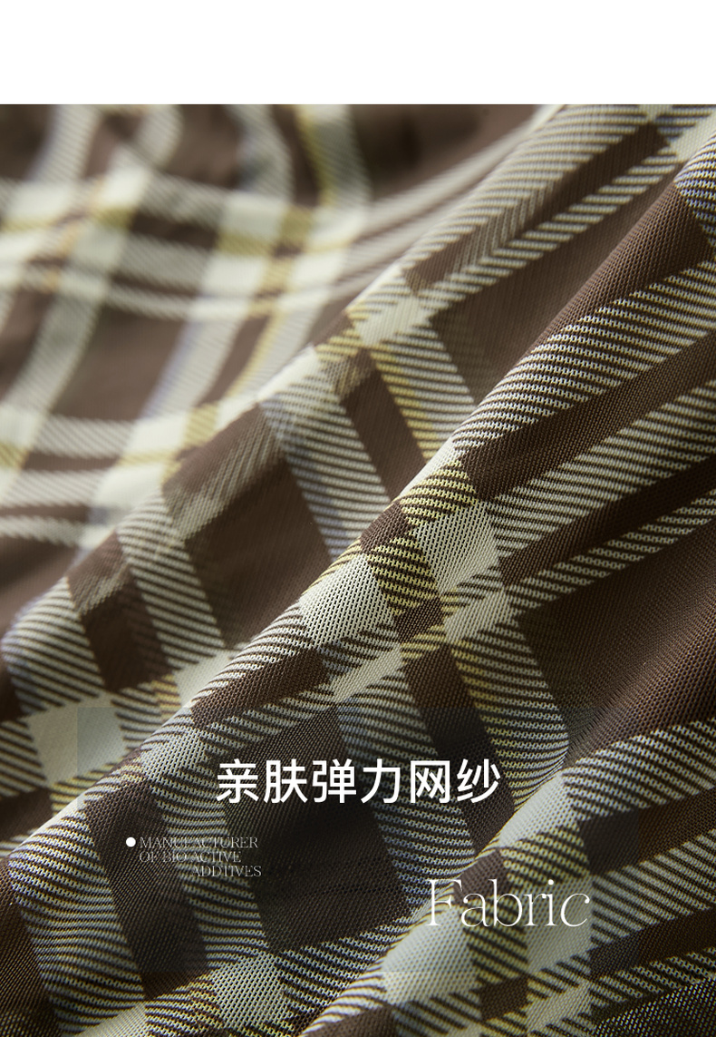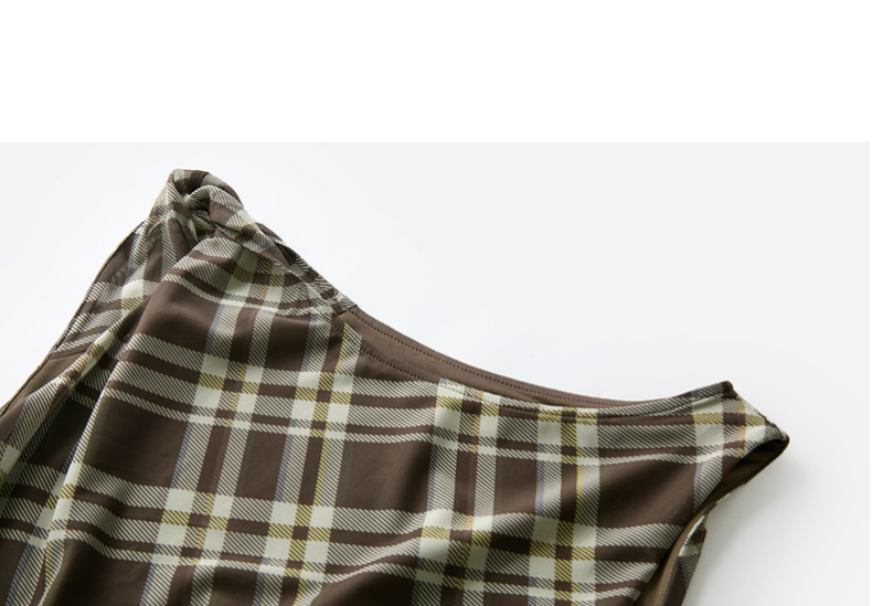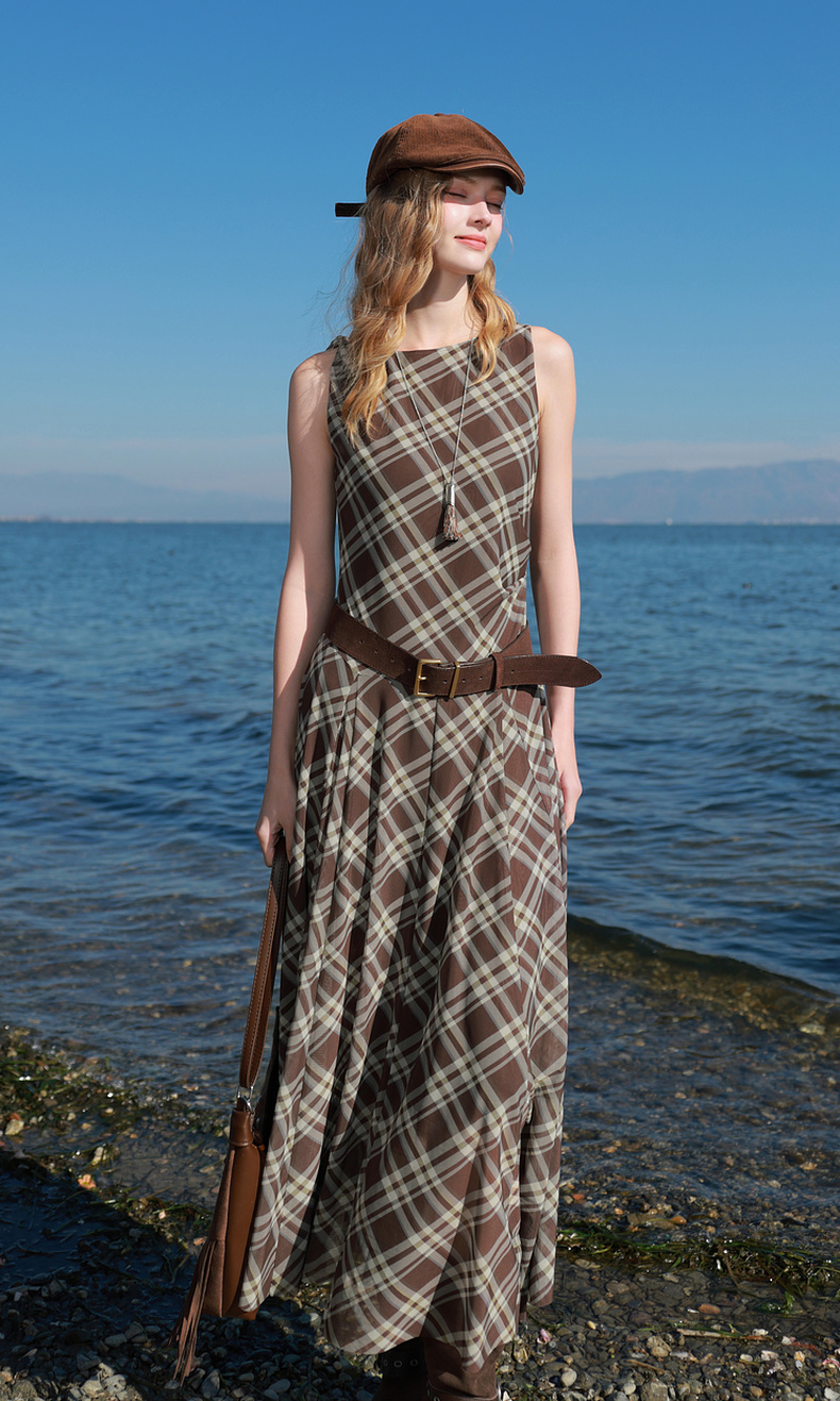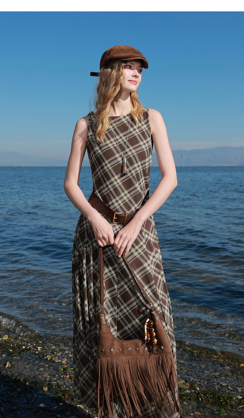 三彩2026春季新款一字领不规则格纹网纱裙无袖连衣裙A字长裙M