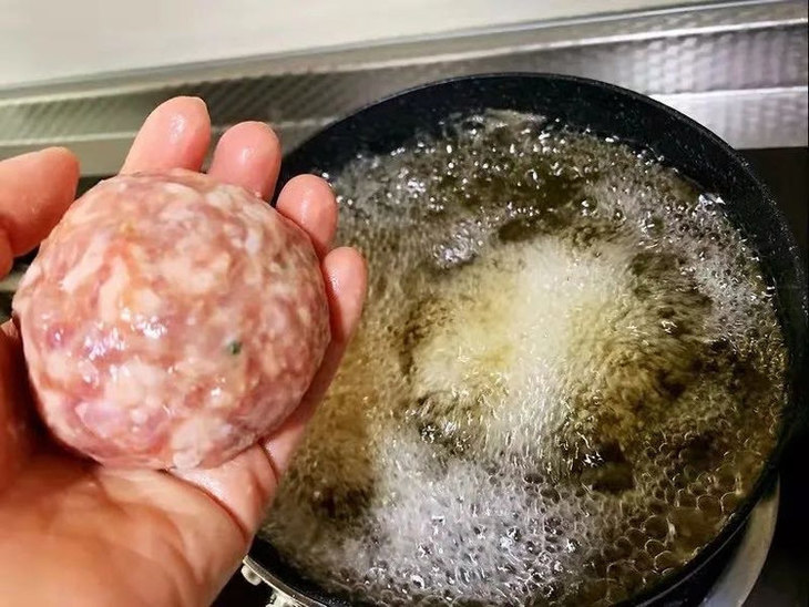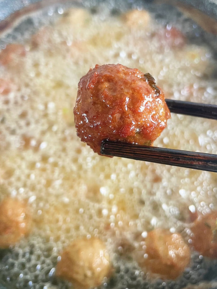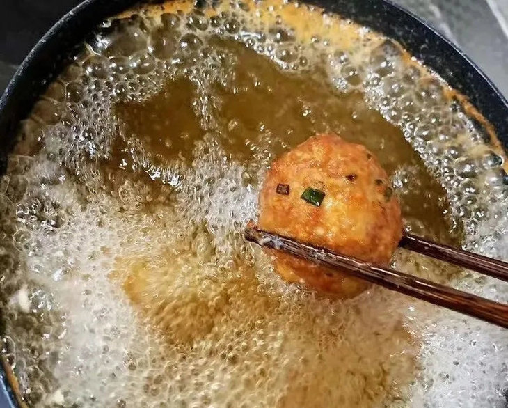 初炸定型,复炸上色,至此,金灿灿、油汪汪、圆滚滚的肉圆出锅了