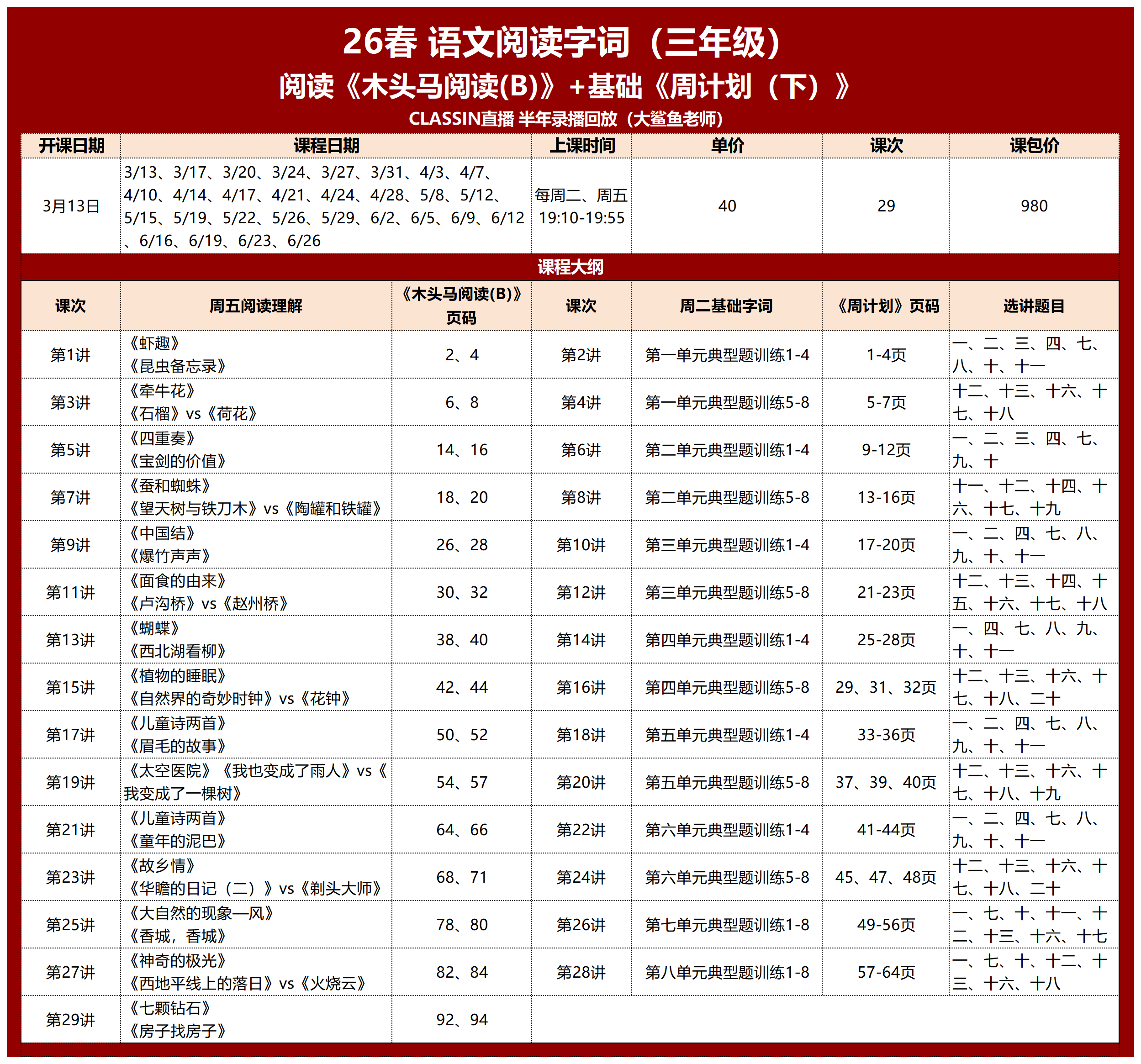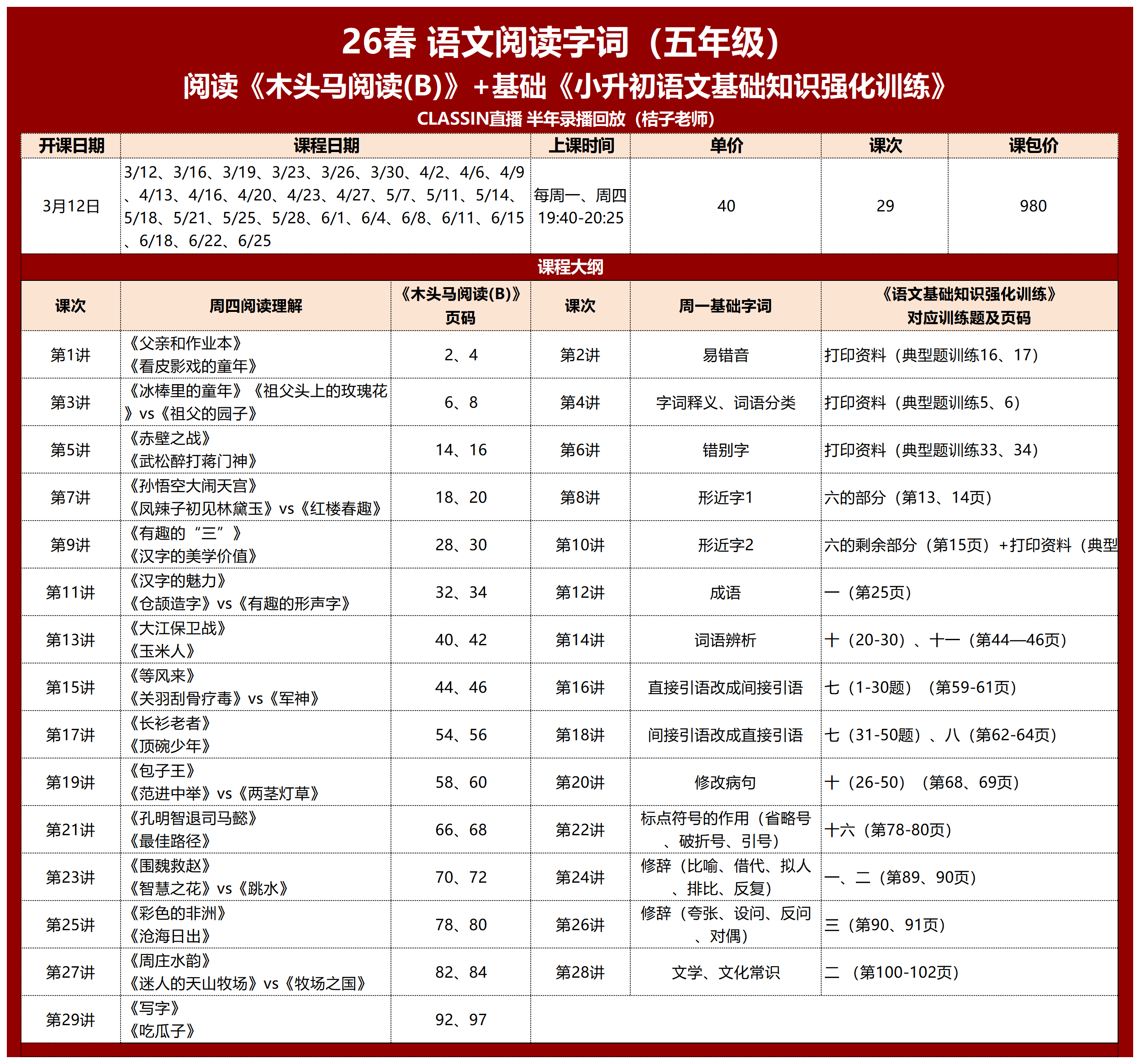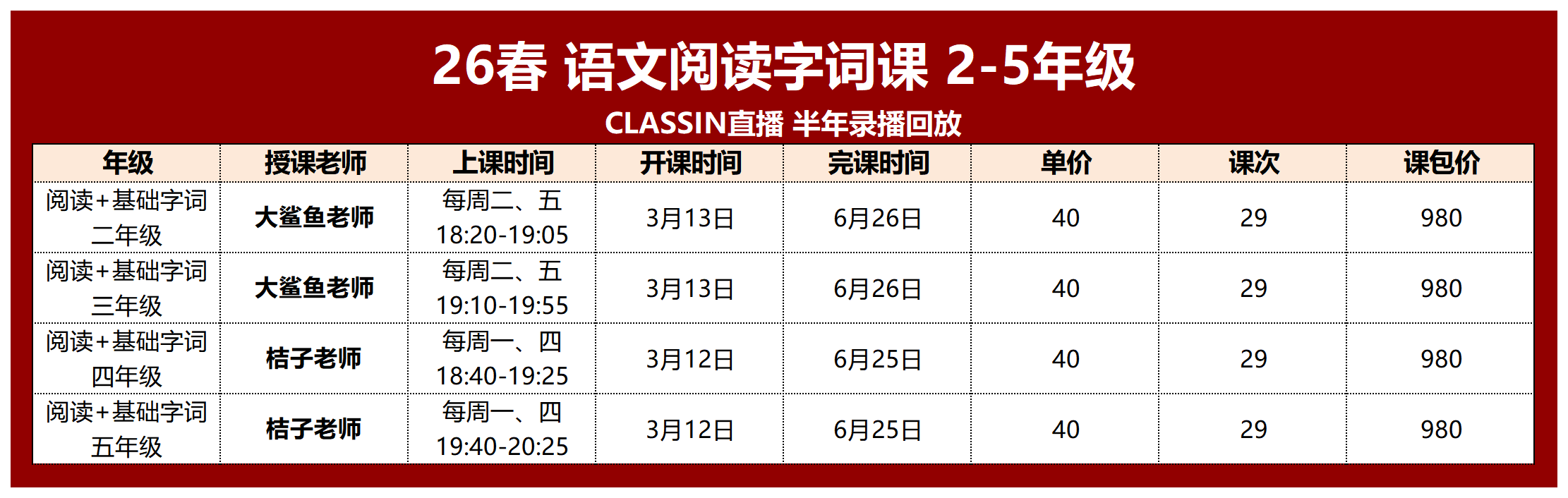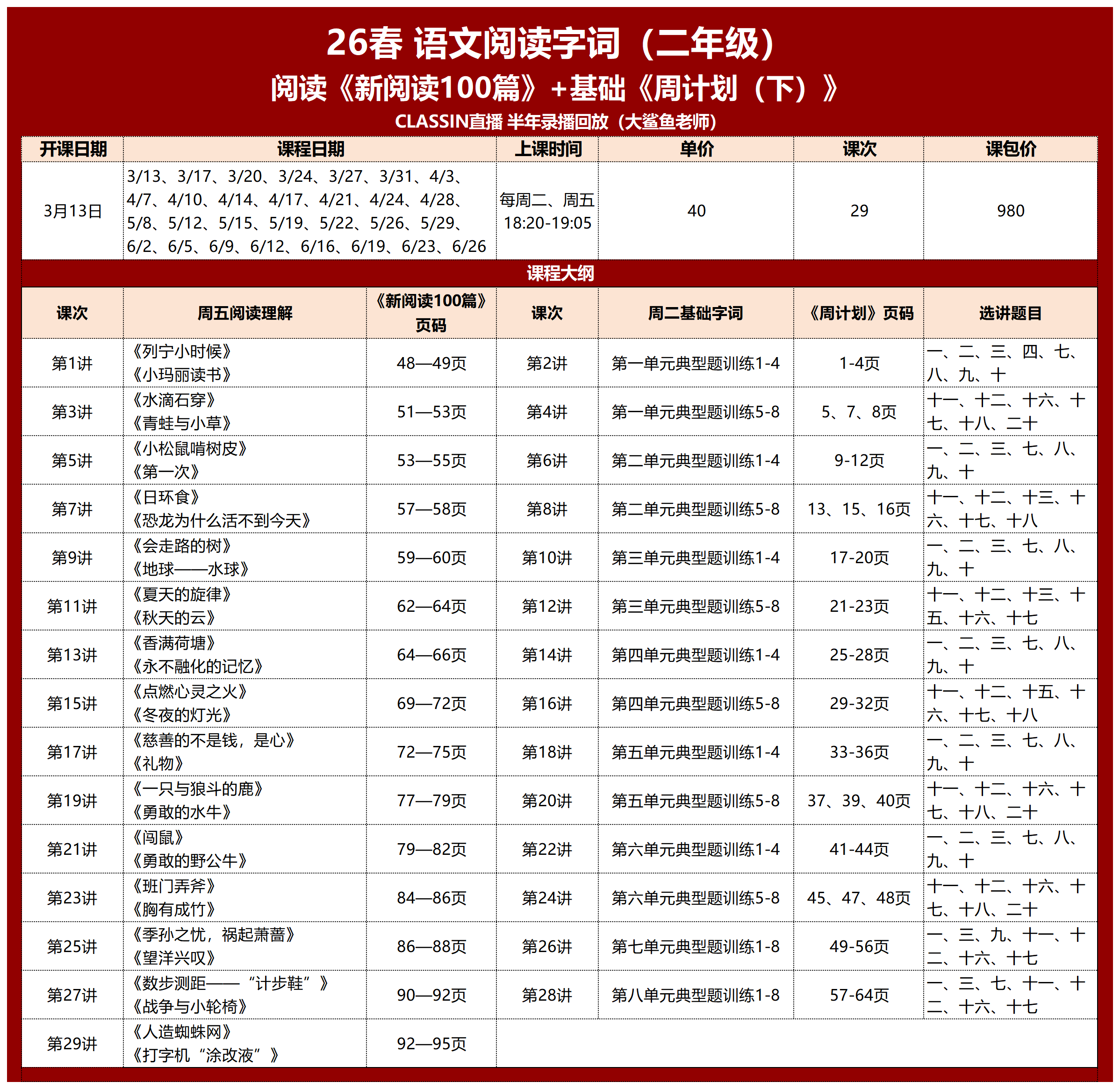🎆【课程频次】每周两次课,分别聚焦课外阅读专项与基础字词提升