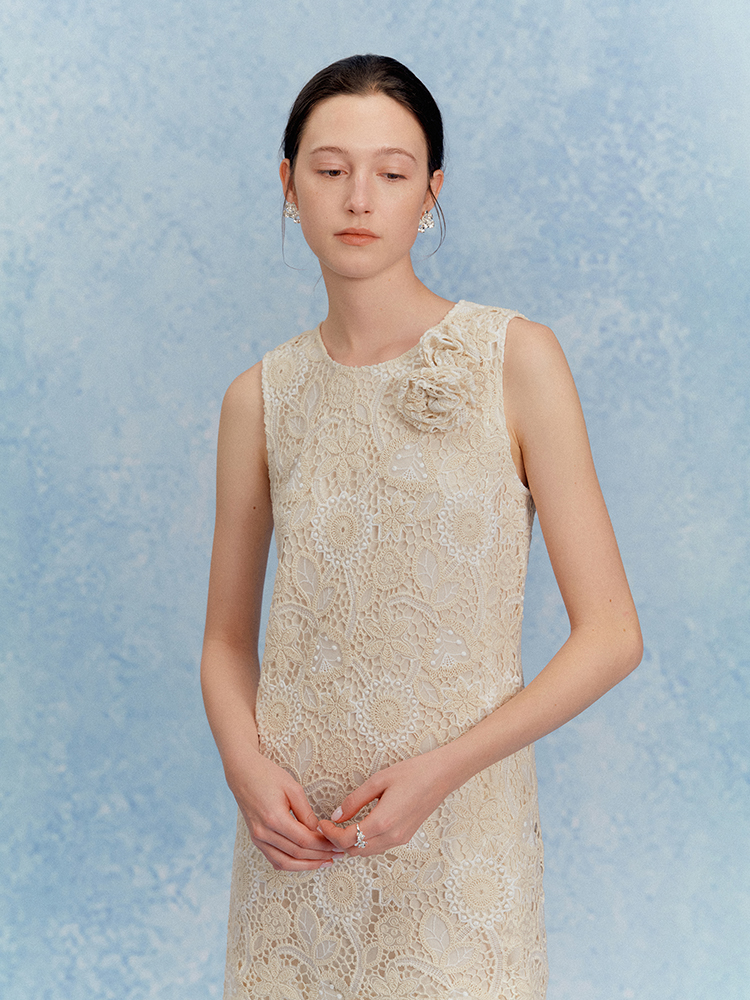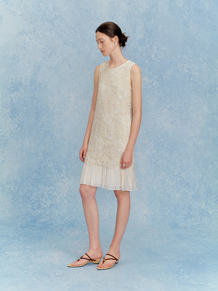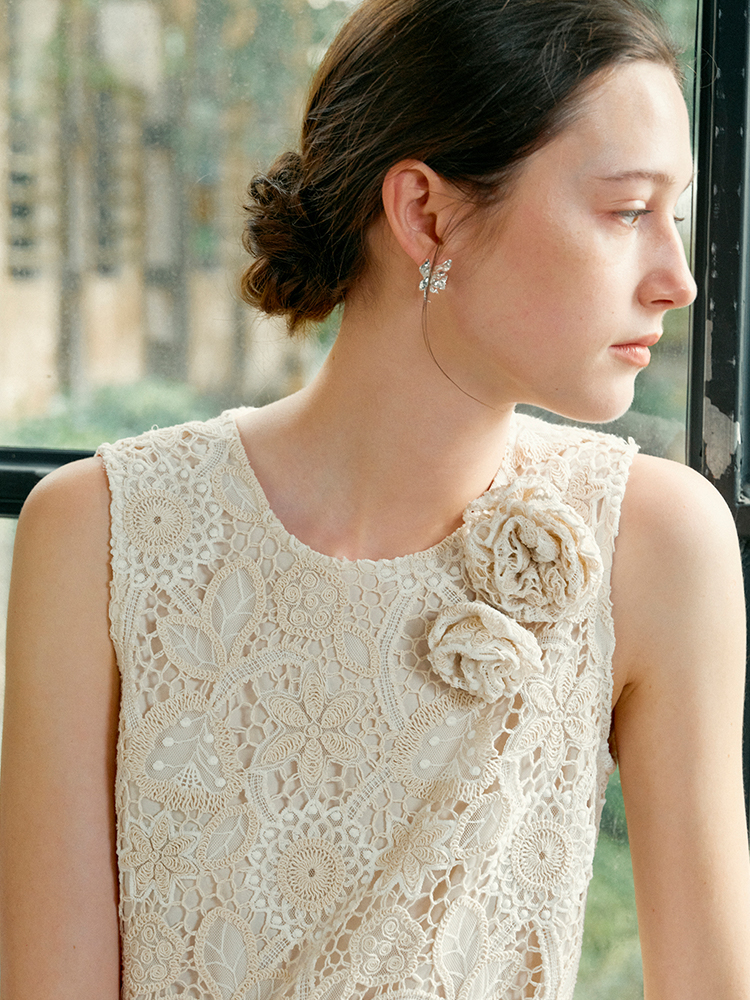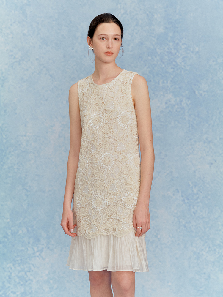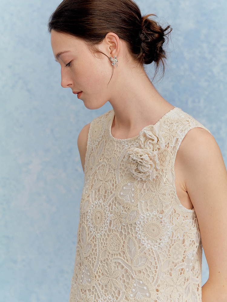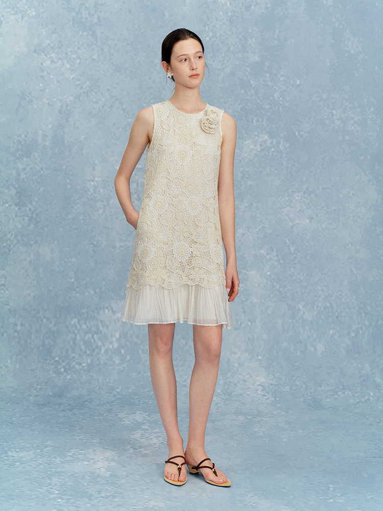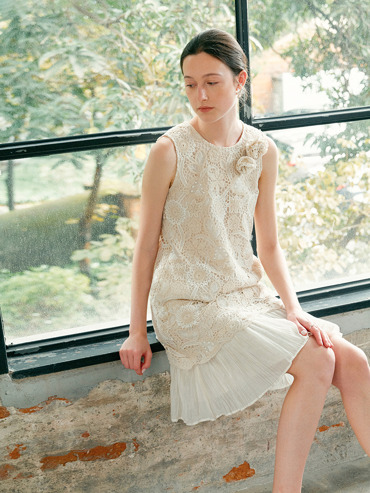 ForPoem 现货 25/SS原创设计无袖钩花拼接肌理下摆短款连衣裙