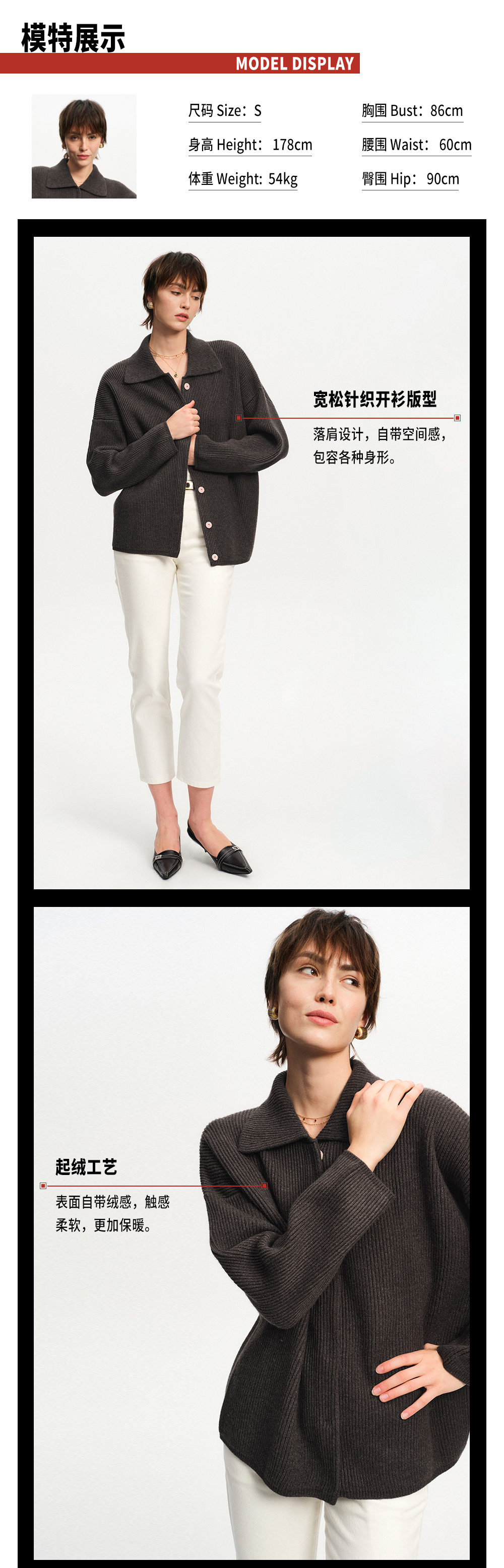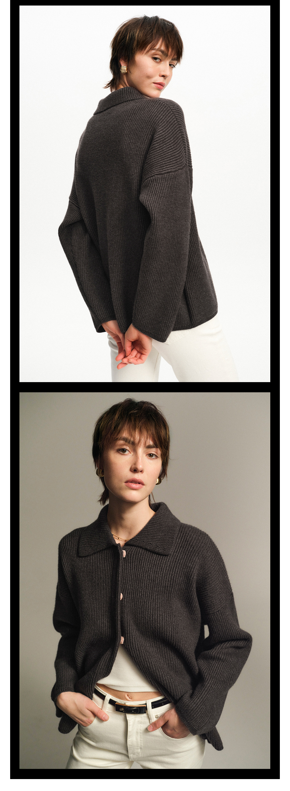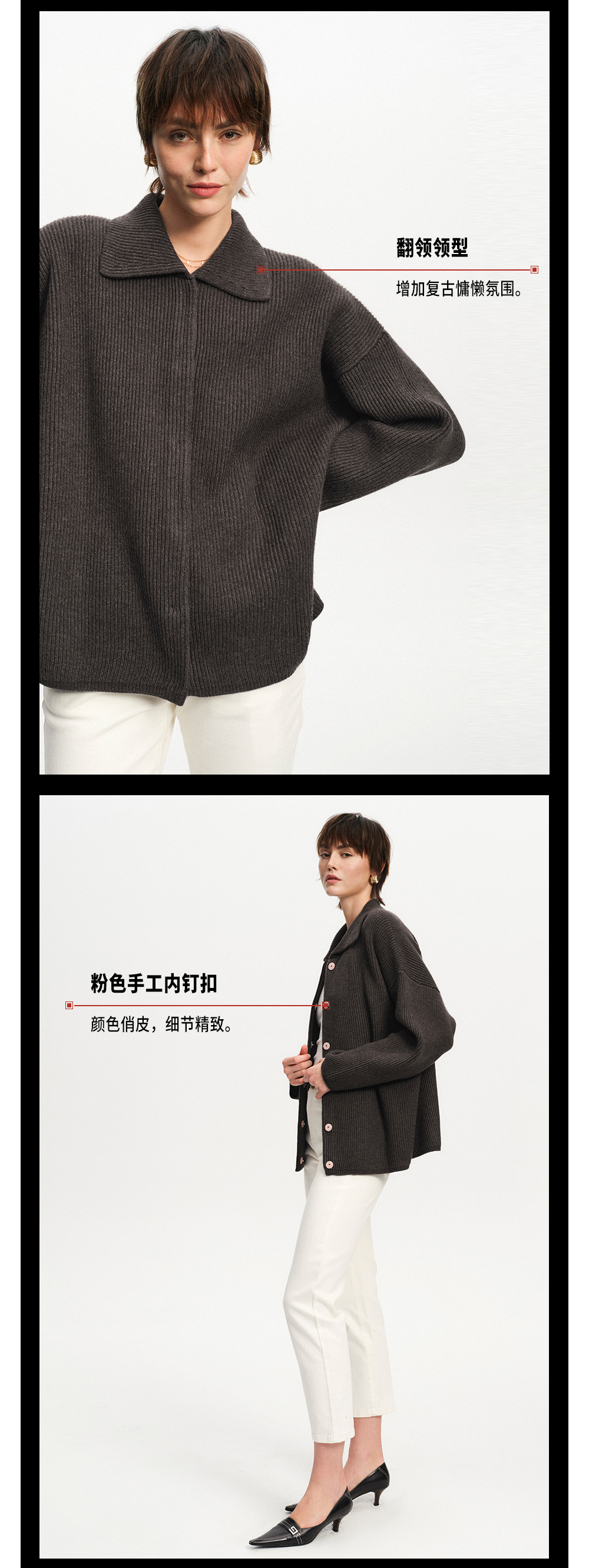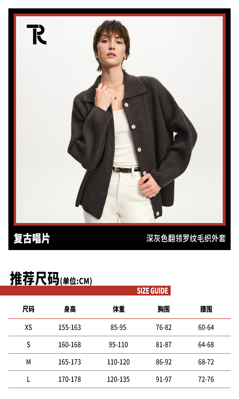 TR她热 复古唱片 深灰色翻领螺纹针织羊毛慵懒保暖宽松开衫外套