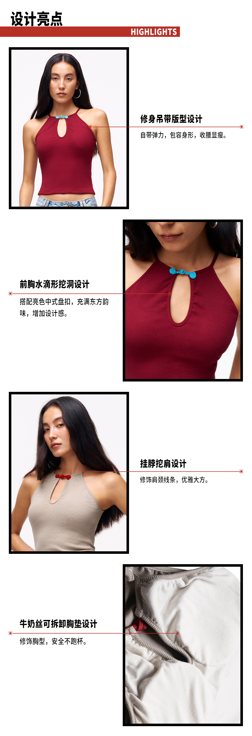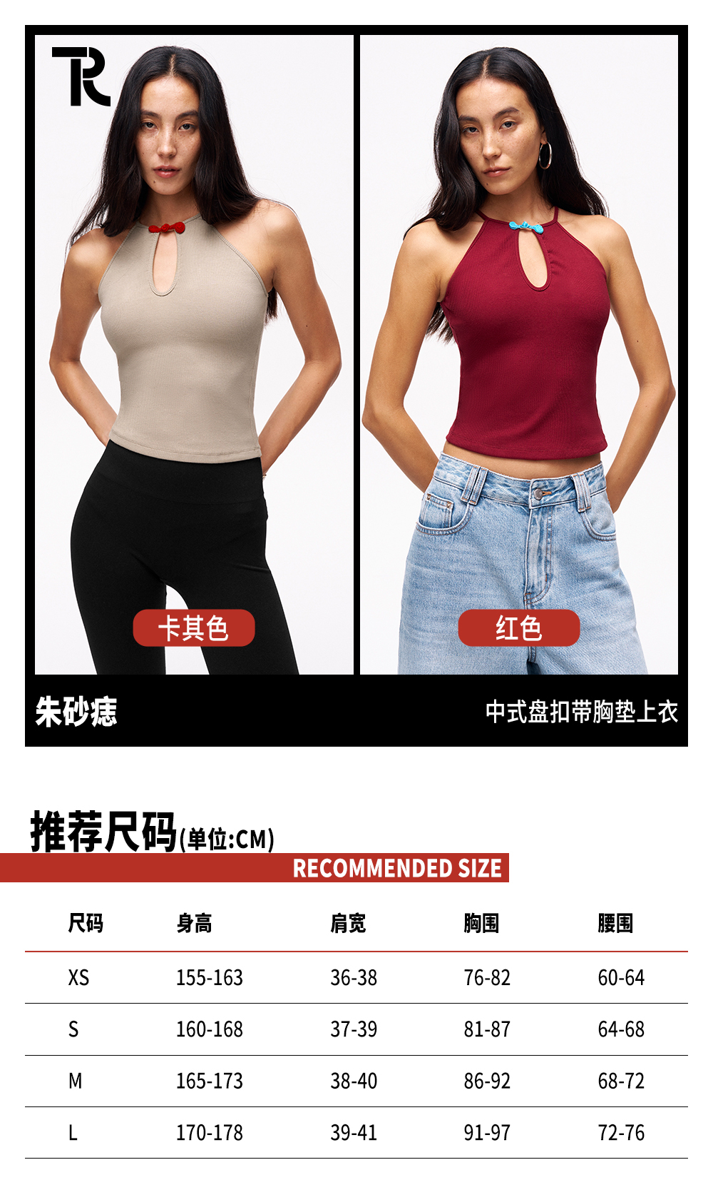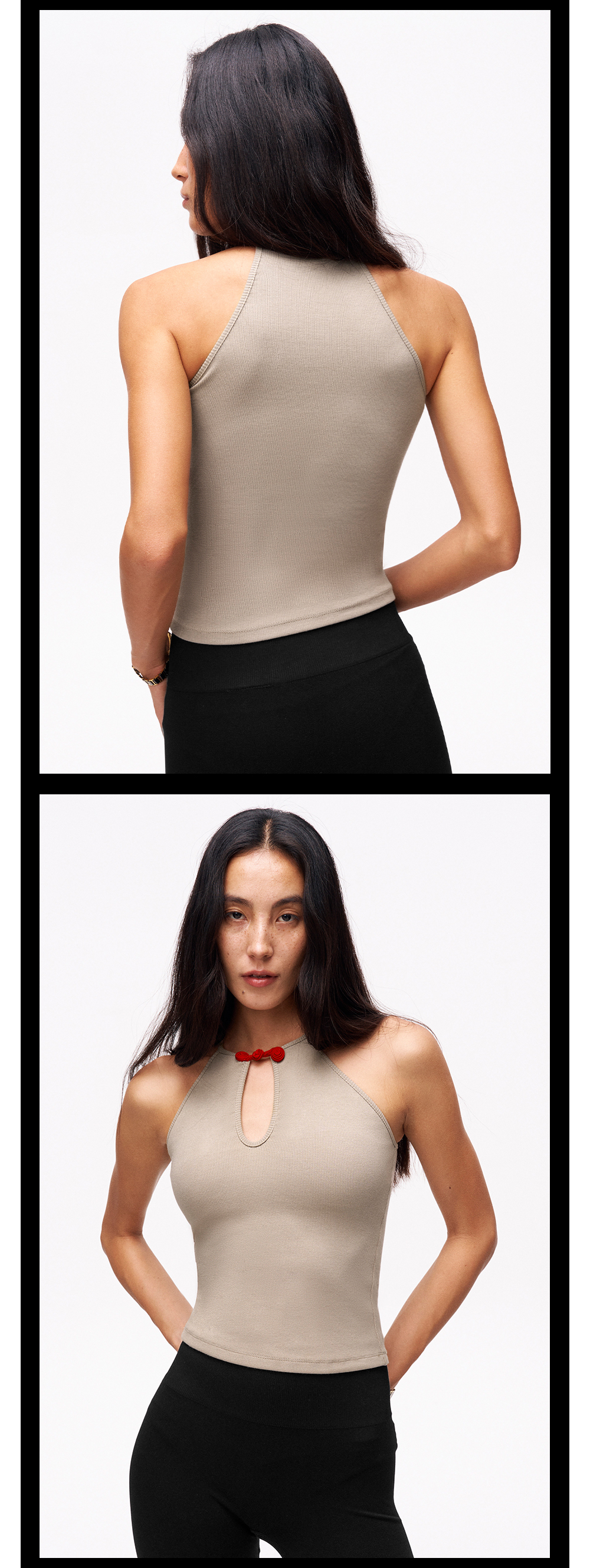 TR她热 朱砂痣 卡其色红色新中式盘扣镂空带胸垫挂脖背心吊带