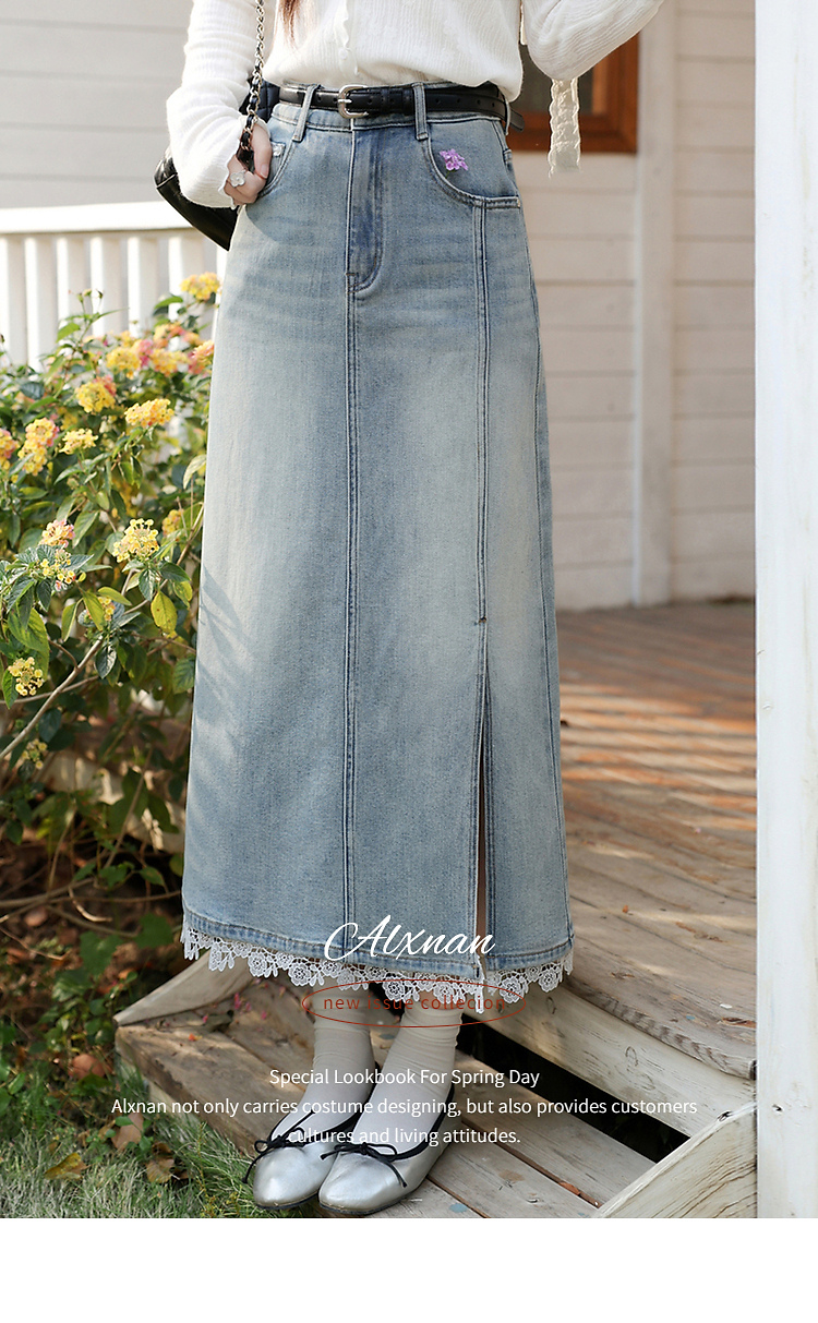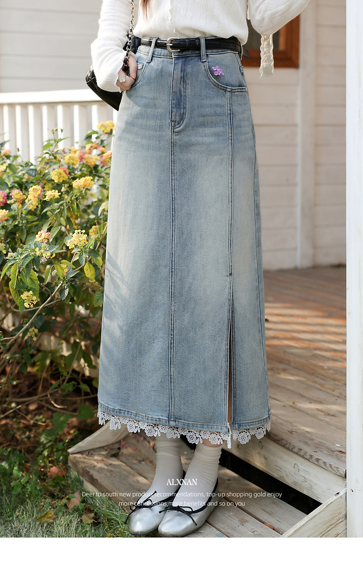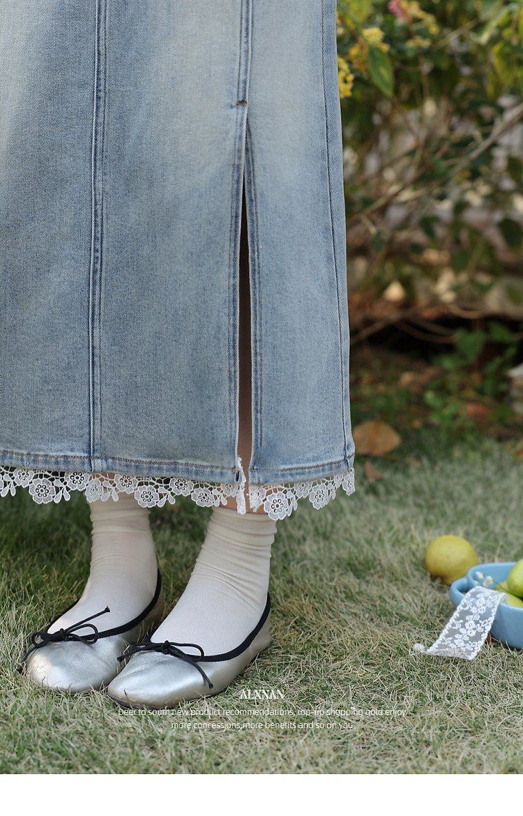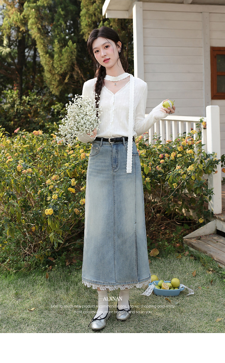 鹿向南「恰好时光」浅蓝色设计感蕾丝拼接半身裙女春季高腰A字裙
