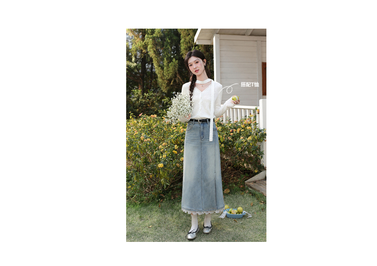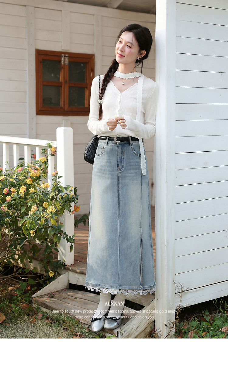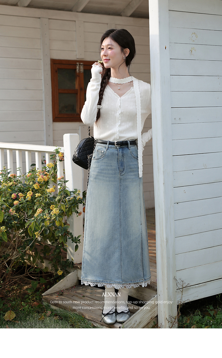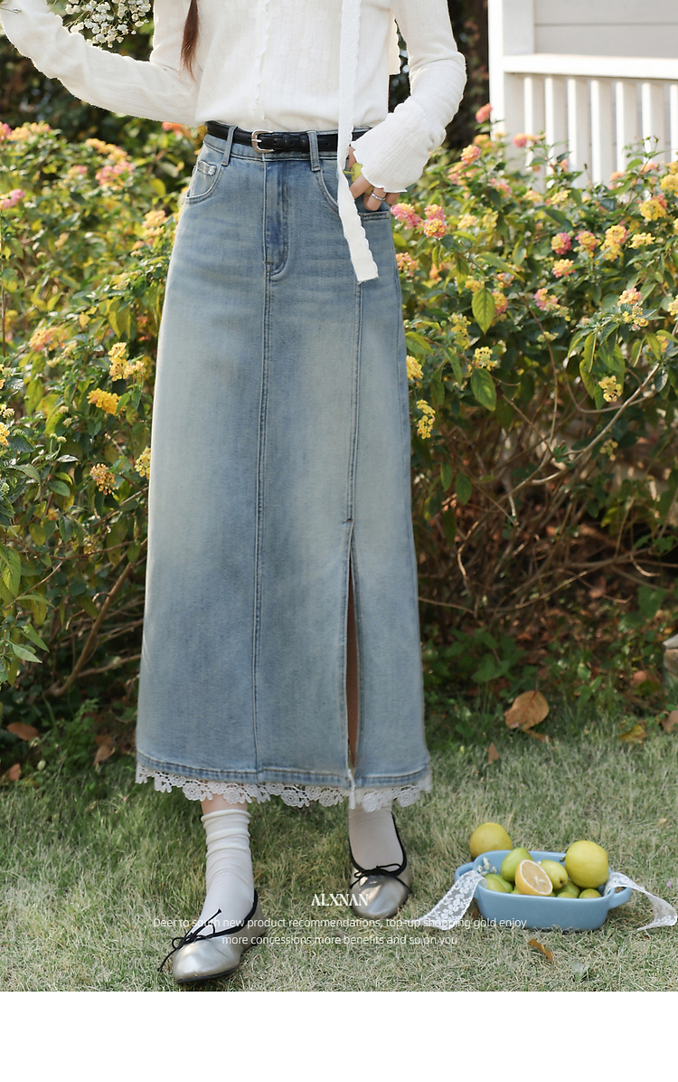 鹿向南「恰好时光」浅蓝色设计感蕾丝拼接半身裙女春季高腰A字裙