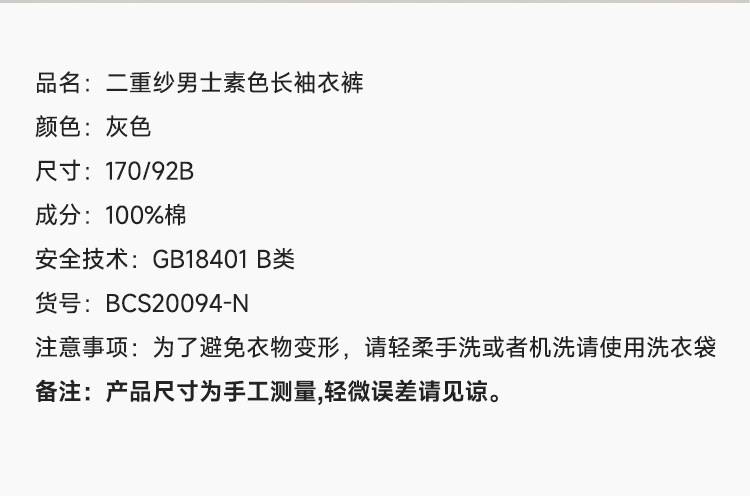内野SC 二重纱男士素色长袖衣裤睡衣