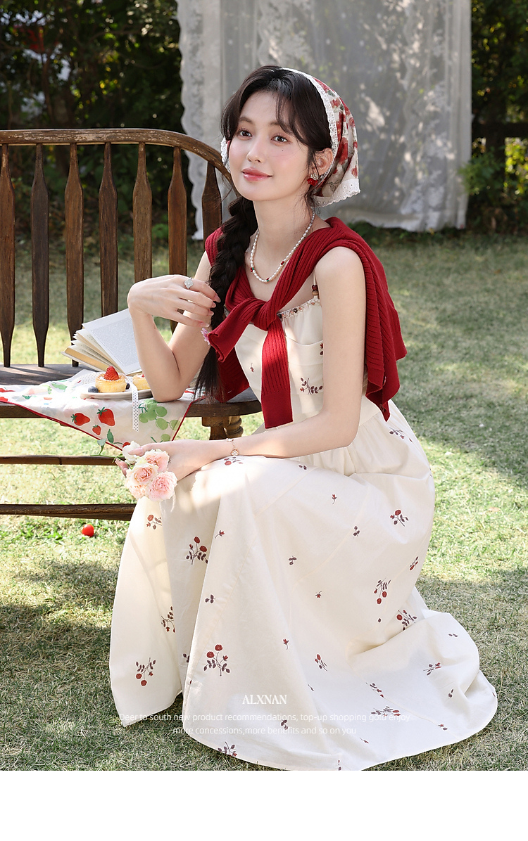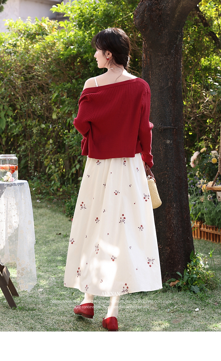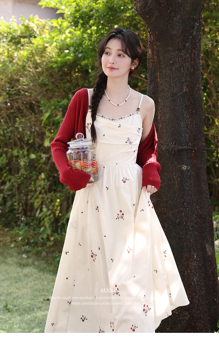 鹿向南「清新花语」红色法式长袖毛针织衫女春季新款短款开衫上衣
