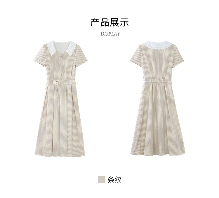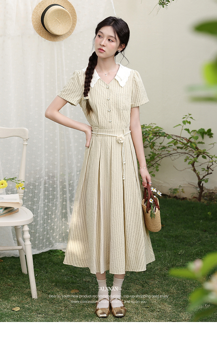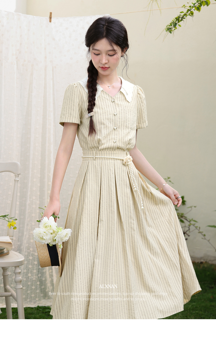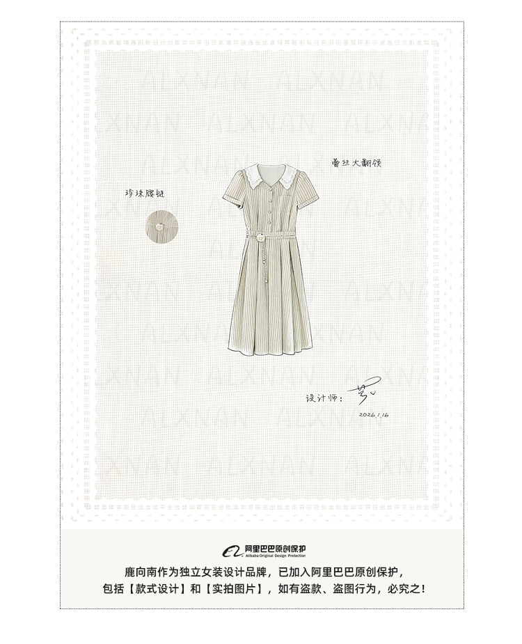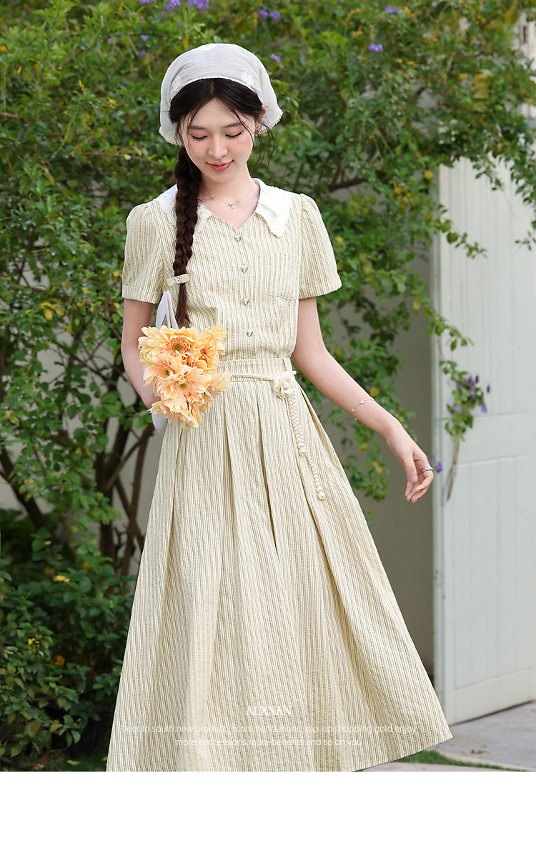 鹿向南「伯恩美术馆」条纹短袖V领连衣裙女夏季收腰显瘦A字长裙子