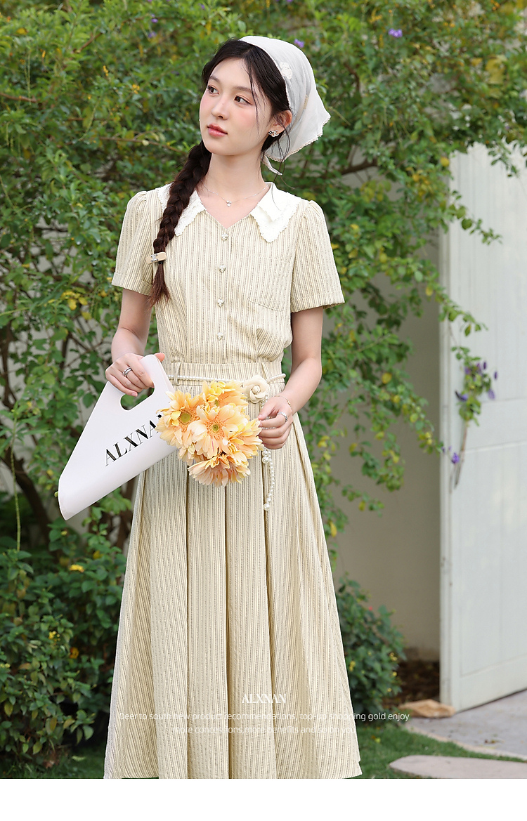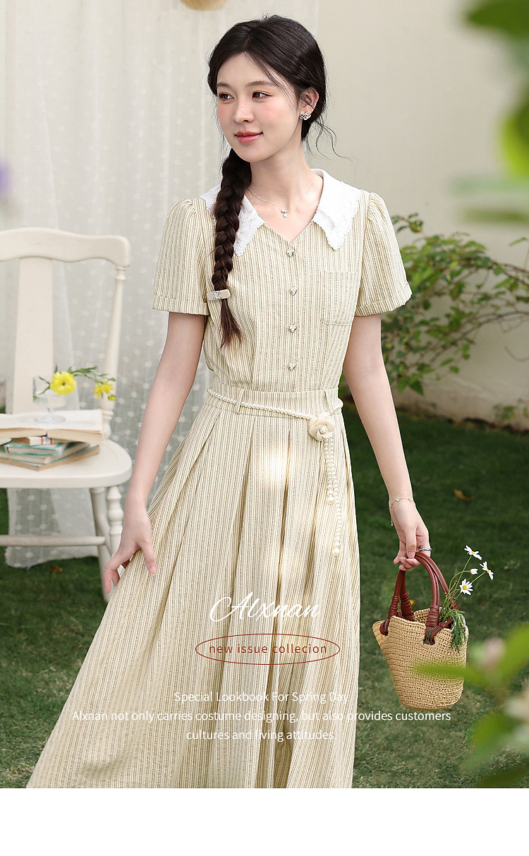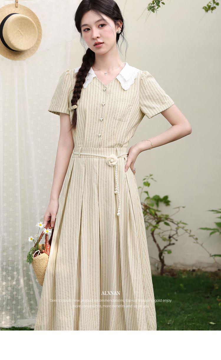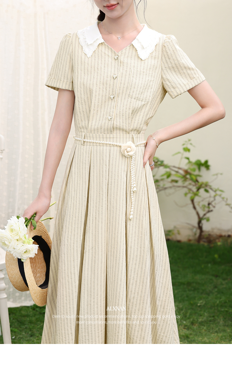 鹿向南「伯恩美术馆」条纹短袖V领连衣裙女夏季收腰显瘦A字长裙子