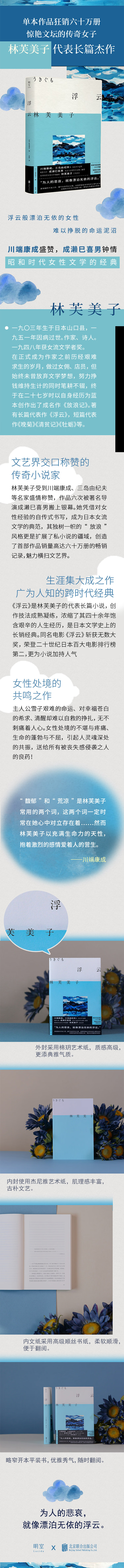 战时雪子为了摆脱亲戚伊庭的情感控制远赴印度支那,却在密林遍布的南国邂逅有妇之夫富冈,陷入又一场不伦之恋。战争结束后雪子与富冈各自返回日本,残破的现实让一切幻梦破碎。雪子浑浑噩噩不知该如何活在世上,她已经看透了富冈的凉薄,几度欲与其分手,但终究难以挣脱……在一次次理性和欲望的纠葛中越是挣扎越是沉沦,清醒着堕入命运的泥沼。 《浮云》是林芙美子生前最后的代表长篇小说,是其文学生涯中呕心沥血的集大成之作。四十余年饱含艰辛的人生经历,让林芙美子的视线触及人的卑劣,也追逐着人的良善,冷彻的笔触晕染出对芸芸众生的深切悲悯。 川端康成评价林芙美子:“能如此感叹女人悲哀的人非常罕见。”传奇小说家、永远的文学少女,林芙美子的魅力横扫文艺界。她凭借对女性经验的自传式书写,成为日本“女流文学”的典范,其独树一帜的“放浪”风格更是扩展了“私小说”的疆域。她是电影大师成濑巳喜男钟情的作家,其作品先后六度被改编搬上银幕,其中电影《浮云》斩获无数大奖,荣登二十世纪日本百大电影排行榜第二。