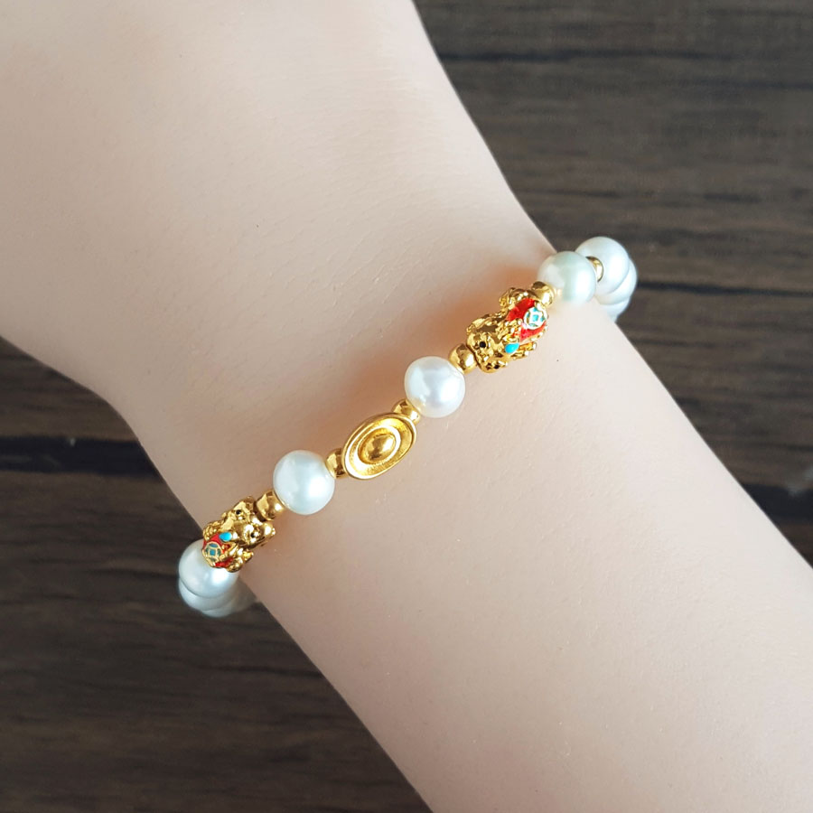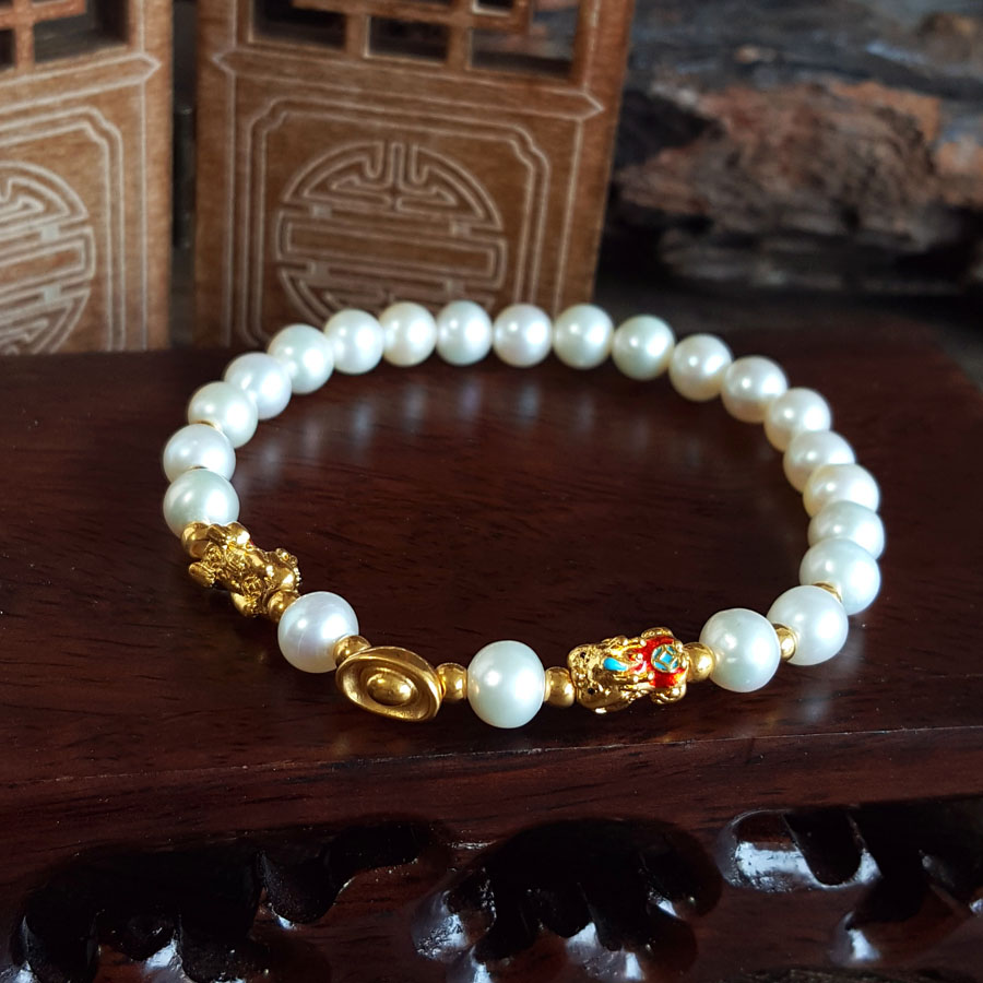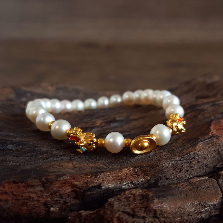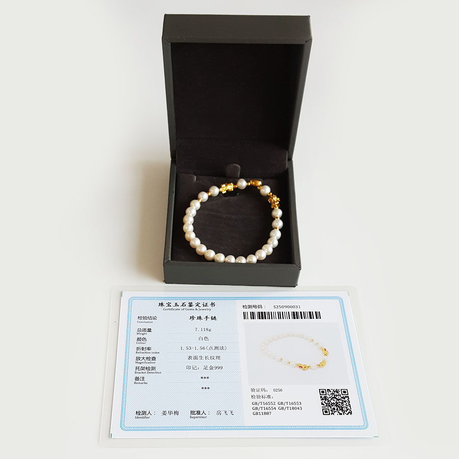 【天然正品】AU999黄金瑞兽元宝造型(招财辟邪)白色约6.1MM珍珠手串女士300825NJM37现售价:1080特价