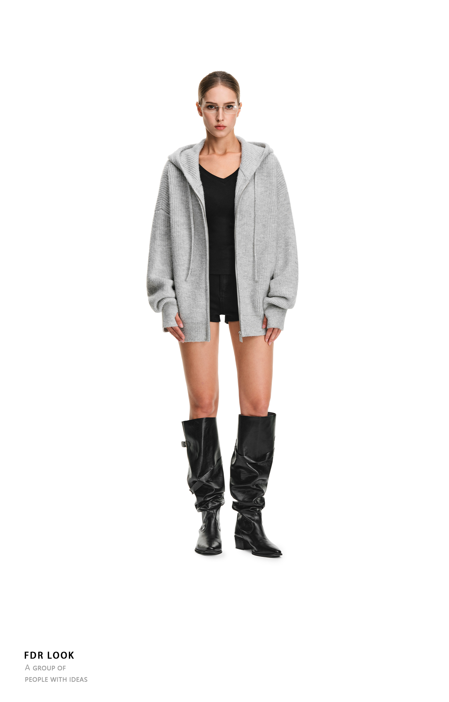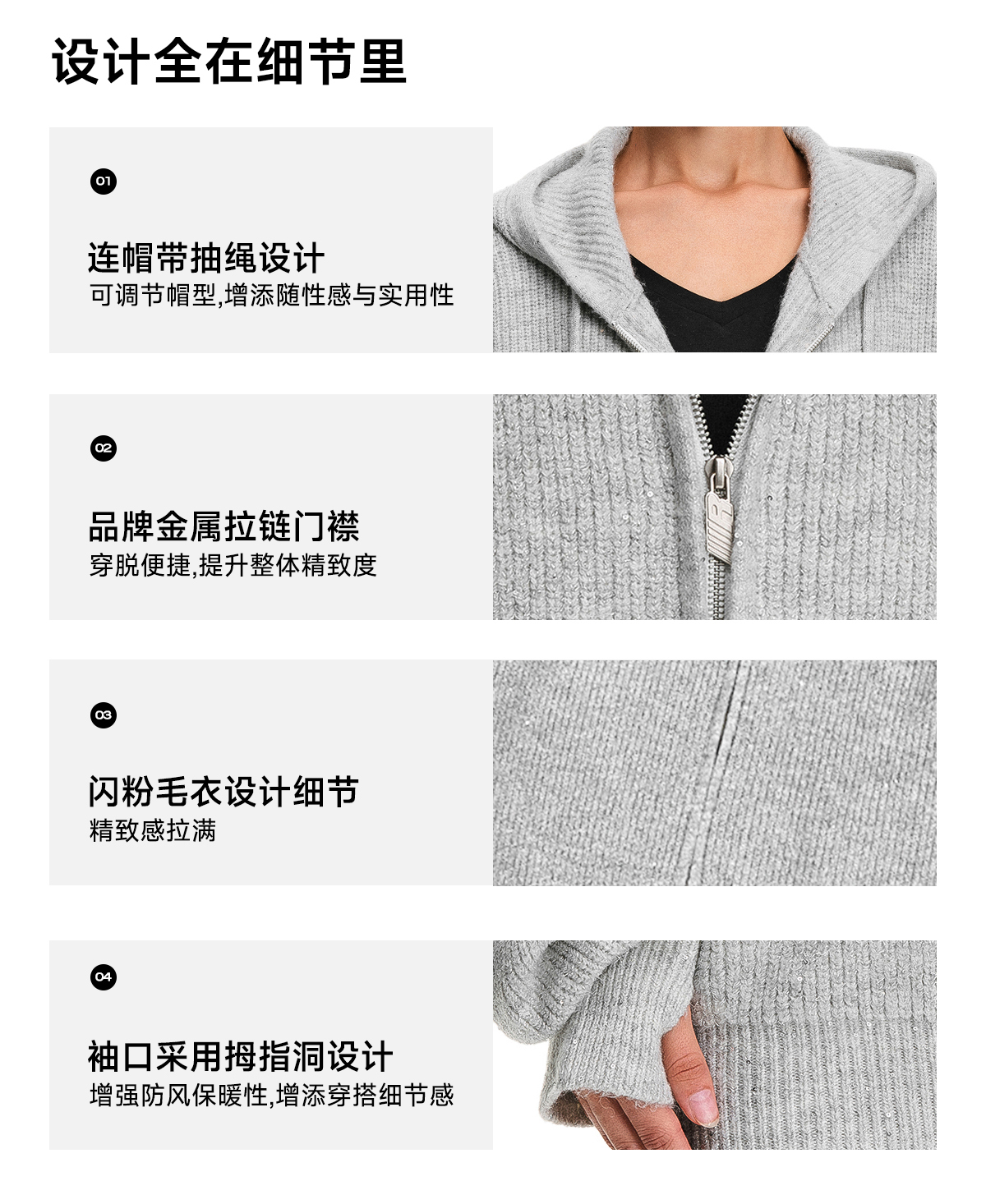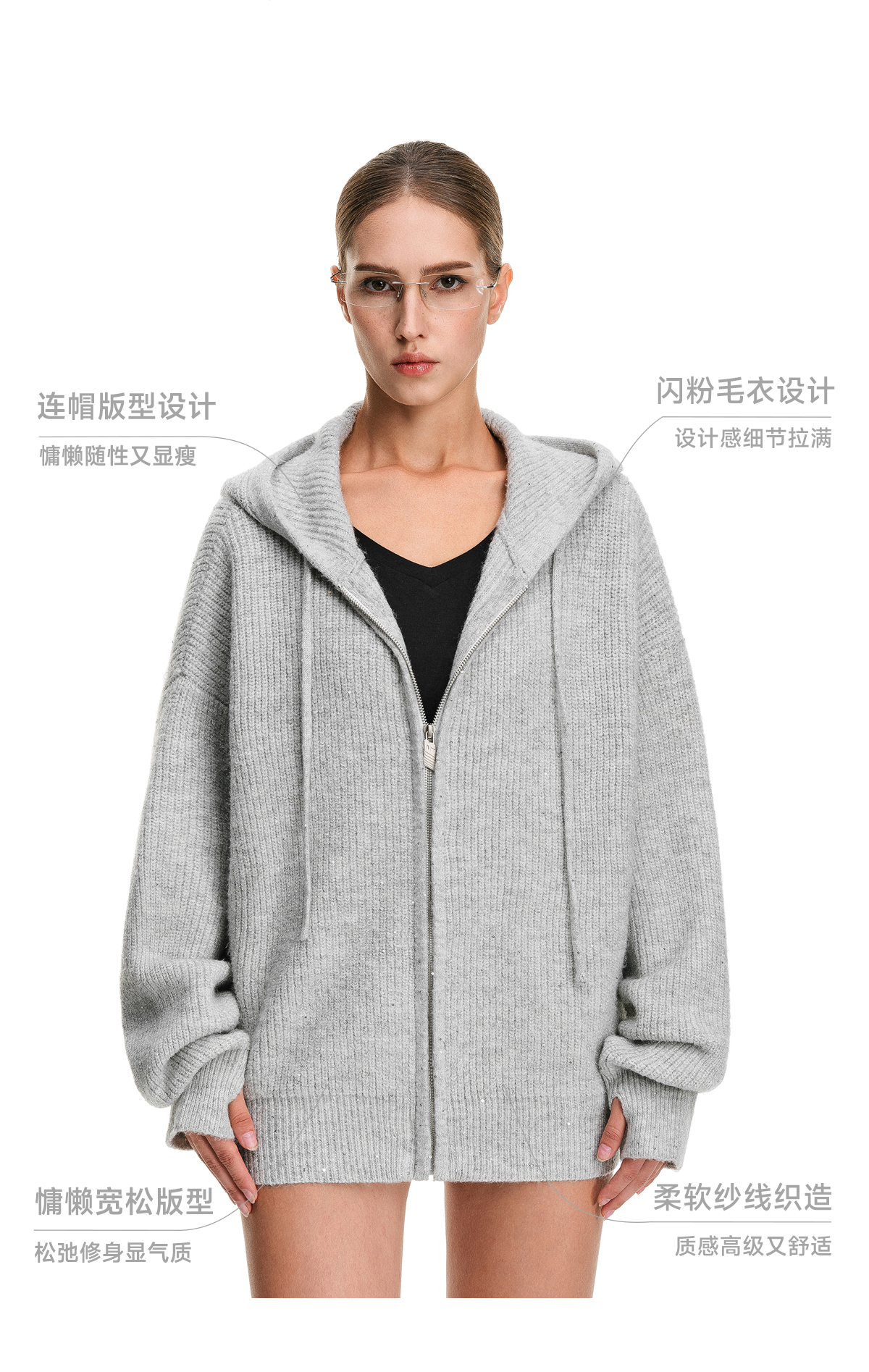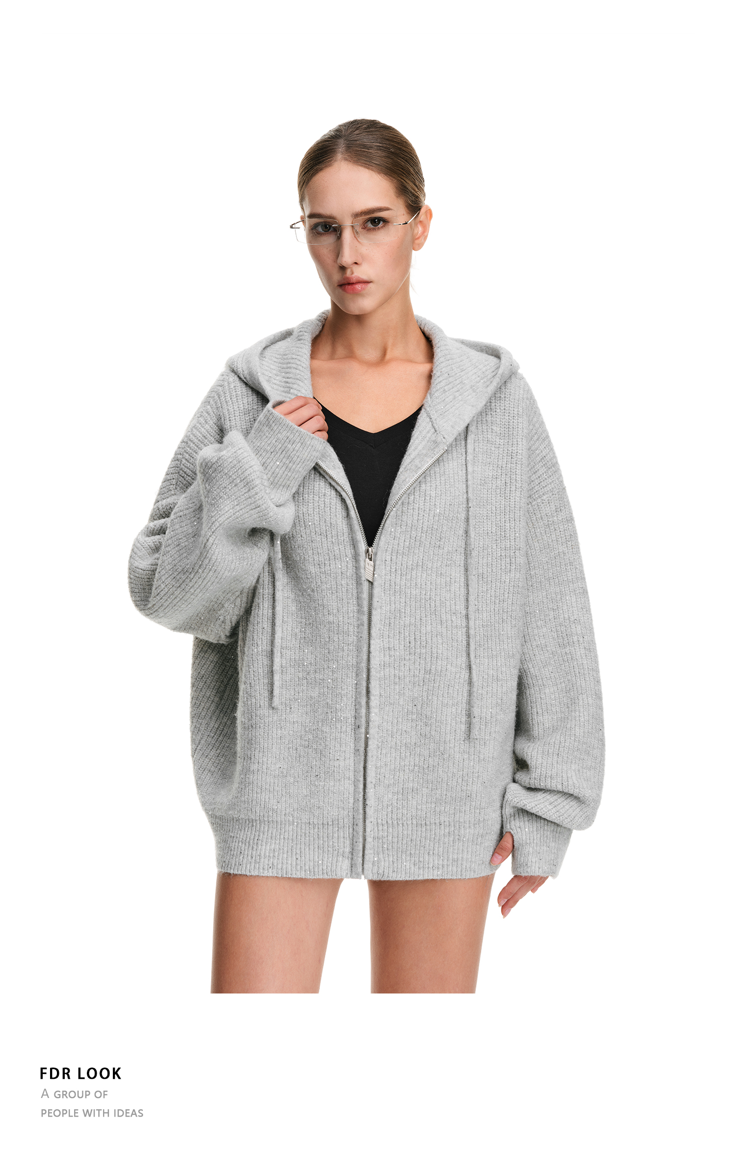 FDR官方店 慵懒风细闪针织毛衣女秋季2025新款连帽拉链开衫外套