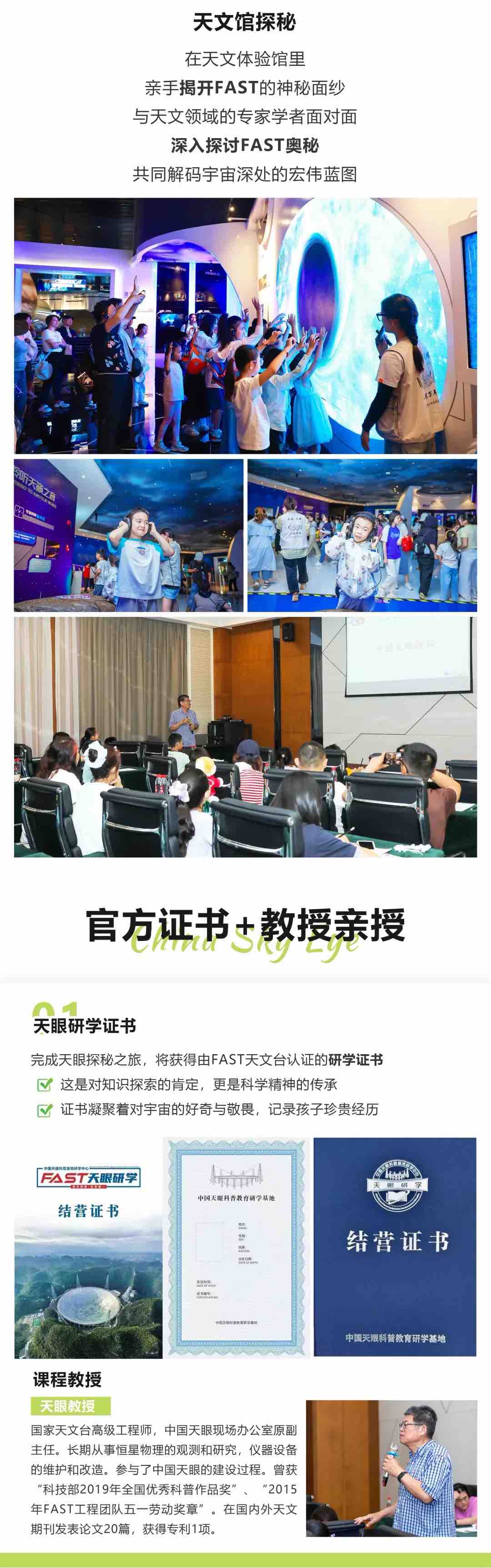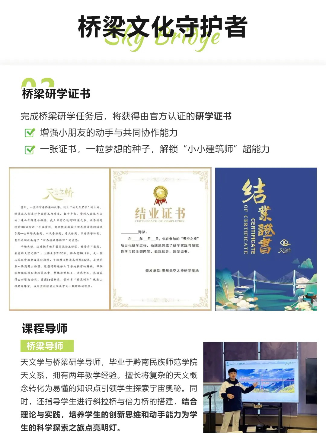 三大证书:桥梁研学证书,天文研学证书,探洞研学证书;