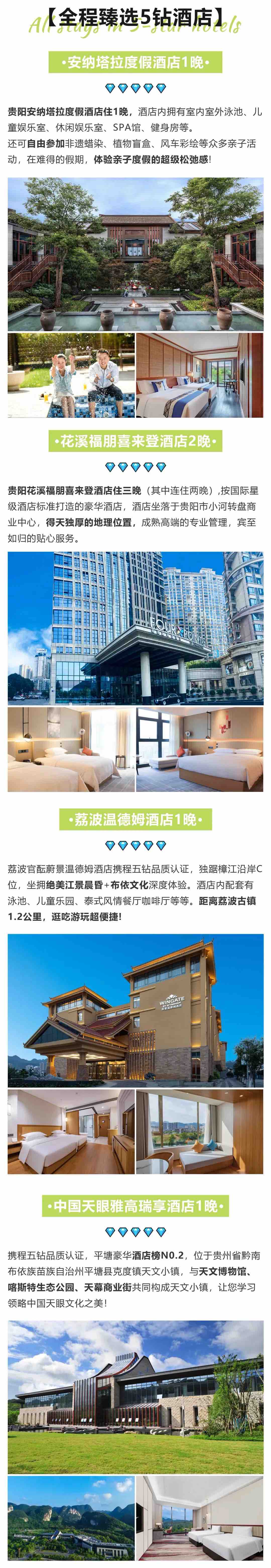 【住宿】:全程五钻酒店住宿,贵阳安纳塔拉1晚;花溪福朋喜来登2晚;荔波温德姆1晚;天眼雅高瑞享酒店1晚;