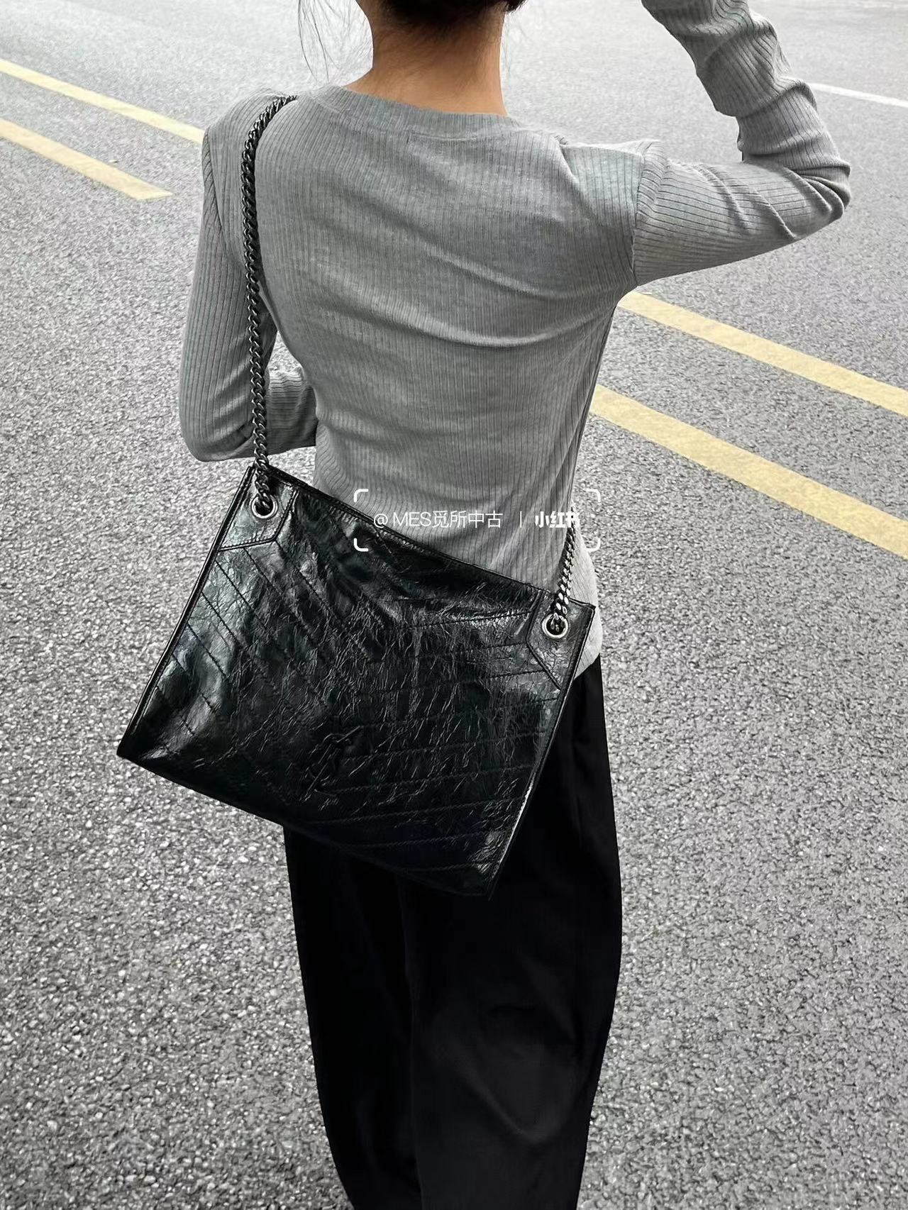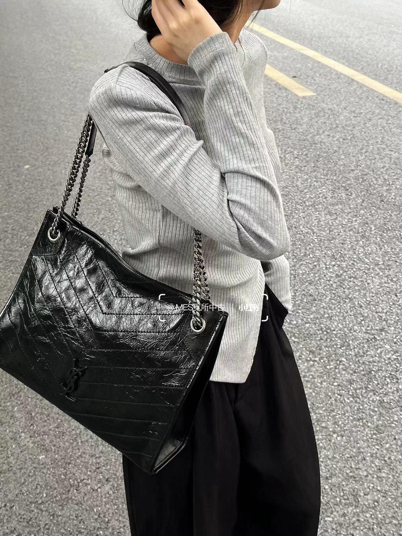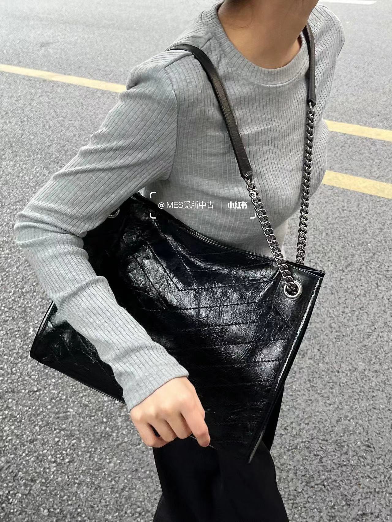 圣罗兰-Niki黑标 Logo复古褶皱皮革大容量托特包购物袋链条单肩手提包中号女款黑色百搭通勤推荐(LZ)