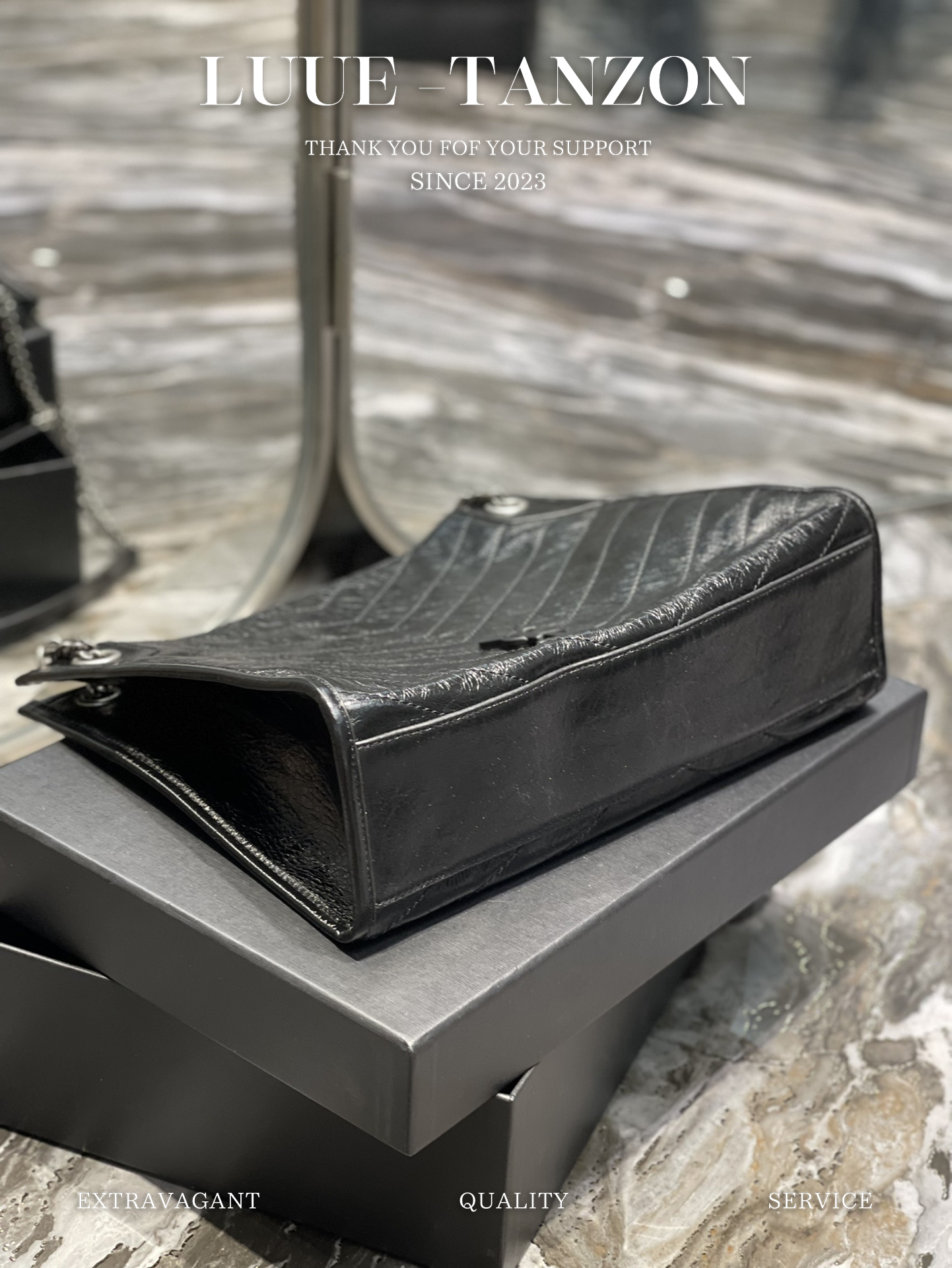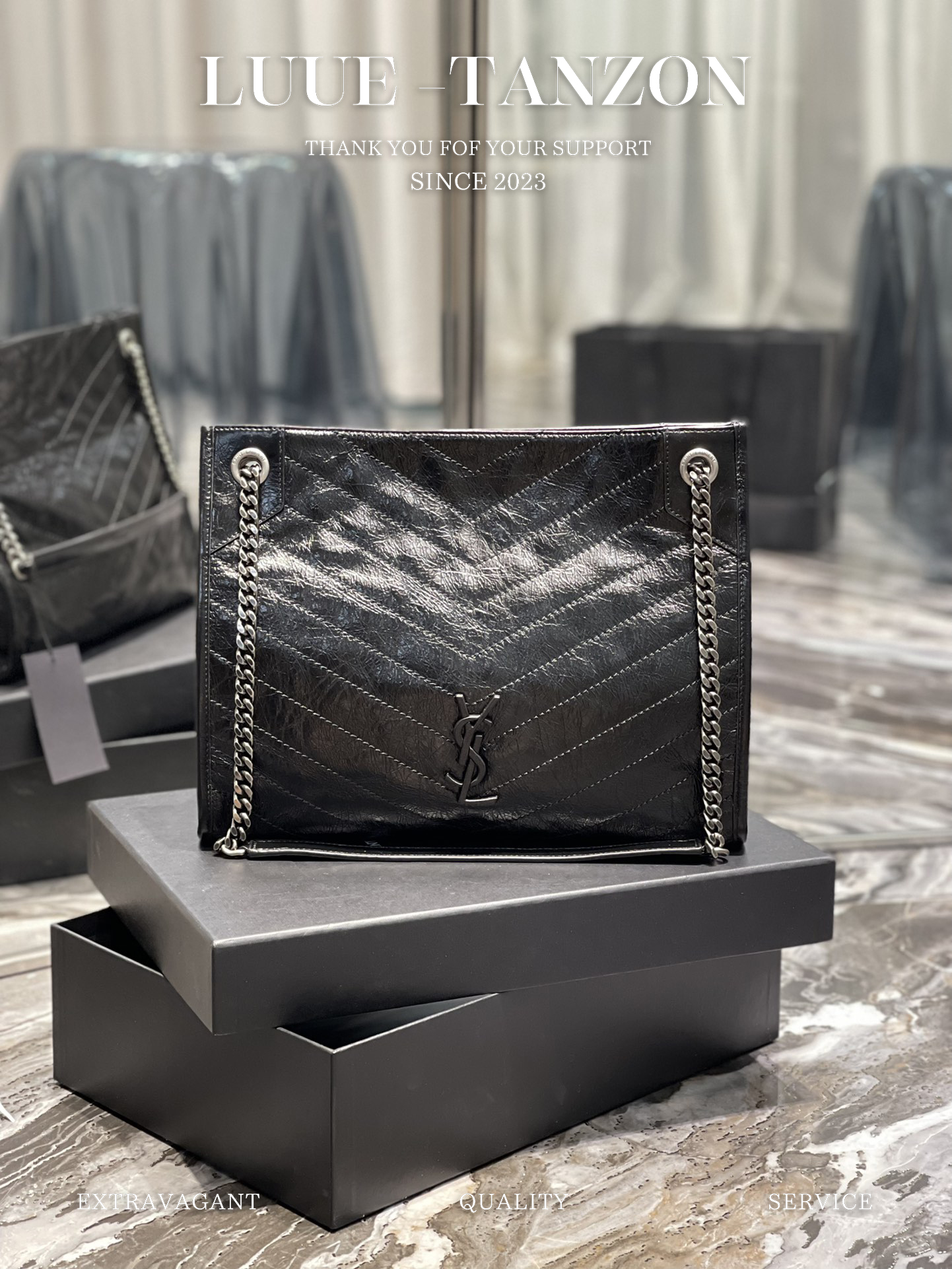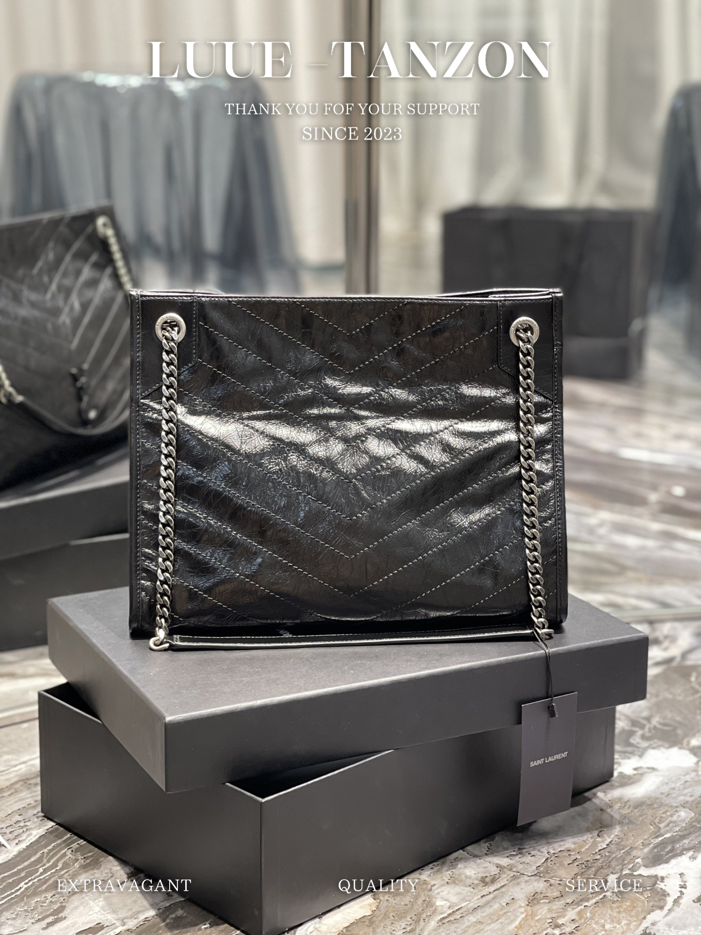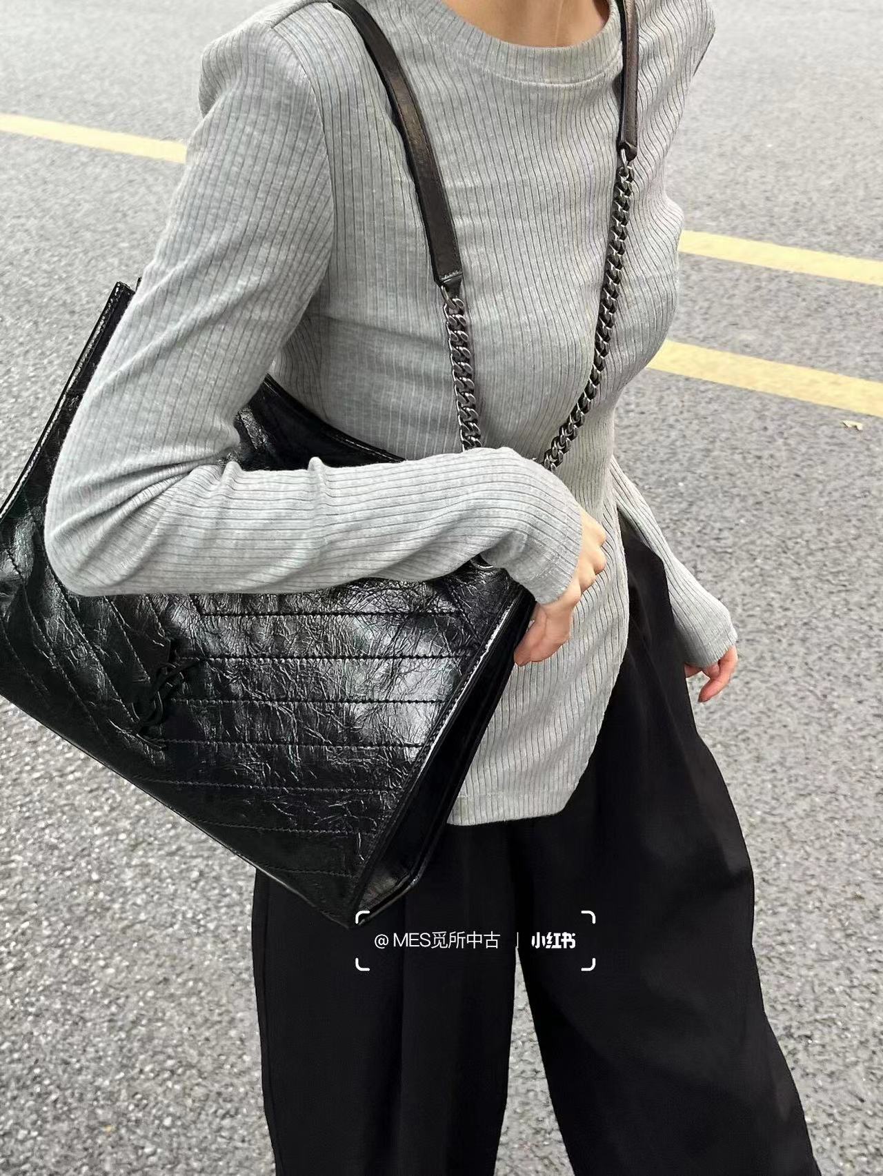 圣罗兰-Niki黑标 Logo复古褶皱皮革大容量托特包购物袋链条单肩手提包中号女款黑色百搭通勤推荐(LZ)