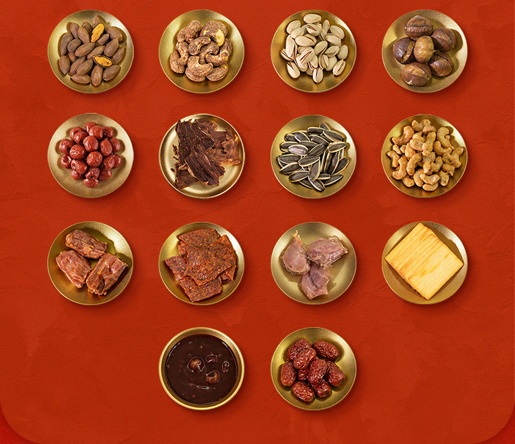👉规格: 大礼包内含物:1.诸暨老树香榧55克 2.紫衣大腰果 80g 3.原香开心果 50g 4.有机大板栗 100g 5.脆冬枣90g 6.安格斯雪花牛排脆 15g 7.原味瓜子 180g 8.腰达仁(碳烧腰果)45g 9.来吃鸭风味鸭脖 80g 10.香脆猪肉脯 35g 11.来吃鸭鸭肫 55g 12.岩烧芝士薄脆饼干 120g 13.陈皮莲子红豆沙 180g 14.即食红枣 150g