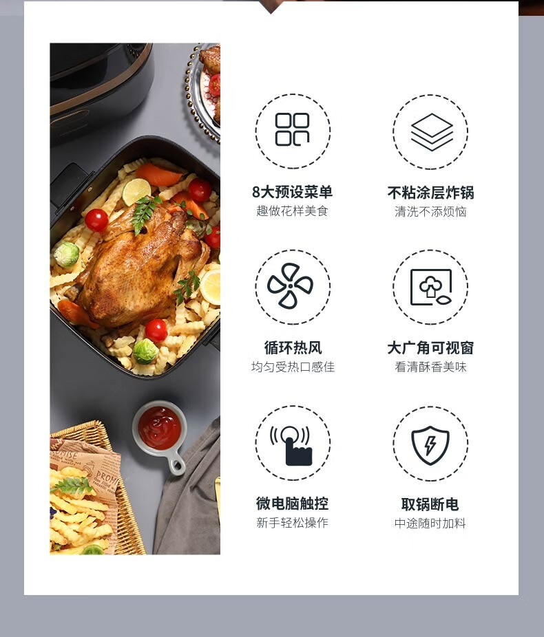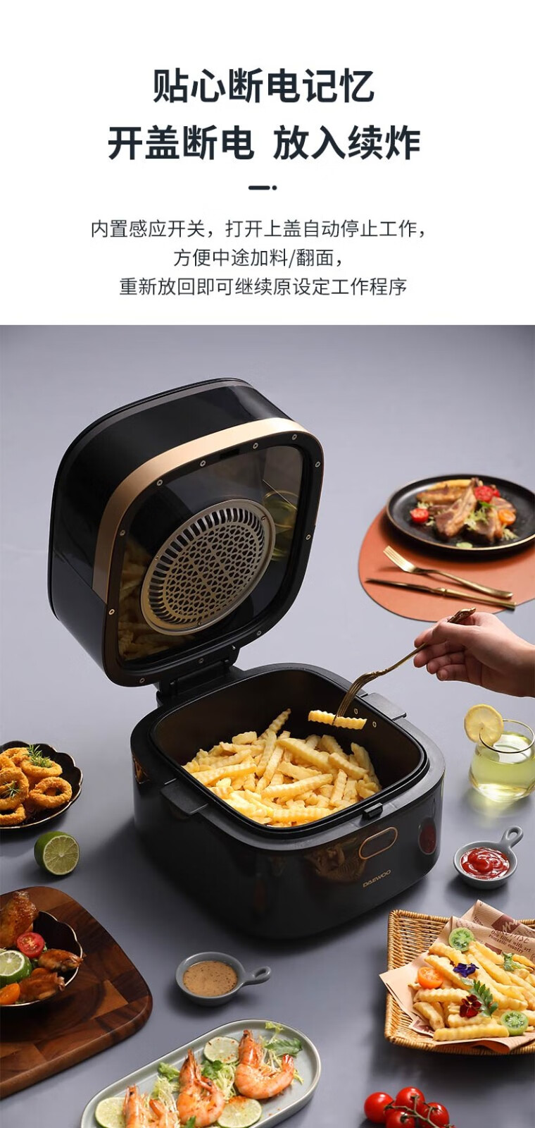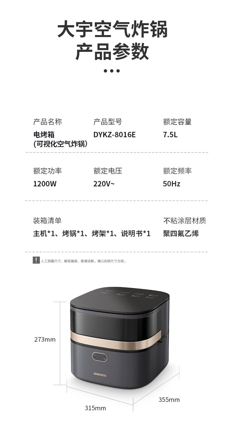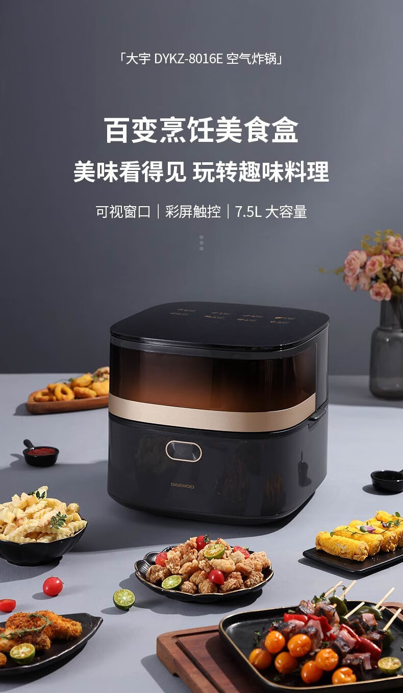 大宇(DAEWOO)空气炸锅家用大容量多功能智能可视电炸锅DYKZ-8016E 莫兰迪灰色