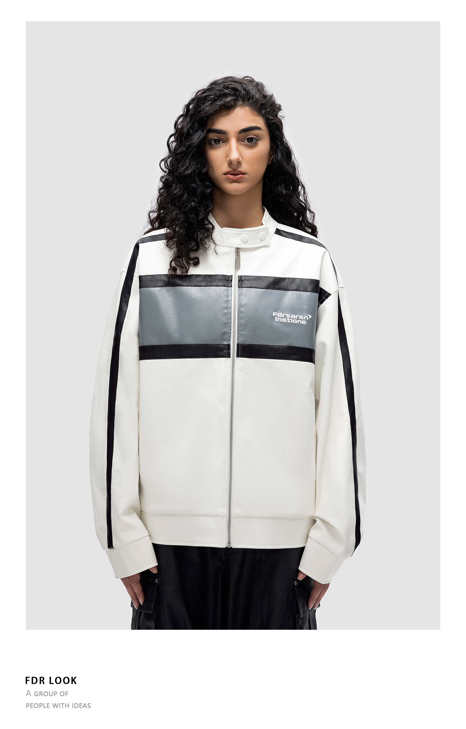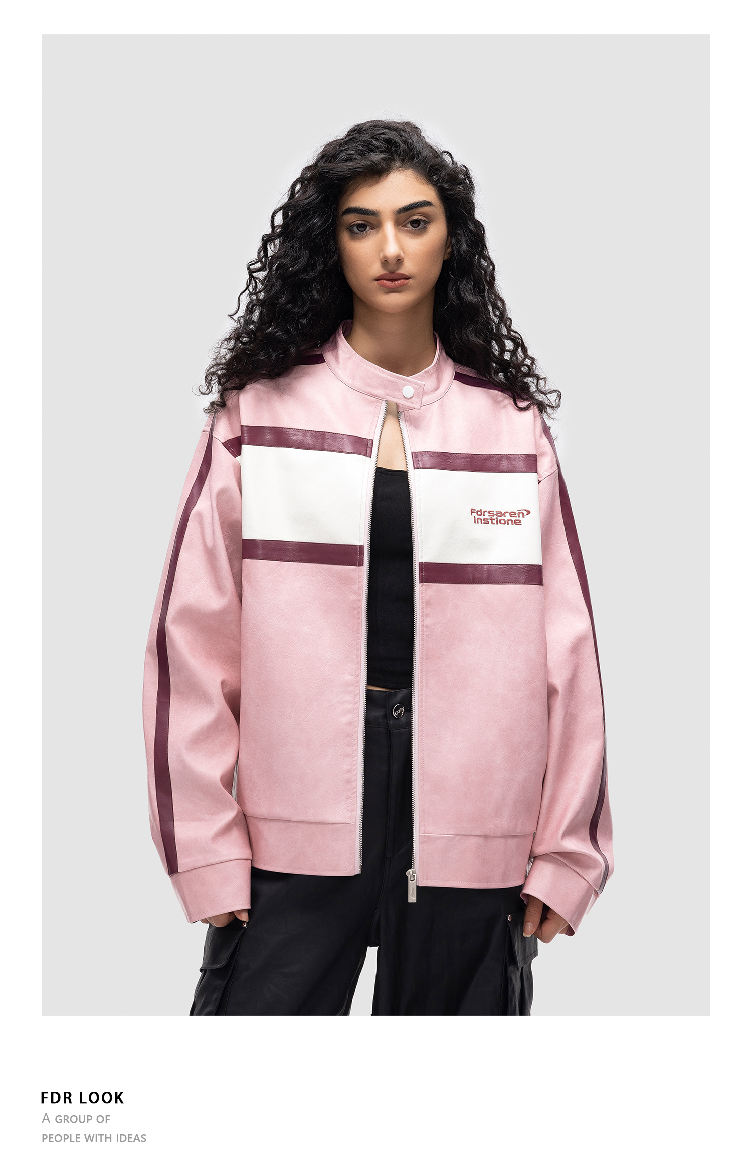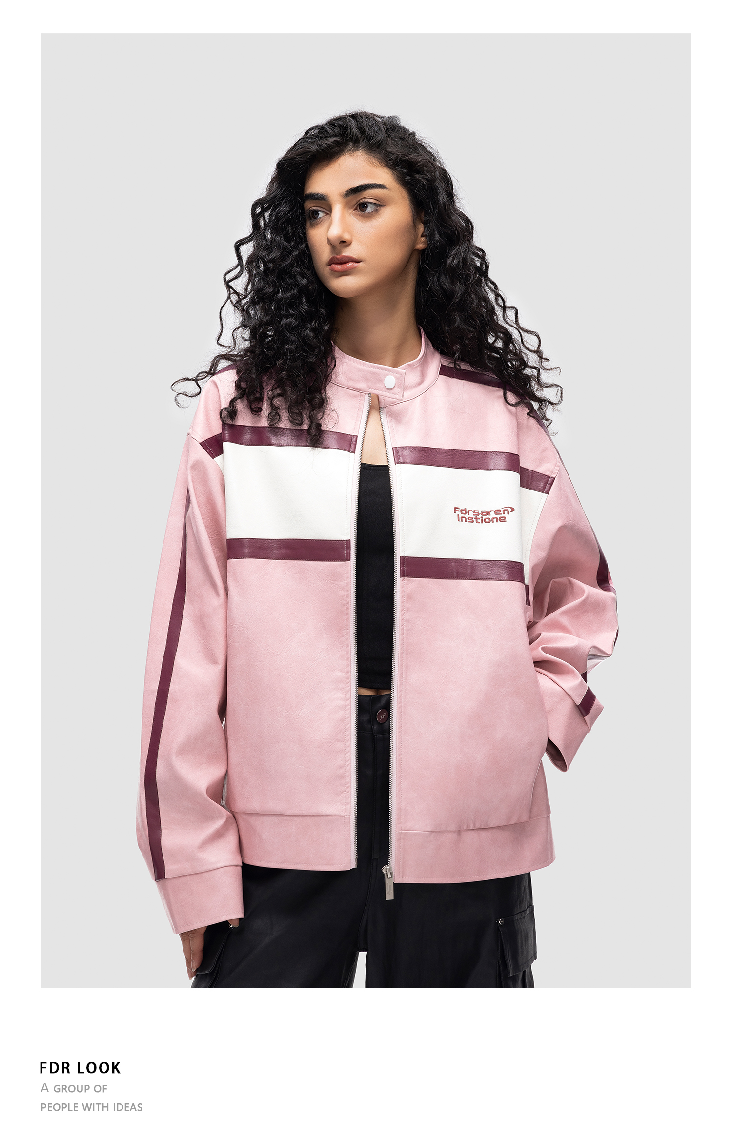 FDR官方店 国潮新款拼接撞色皮夹克女秋季美式潮牌外套宽松上衣