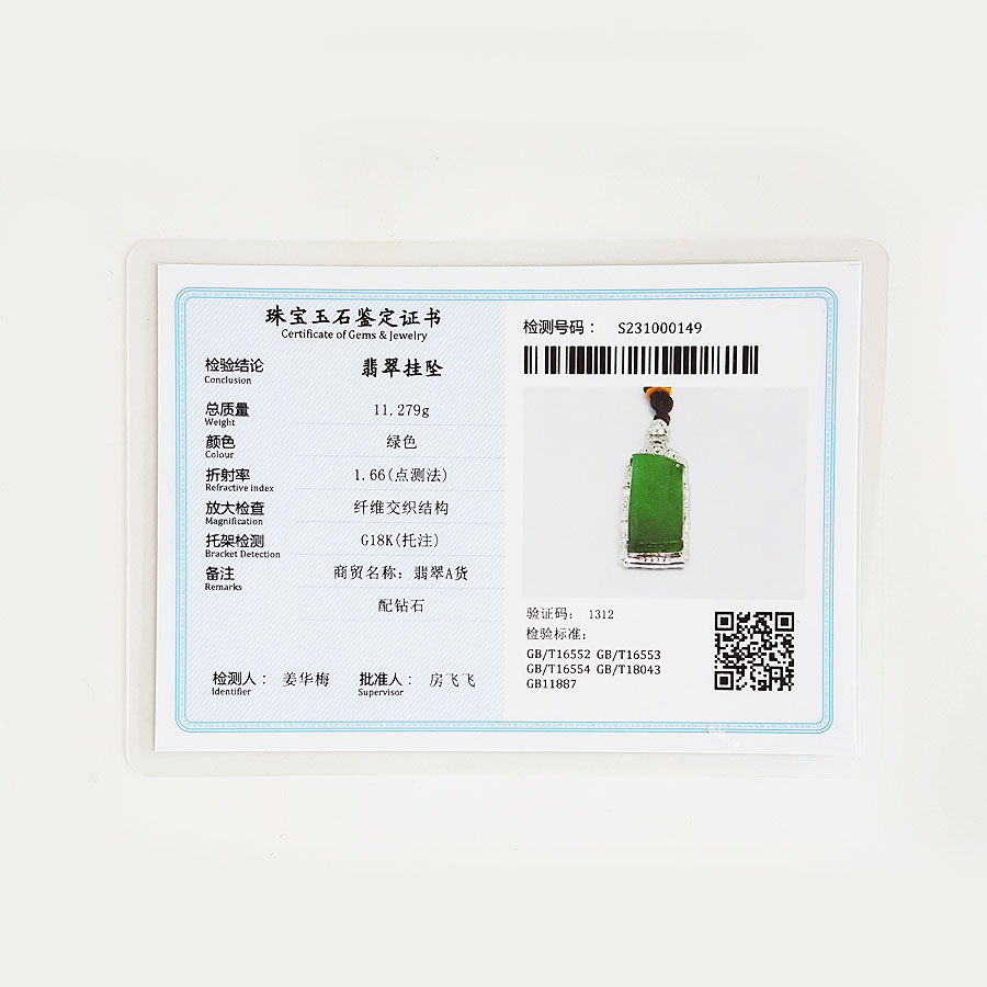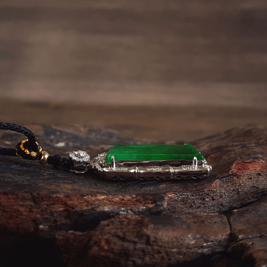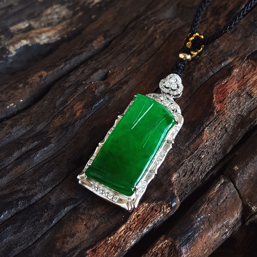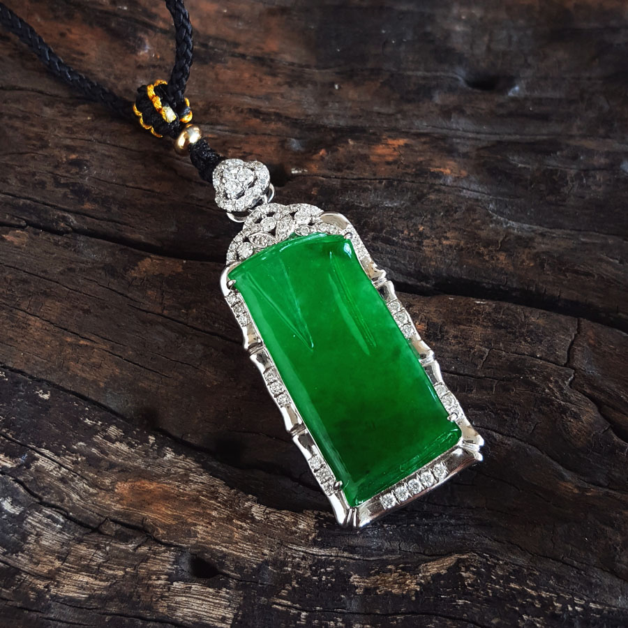 名称 | AU750收藏级白金镶钻镶天然细腻糯冰种满绿平安无事牌翡翠吊坠项链 |