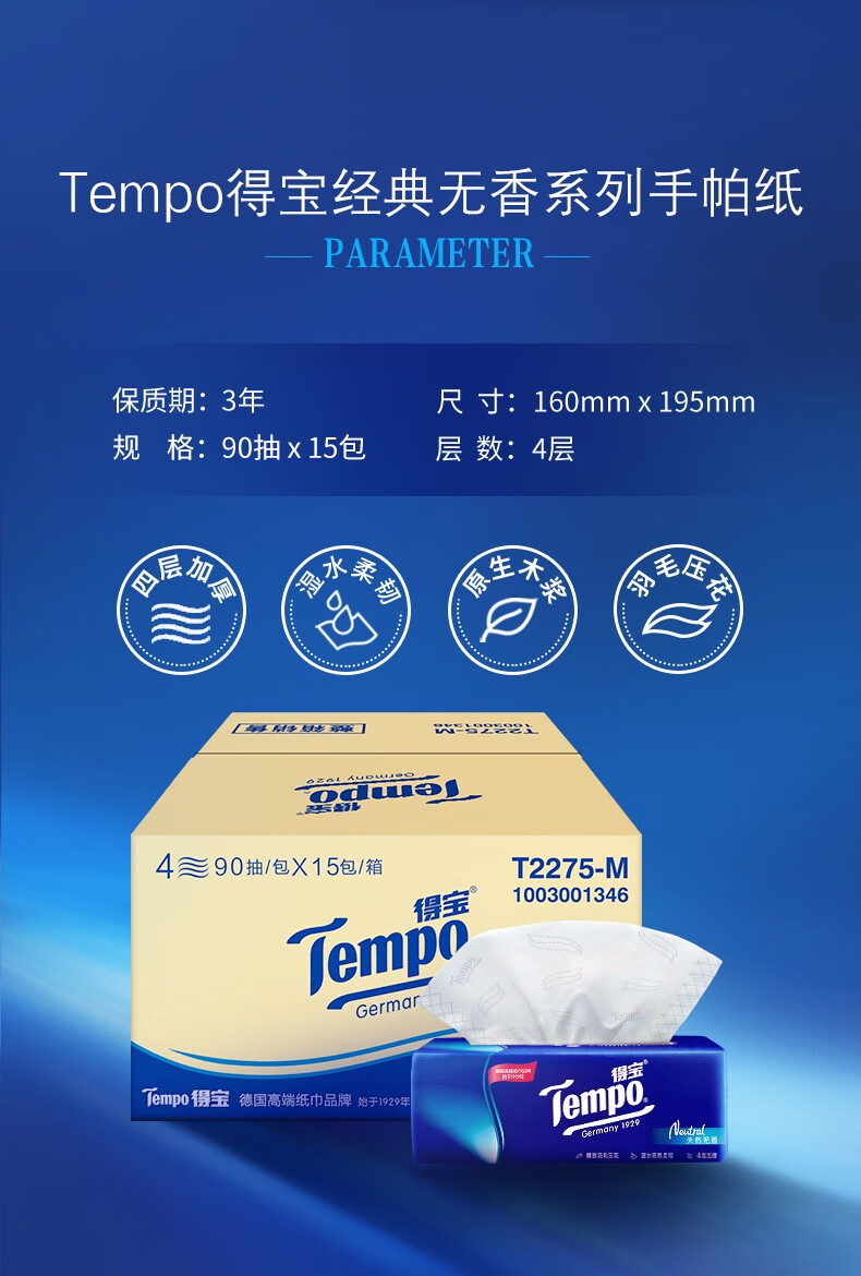 T2275-M 得宝90抽4层(天然无香)抽纸(1×15)装/箱 1箱 4层90抽x15包/箱 6901236358962
