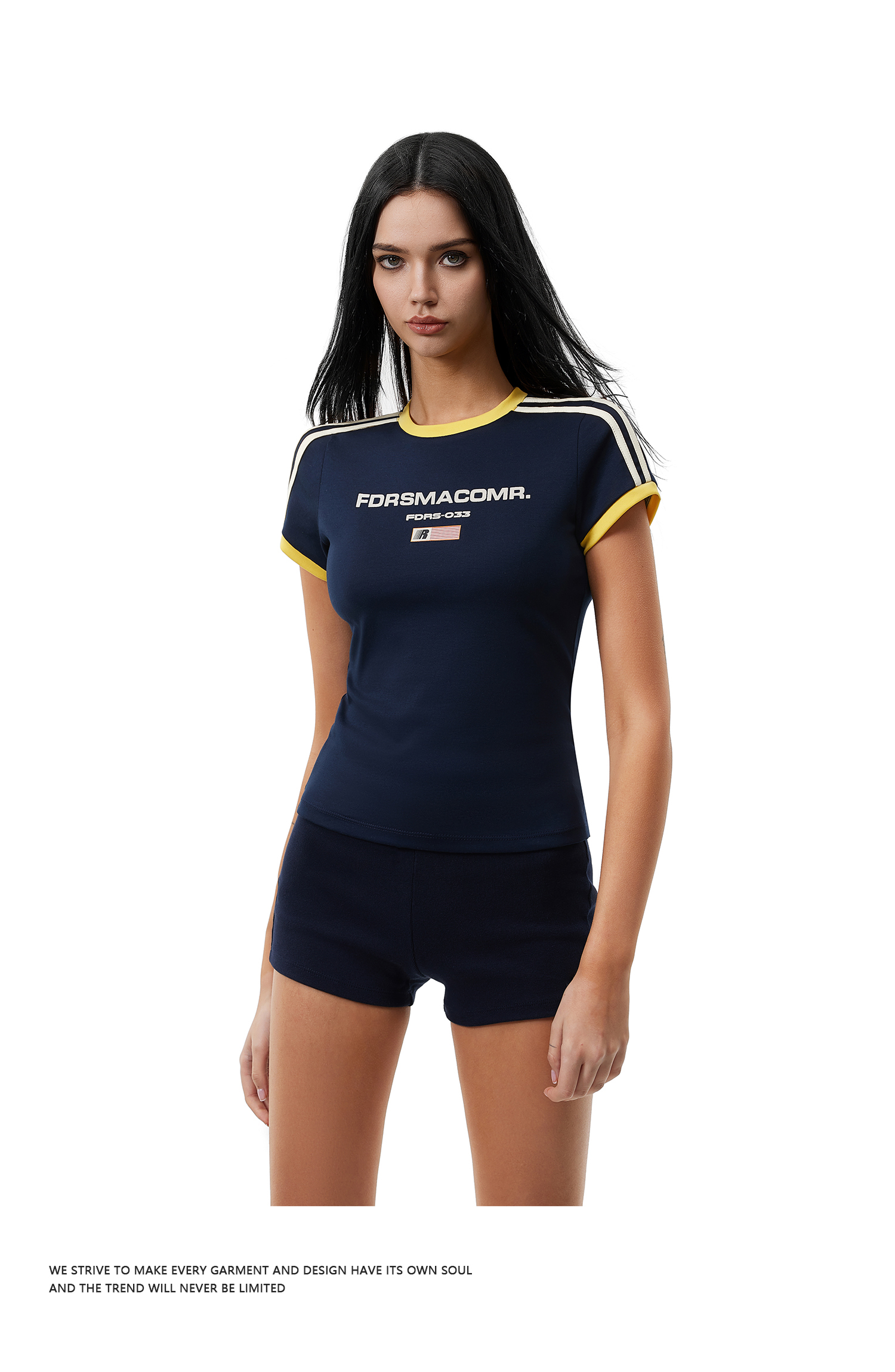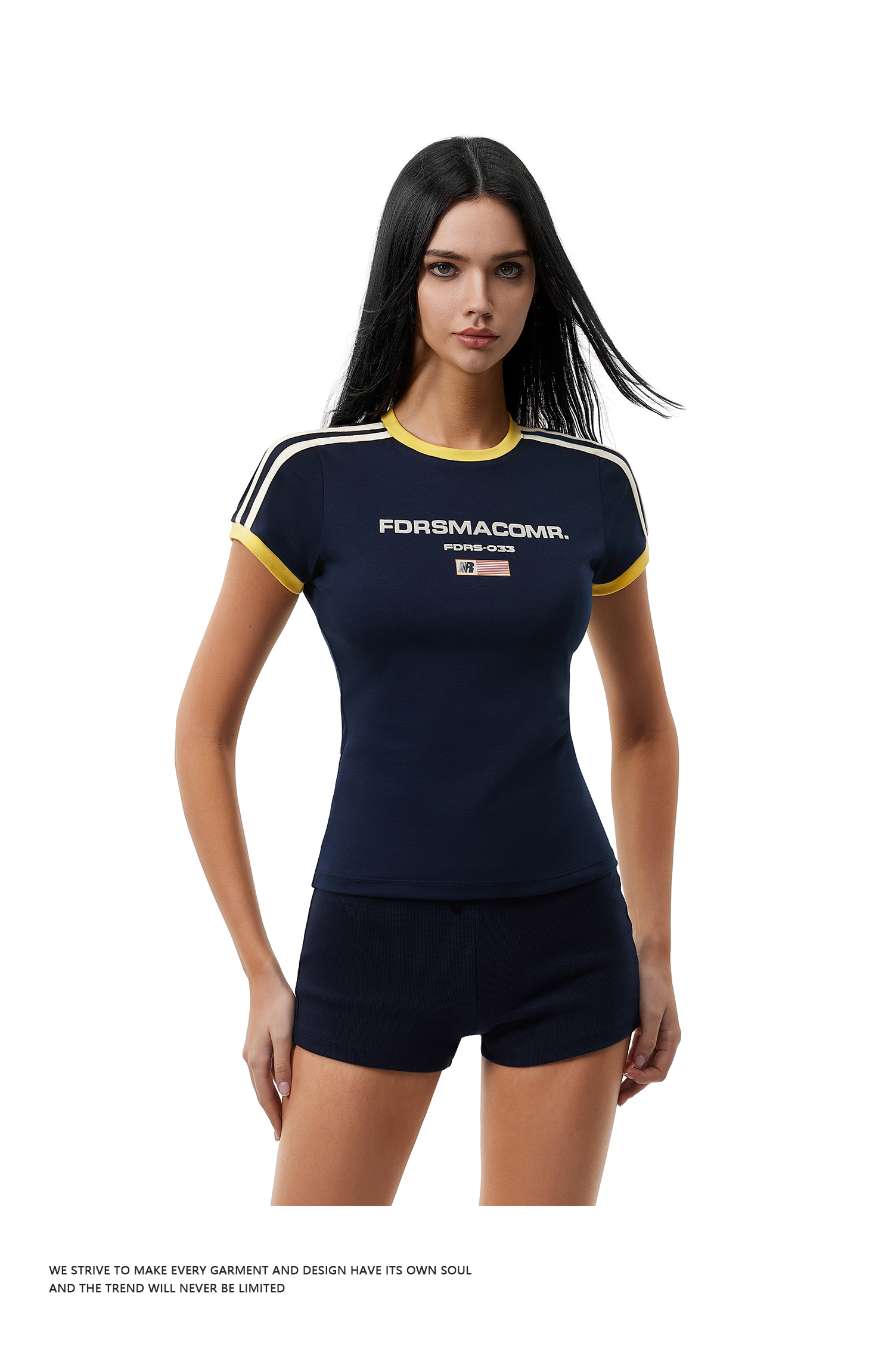 FDR官方店 旗帜印花织带撞色辣妹短袖女夏季运动t恤修身显瘦上衣