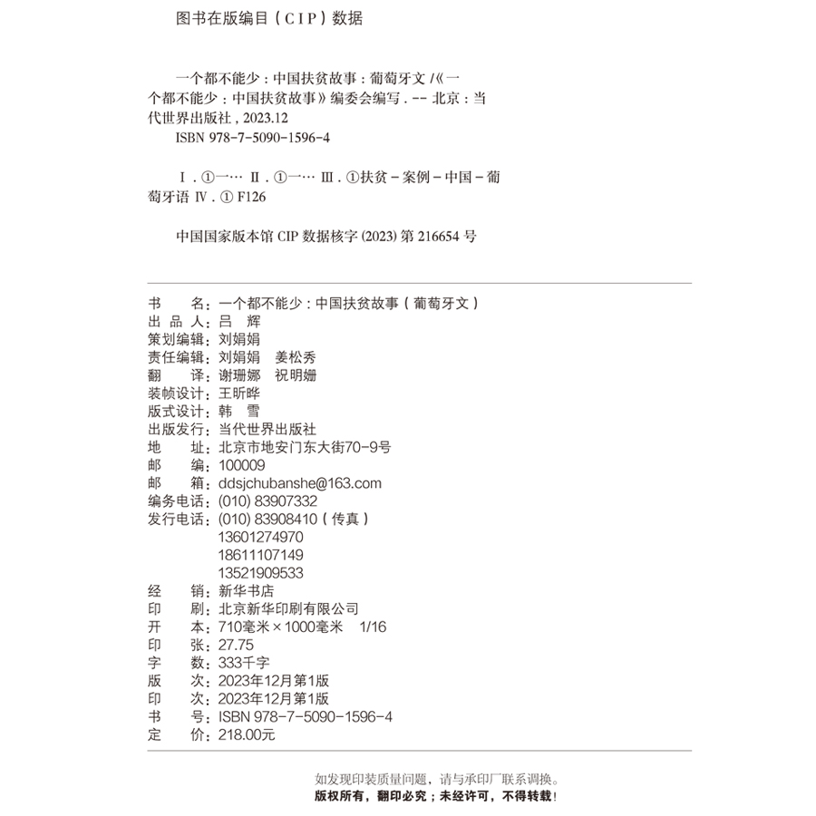 《一个都不能少:中国扶贫故事》葡文版为《一个都不能少:中国扶贫故事》多语种版之一,其中文版和英文版已于2020年3月出版。本书以脱贫攻坚为主题,讲述了十八洞村、阜平县等21个地方精准扶贫的生动故事,聚焦式展示了产业扶贫、就业扶贫等中国特色扶贫模式,全景式展现了我国的大扶贫格局。葡文译本的出版旨在向广大葡语国家和地区分享中国特色扶贫的宝贵经验,为国际减贫事业贡献中国智慧、中国方案。