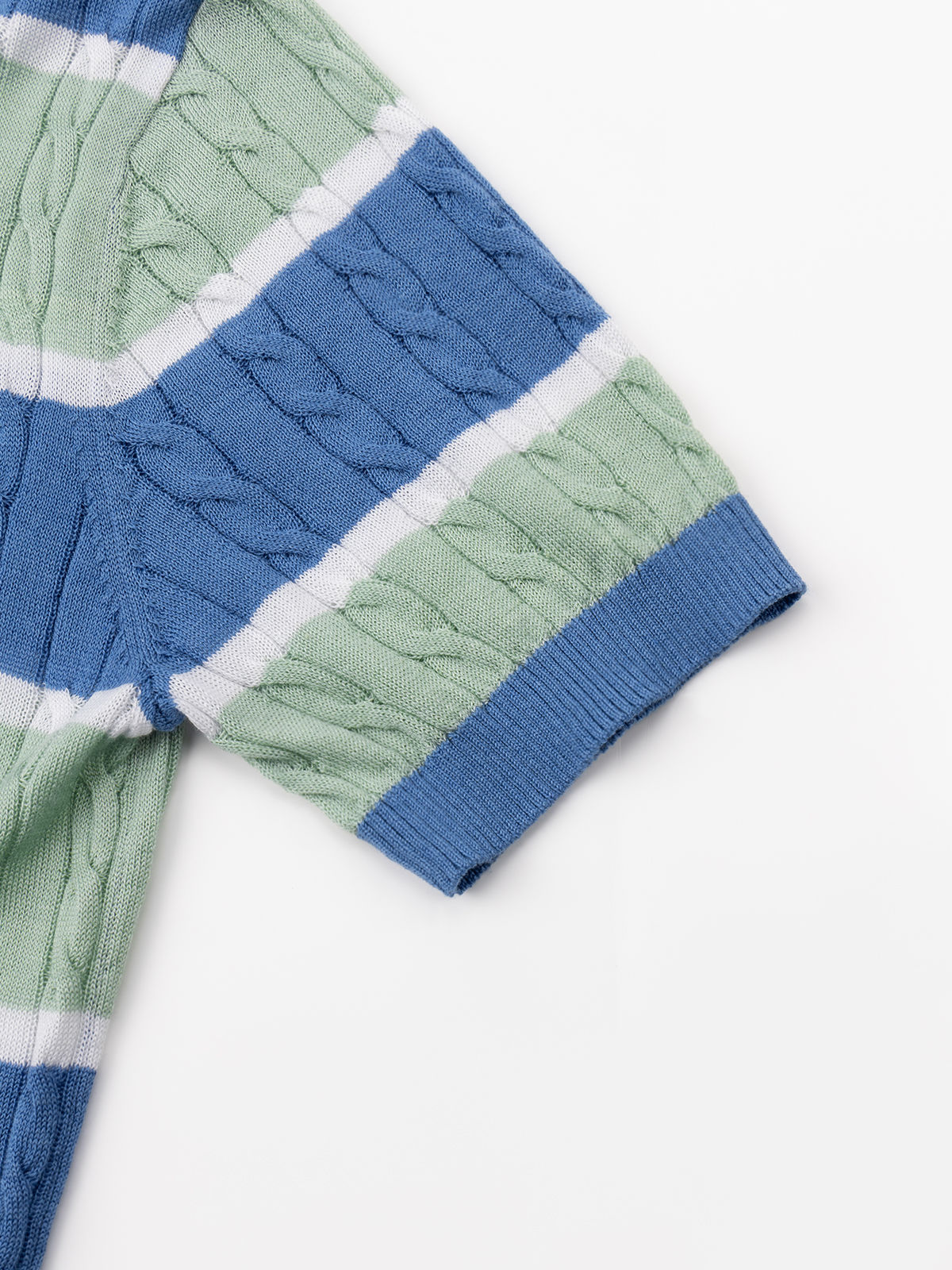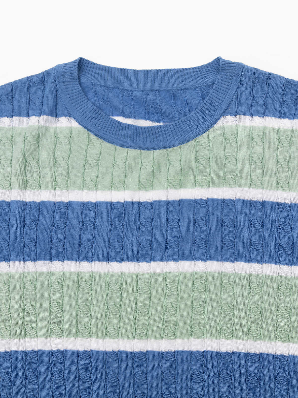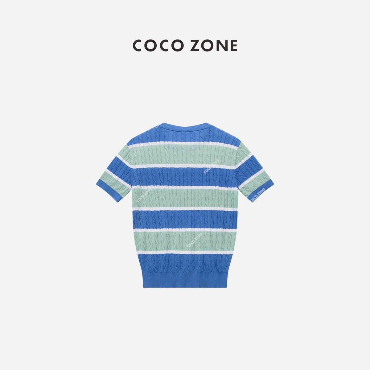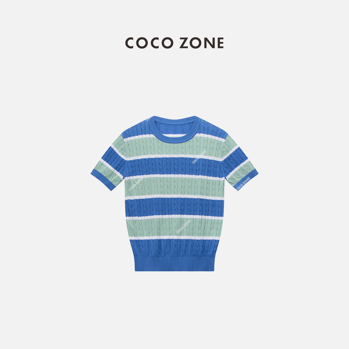 COCO ZONE莱塞尔棉混纺拼色条纹短袖针织衫气质圆领上衣CC1B0900