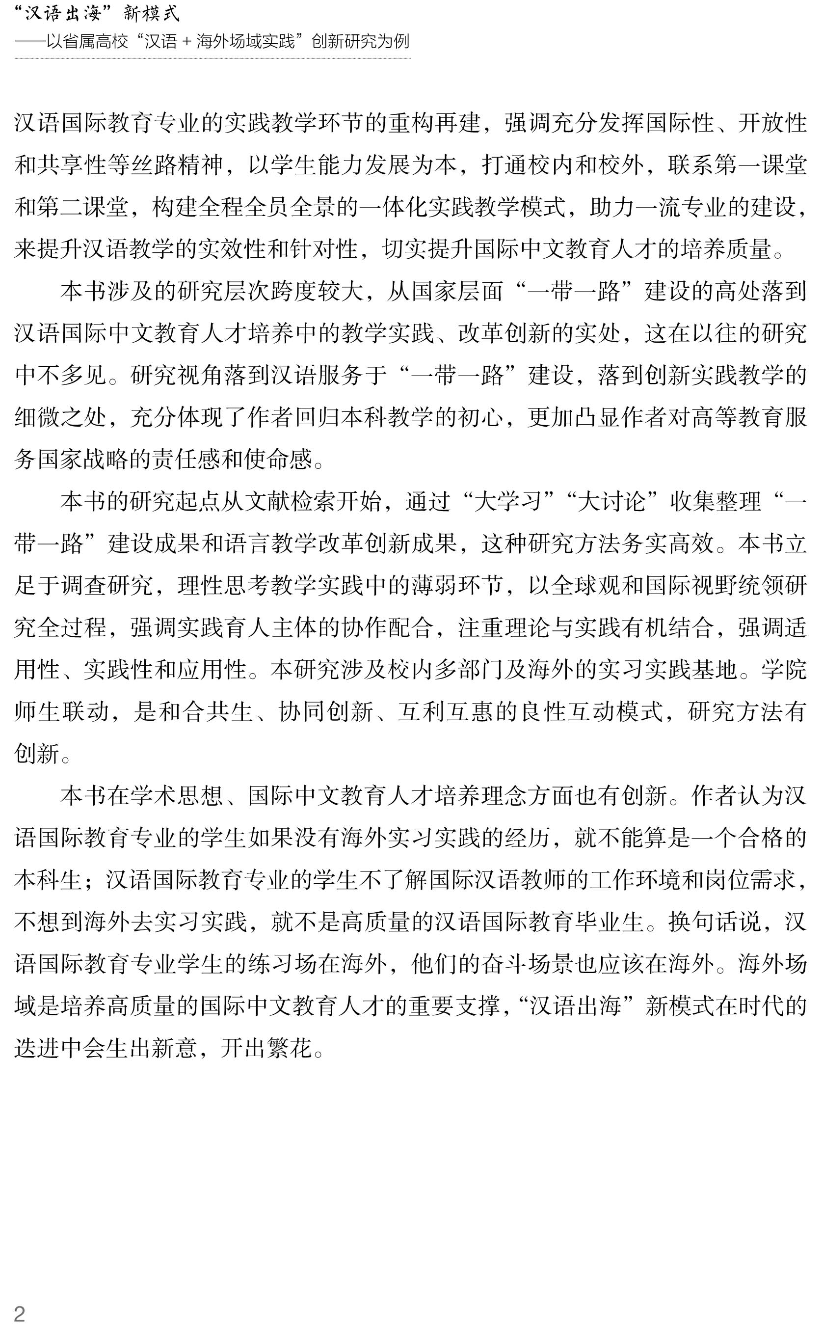 该书立足教育国际化与学校教育模式创新研究,立足四川省省属高校的实际情况,着眼于“一带一路”倡议,借助2020年四川省“开放发展”重点工作给汉语国际教育专业在新文科建设中带来新的机遇,研究在以学科专业知识传授为核心的传统培养模式向以实践能力培养为内核的新的人才培养模式的变革中,汉语国际教育专业实践教学环节的重构。研究表明,汉语国际教学充分发挥国际性、开放性和共享性等丝路精神,以学生能力发展为本,打通校内和校外,联结第一课堂和第二课堂,构建全程全员全景的一体化实践教学模式,助力一流专业的建设,助力治蜀兴川,助力四川省高水平对外开放。