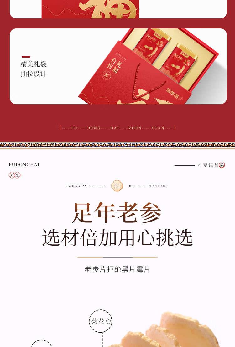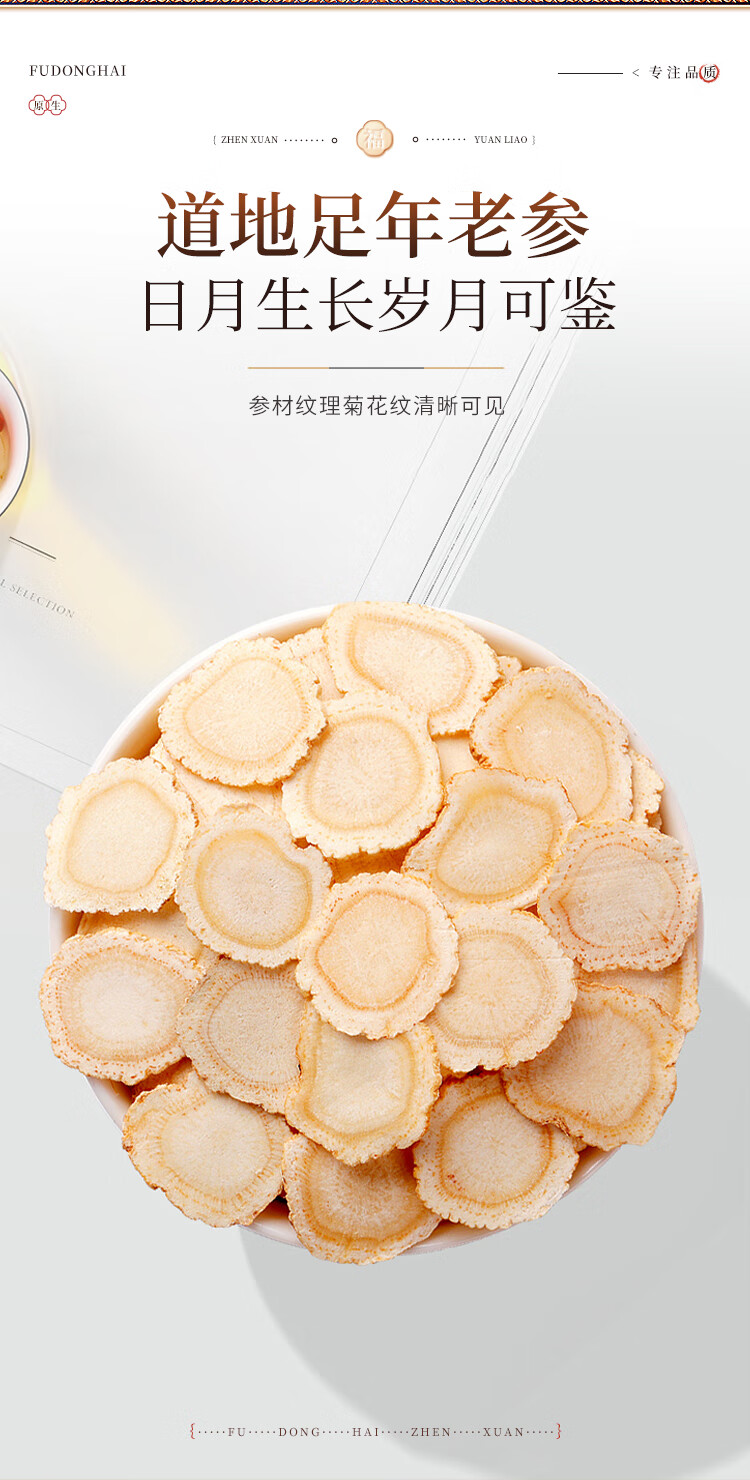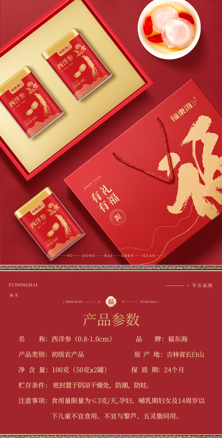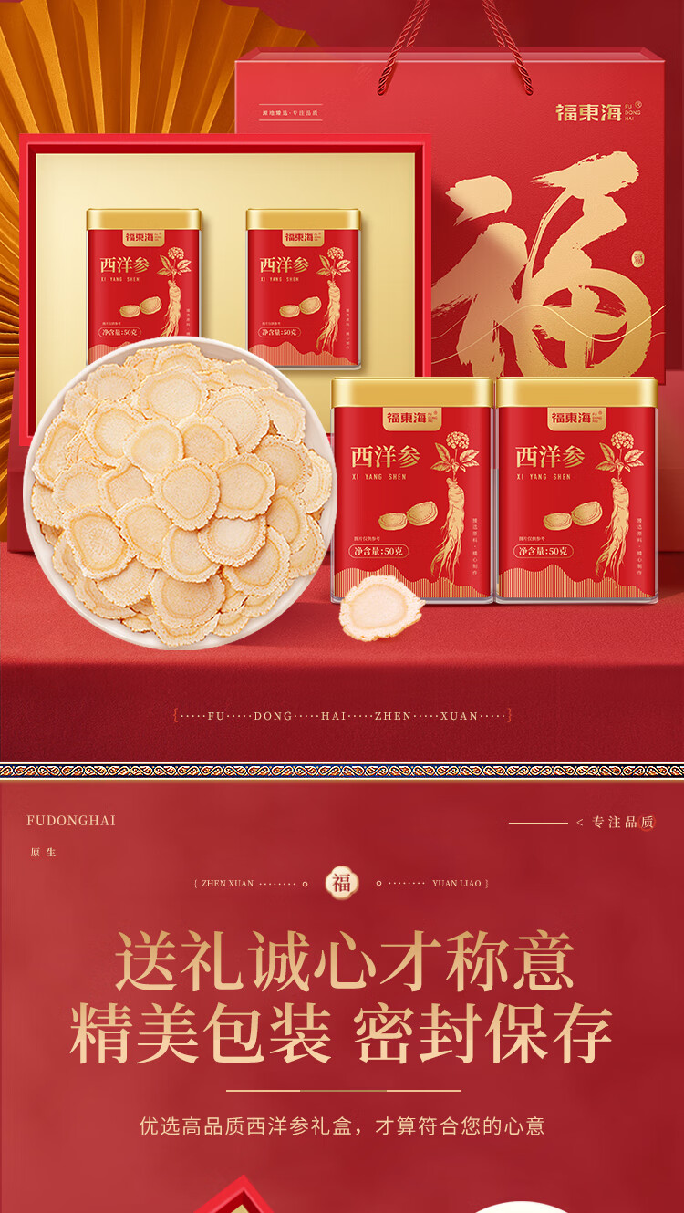 福东海 西洋参片100克(约1.0-1.2cm)花旗参片长白山人参皂苷 礼盒装