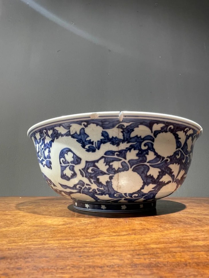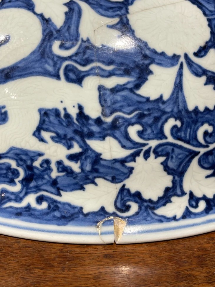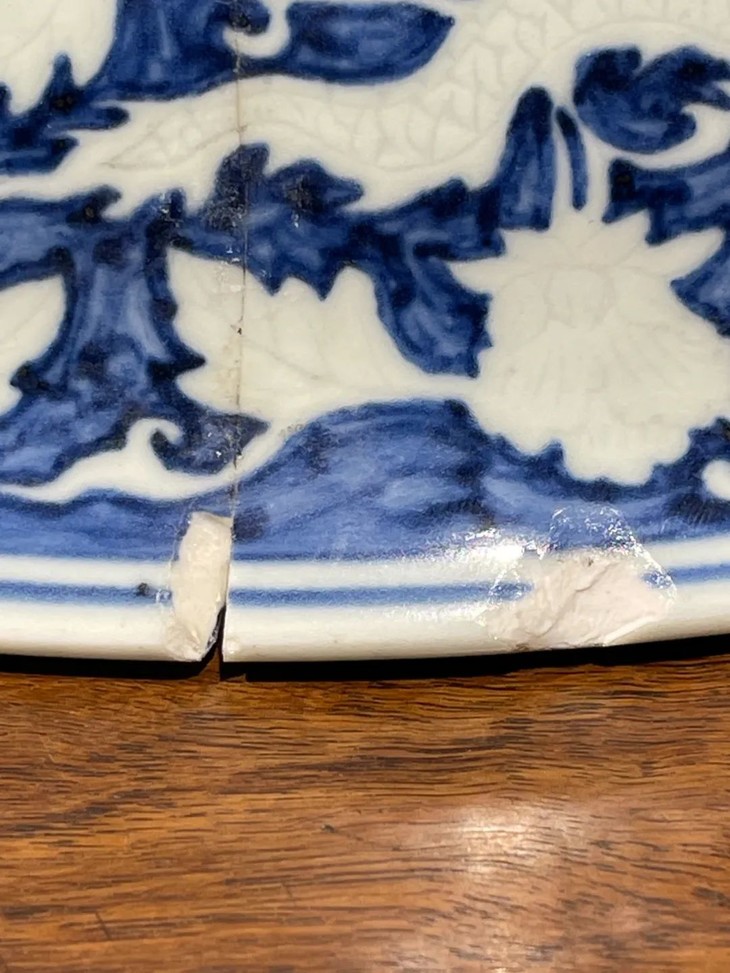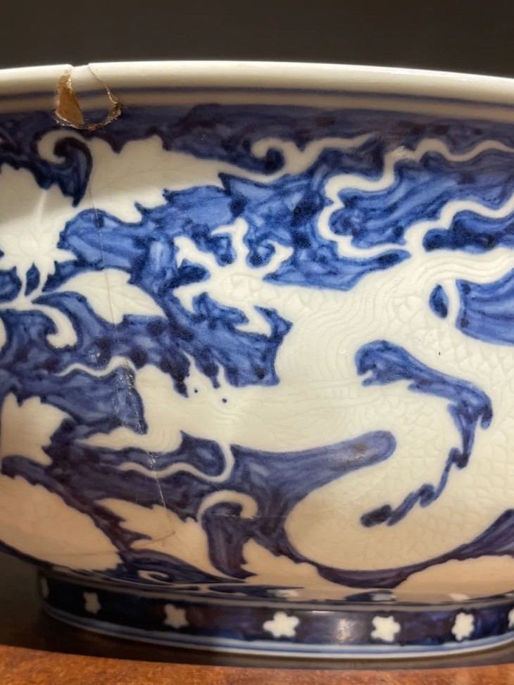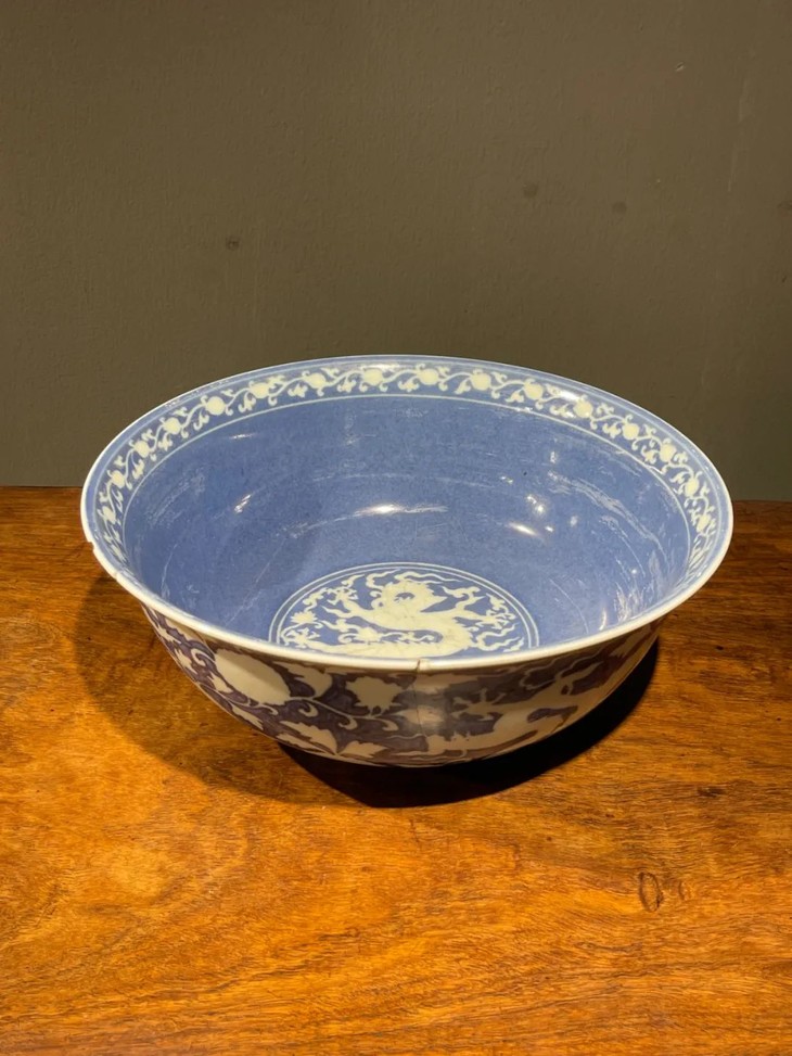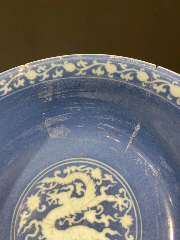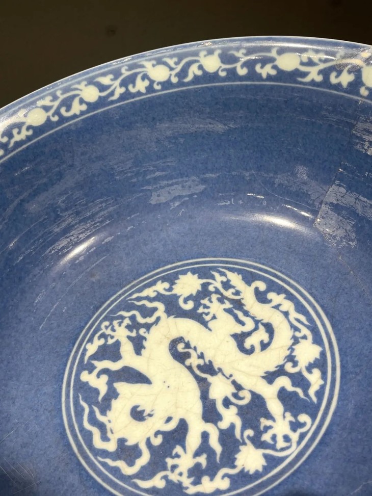 此刷蓝地拔白龙凤花卉纹大碗如图所示有一处有明显的断裂痕与关连的口沿小磕伤,经精心黏着修复,除此之外,全器保存完好。表面覆有温润之包浆皮壳。