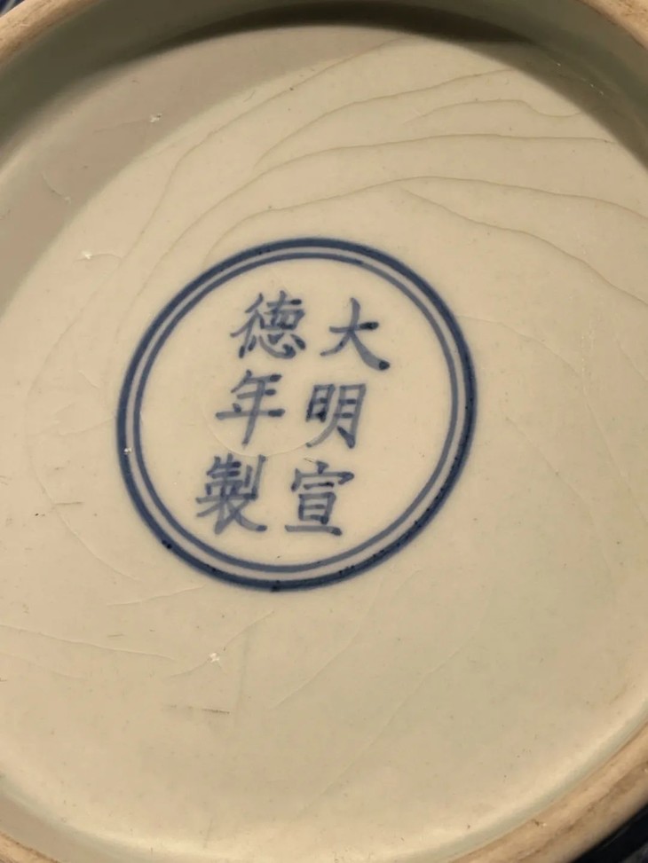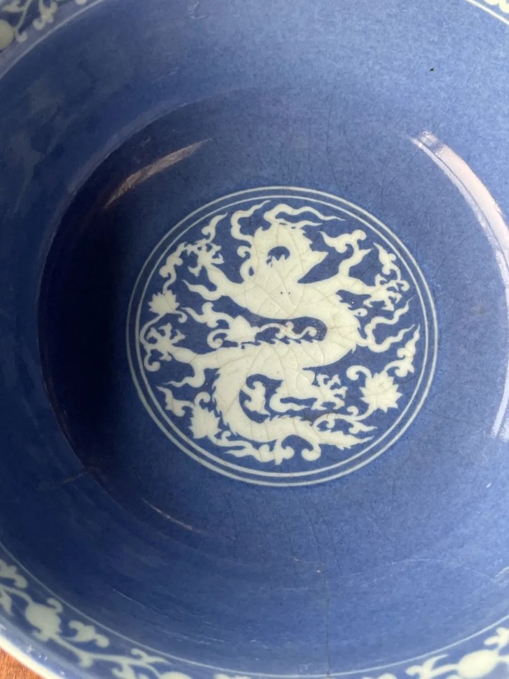 以进口之高品质苏麻离青钴蓝料刷成纹饰底色的装饰技法,昂贵画青花瓷的钴蓝料为底色釉,由于钴蓝材料贵重,高温烧造废品率高,因此这件碩大刷蓝地大碗,使用如此多钴蓝釉料,其烧造费用之昂贵可见一斑。