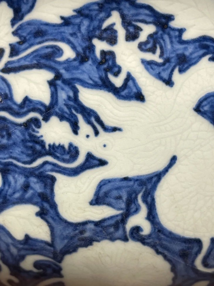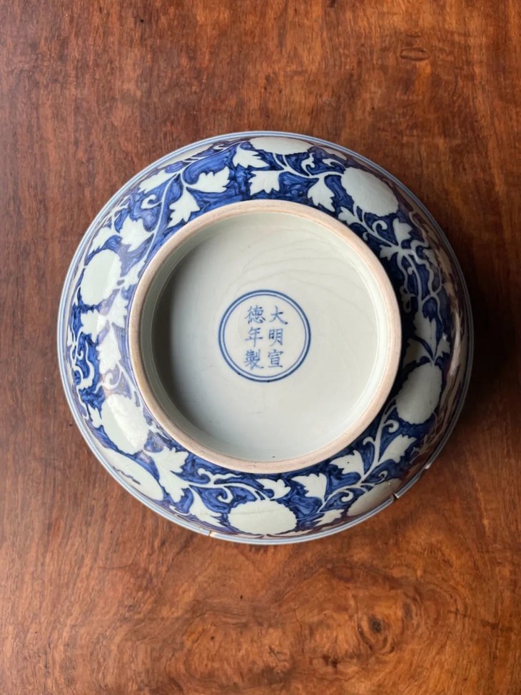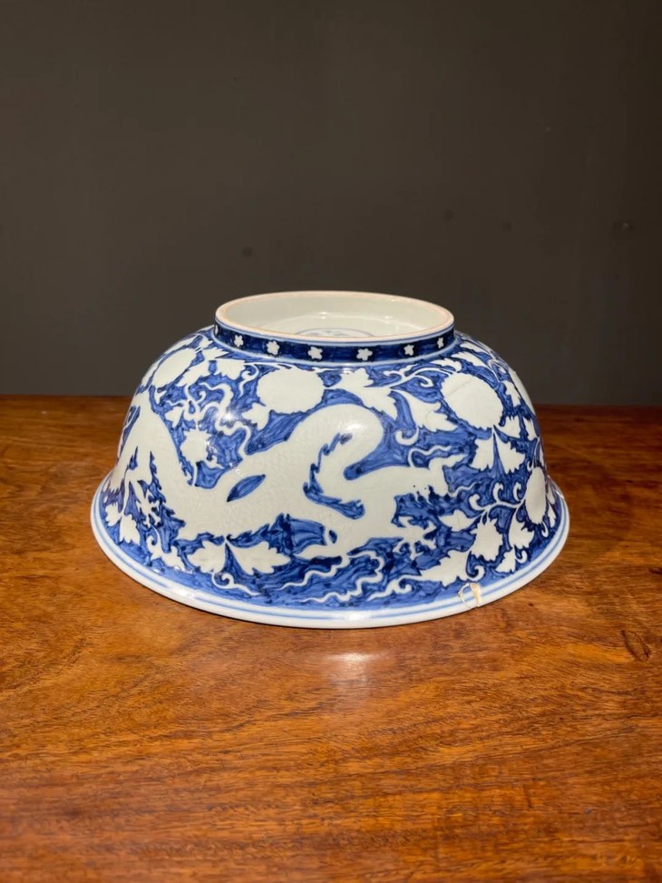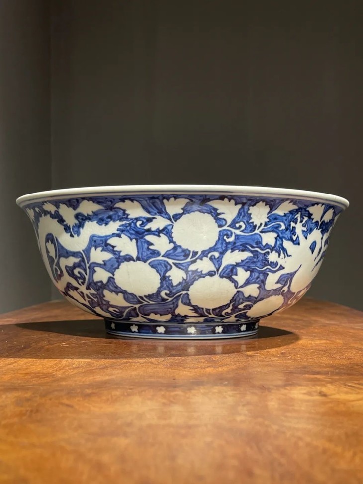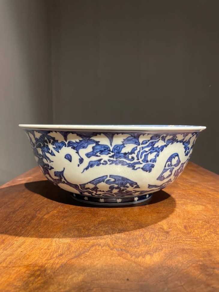 此大瓷碗以明代早期偶见的刷蓝地拔白装饰方式烧造而成,景德镇特有之洁白高岭土为胎,保留白色纹饰外,全器覆以刷蓝底色釉,硕大撇口大碗造型端庄大气,全器龙凤花卉纹饰刻划精緻生动,特显早明官窑瓷器特色,细节丰富流畅自然,高温刷蓝釉自然洒脱,以毛刷上色釉是早明御窑厂实验性的创新上釉工艺,流传后世的样品非常少,刷蓝底白花构图及纹饰刻划细节搭配得一丝不苟,底部白釉以青花书写“大明宣德年製”年款,近距离观赏令人赞叹,是景德镇传统瓷器技艺的结晶。