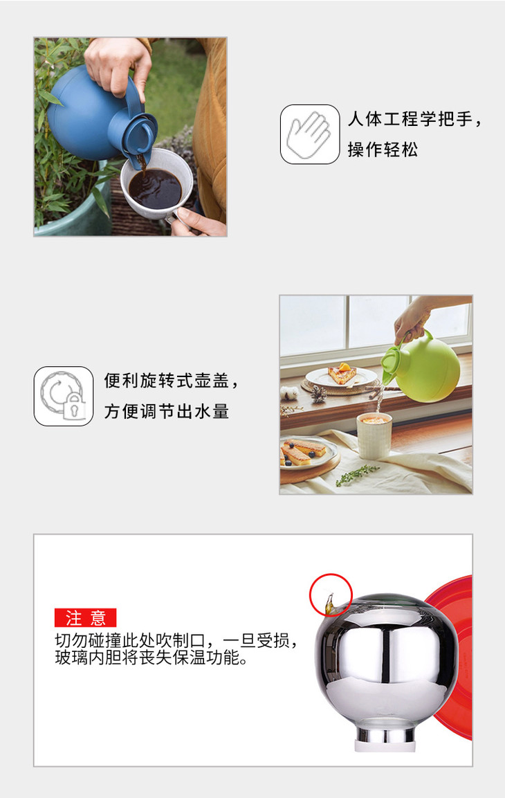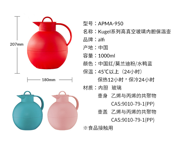 我妈用了都想背回杭州去的保温壶,Alfi的kugel系列,高真空玻璃内胆,圆滚滚的球形,严丝合缝的旋转塞,尖尖小鸟嘴,非常可爱!而且除了放水,咖啡果汁都可以!