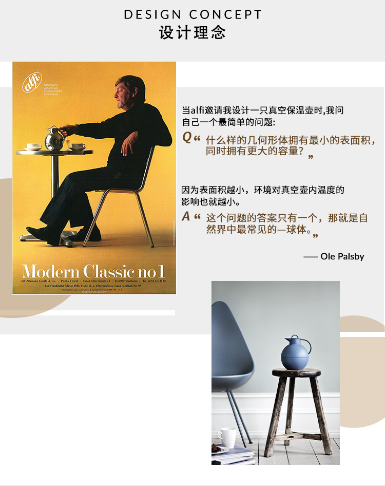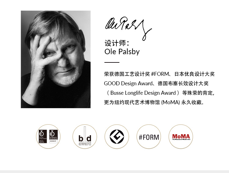 Kugel小圆球是Alfi的经典系列之一,也是首支设计师水壶款,诞生于1985年,由丹麦著名设计师Ole Palsby设计。作为丹麦设计界的传奇,他的每一个作品都包含了“TO THE NEED”的设计理念,充满设计感的同时,也非常实用,因此深受大众喜爱,并且在国际设计大奖中获得殊荣无数,是当代具有影响力及代表性的设计师之一。Kugel小圆球不仅获得了 Good Design Award、德国Busse长青设计奖、德国FORM等设计大奖,更为纽约现代艺术博物馆(MoMA) 所收藏。
