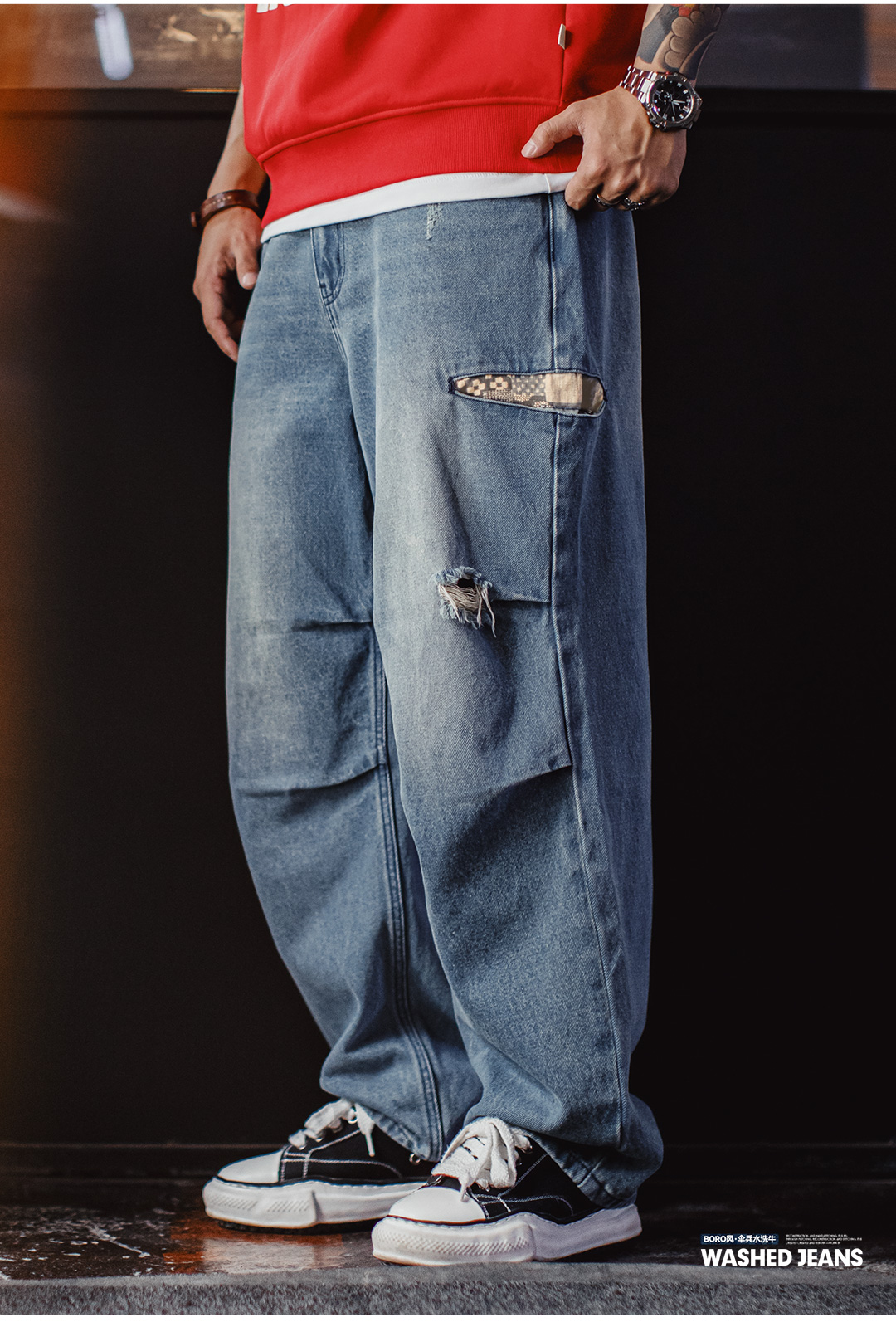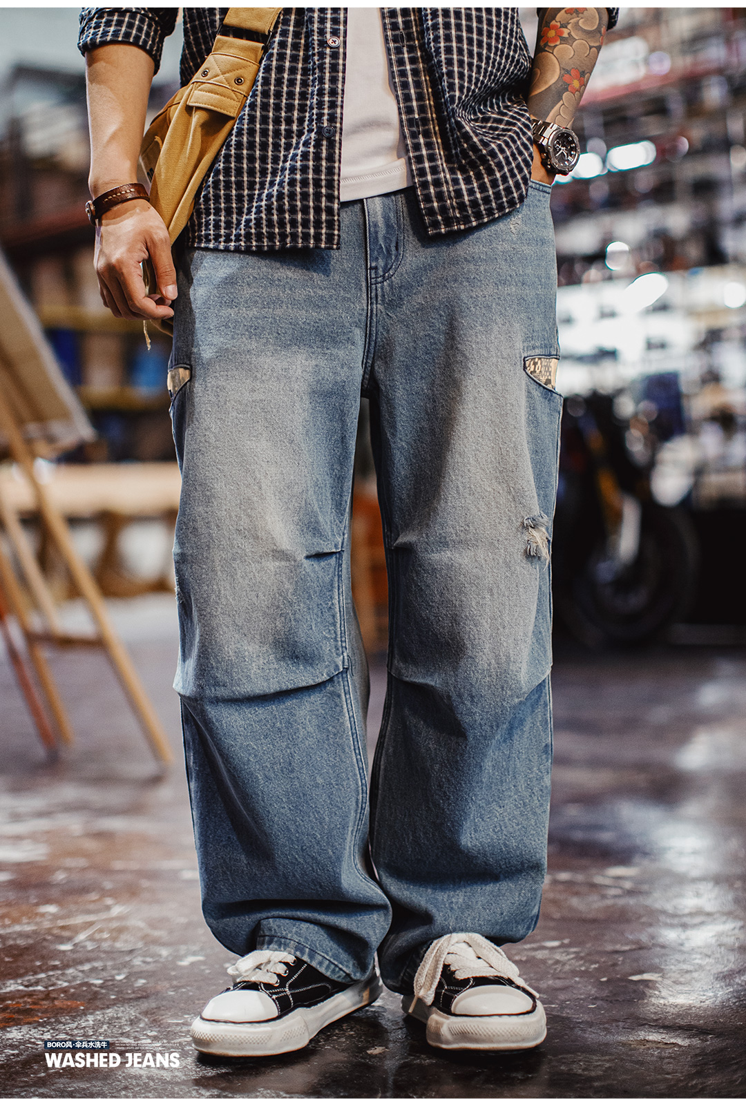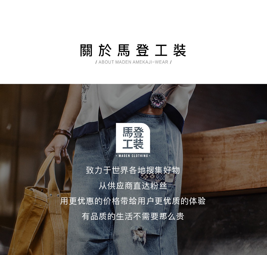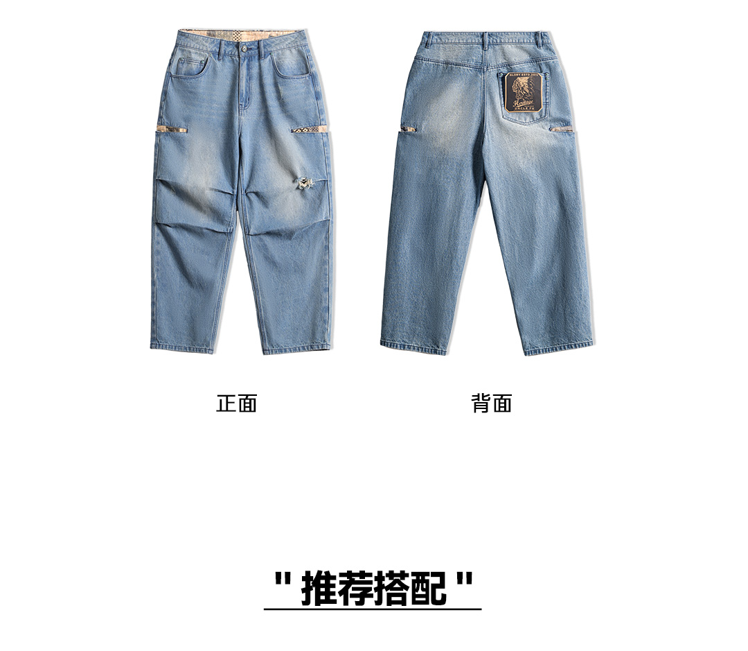马登工装美式复古阔腿宽松伞兵牛仔裤古布水洗破洞薄款休闲裤男春