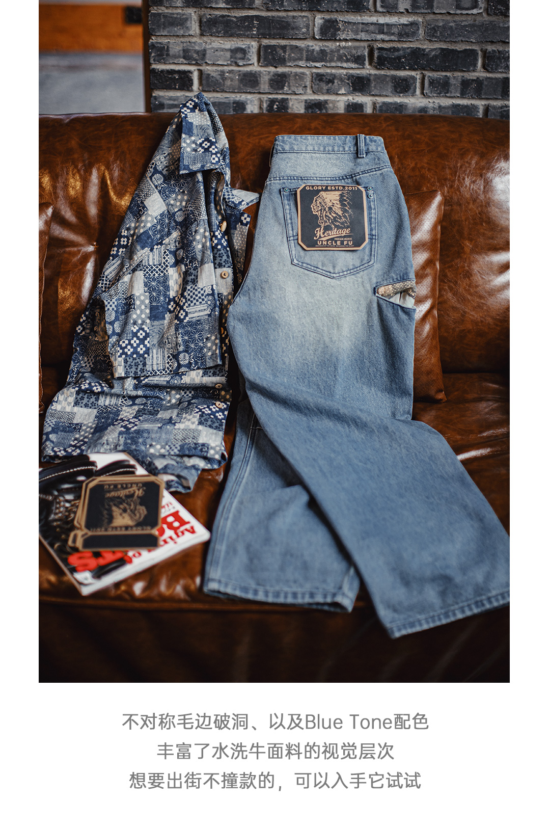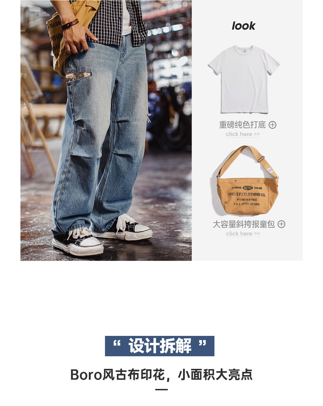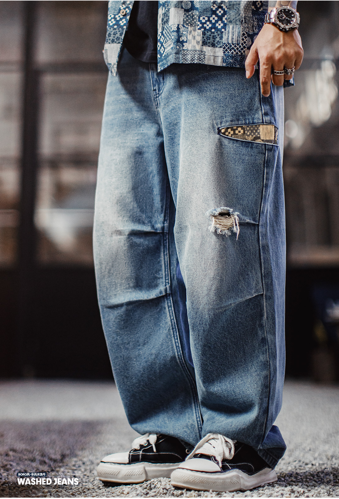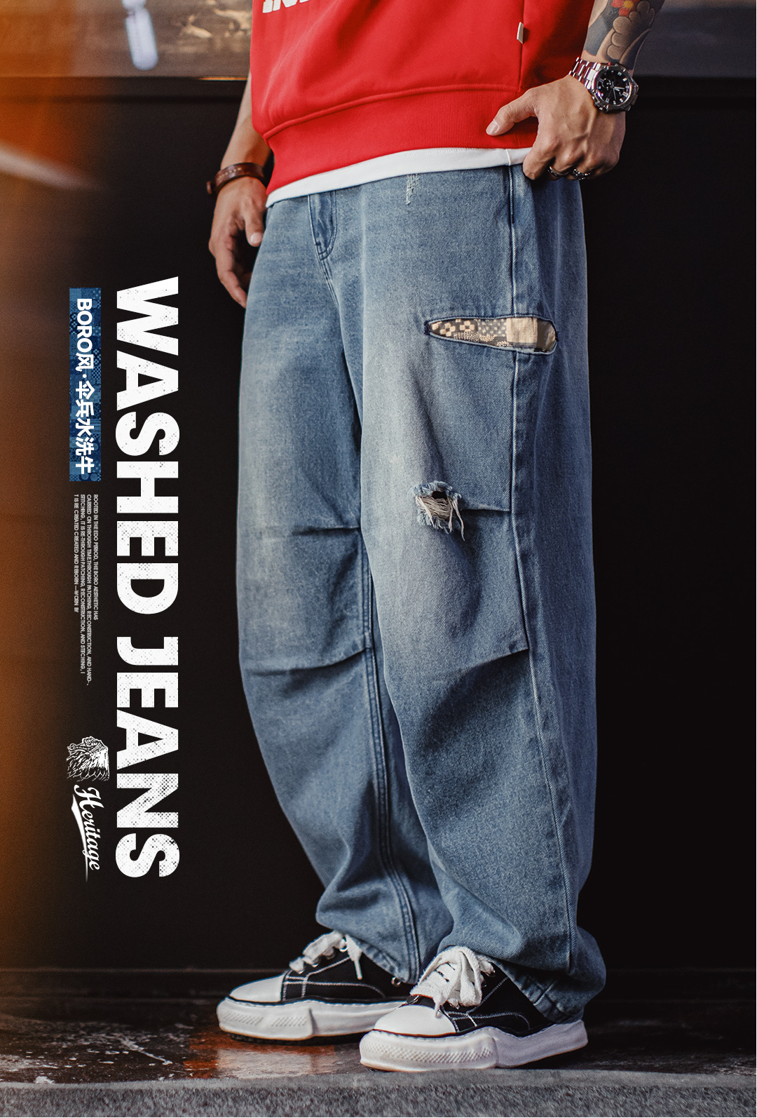 马登工装美式复古阔腿宽松伞兵牛仔裤古布水洗破洞薄款休闲裤男春