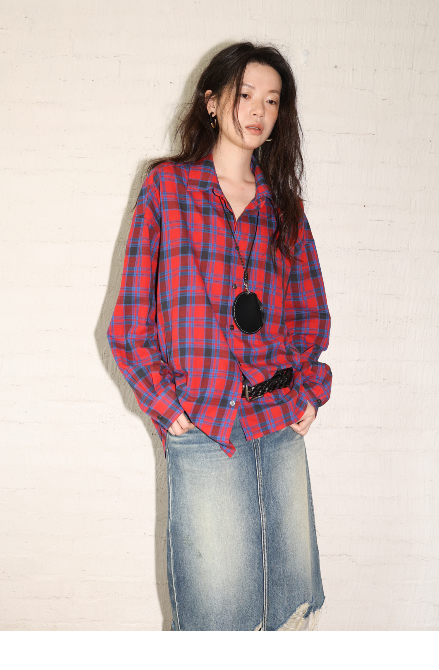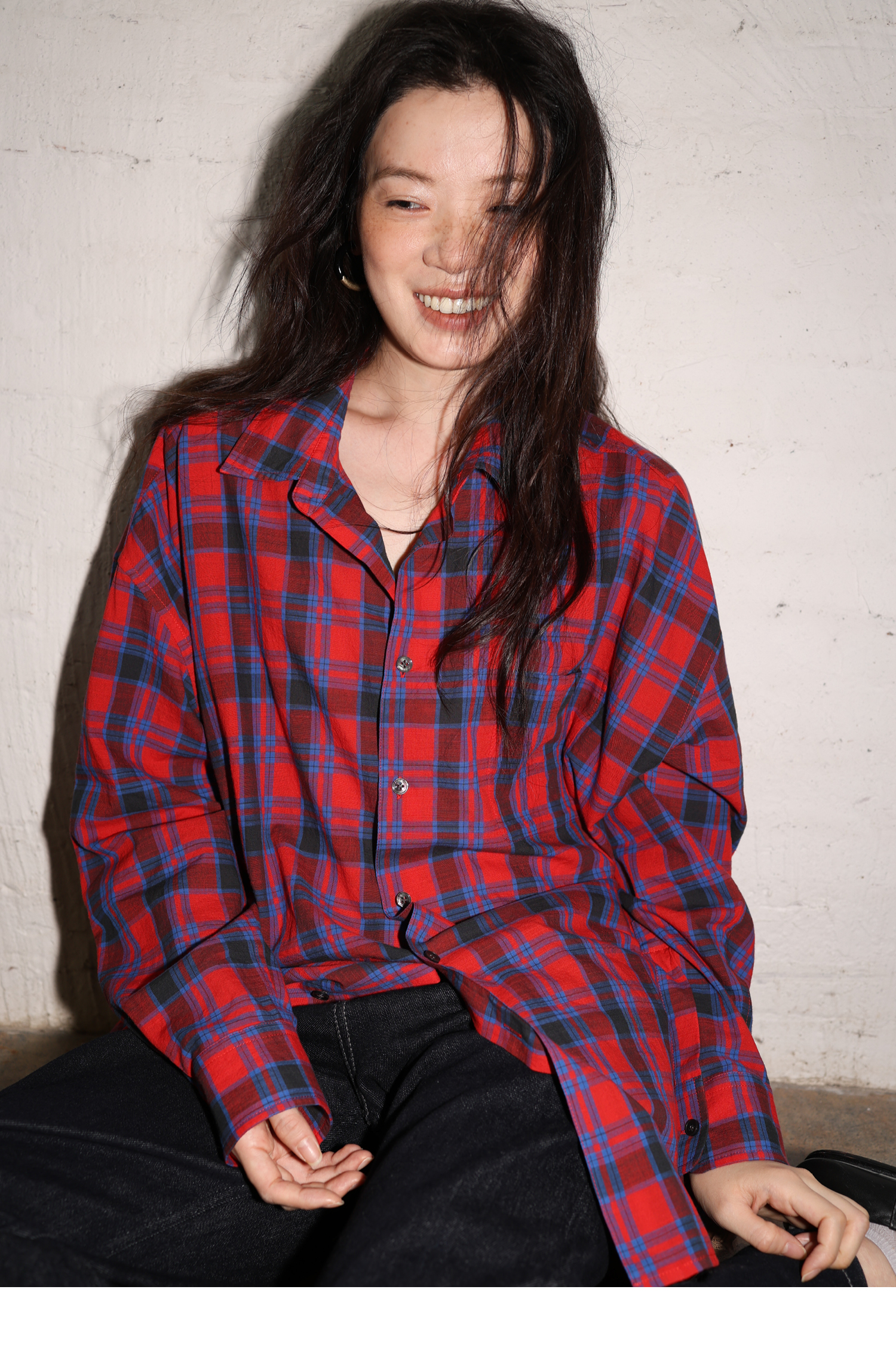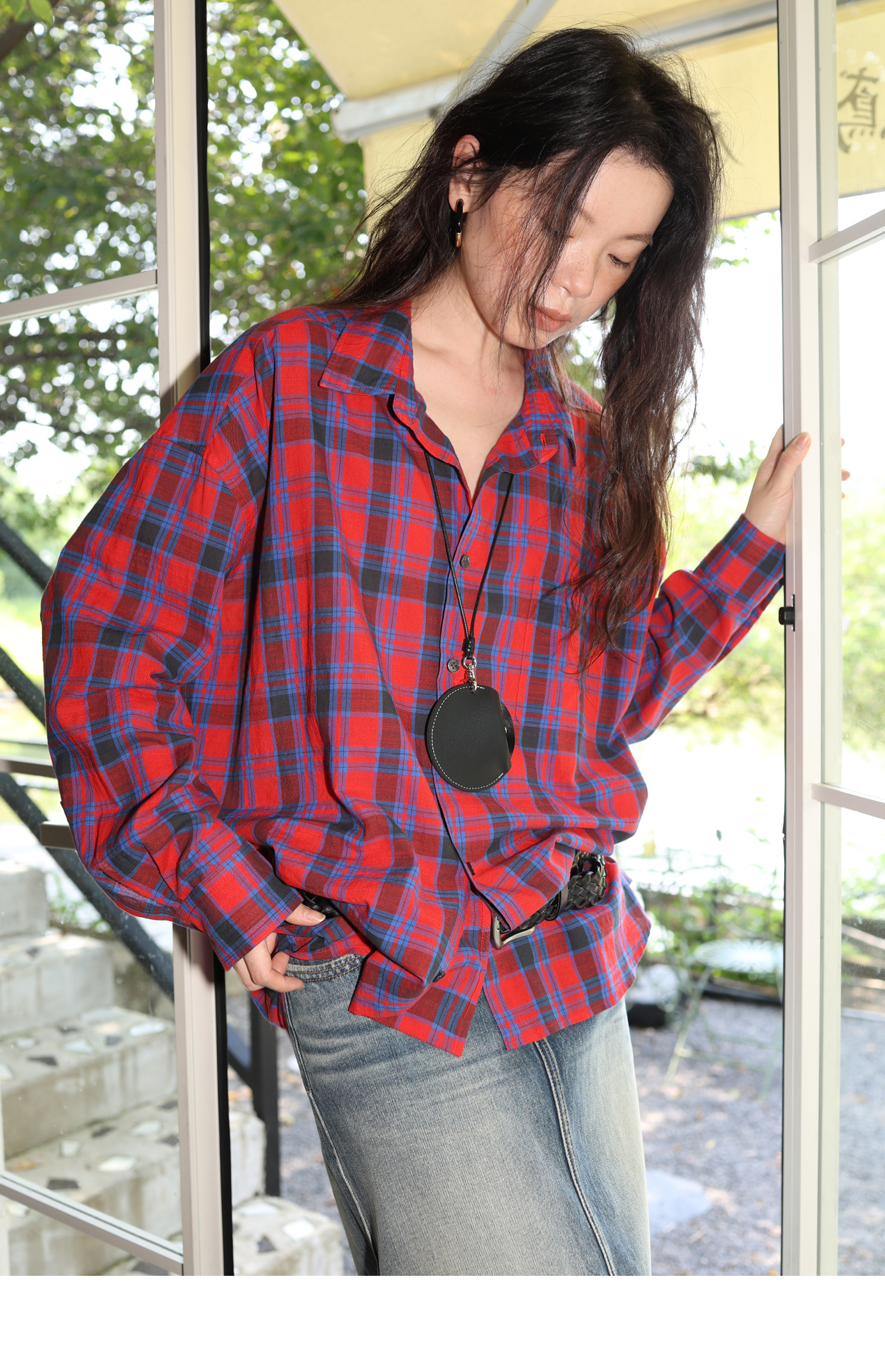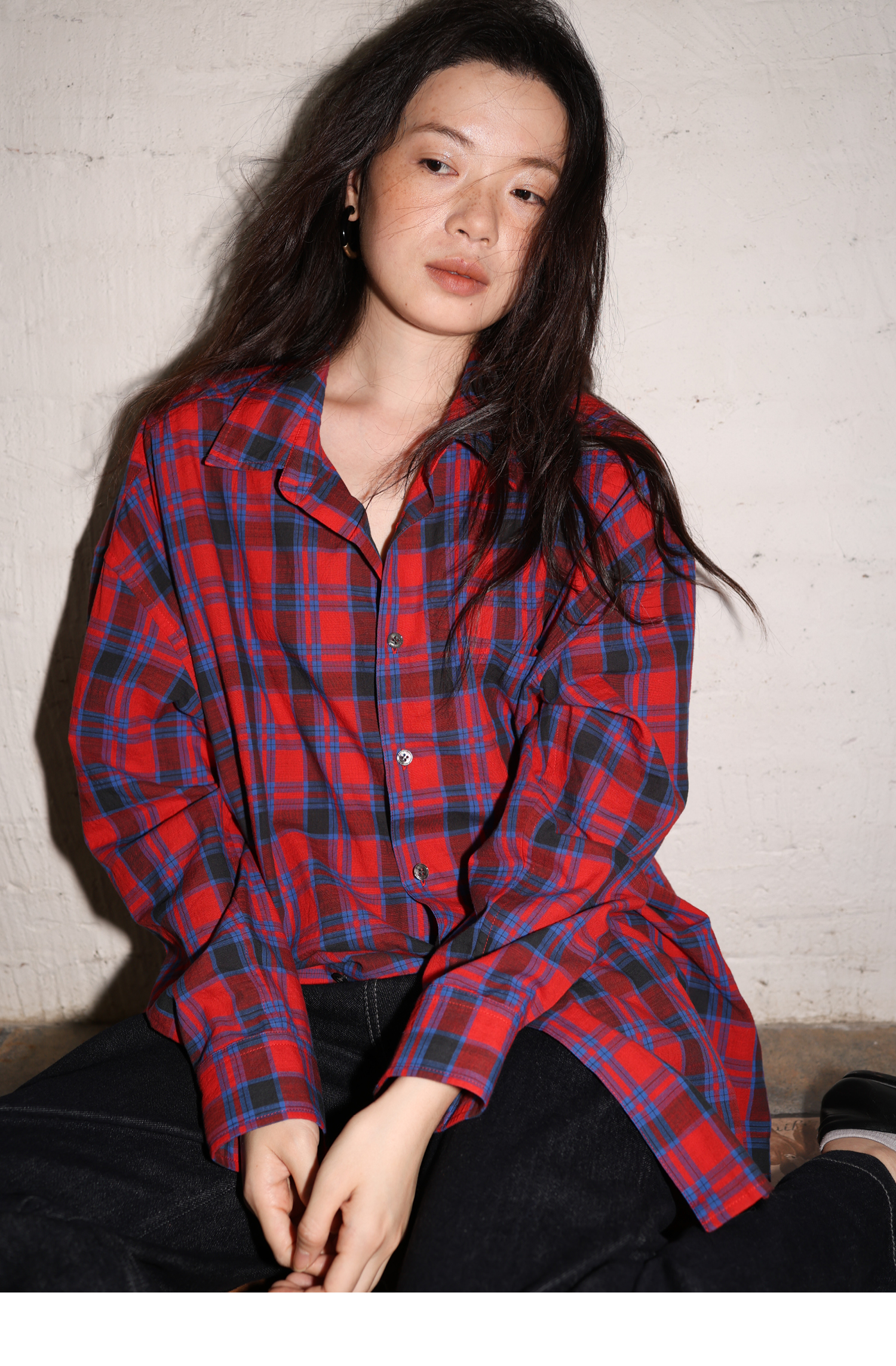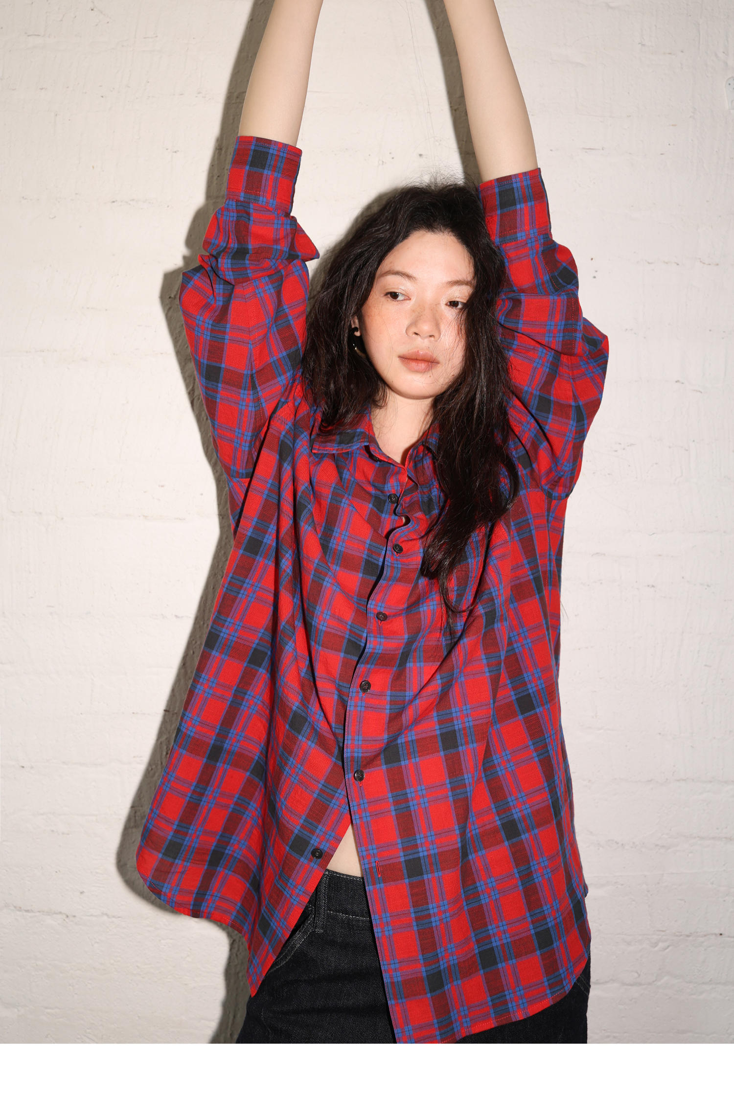 素舶 纯棉柔软舒适经典红格纹撞色翻领宽松复古松弛休闲衬衫上衣
